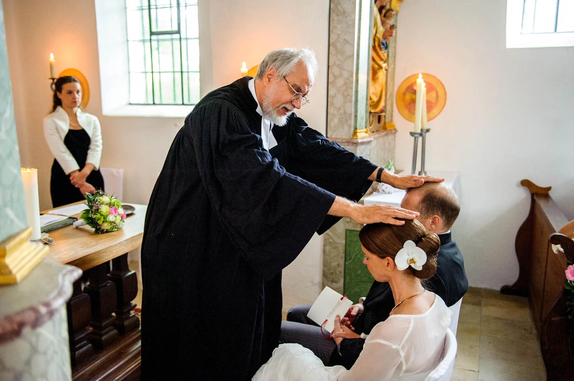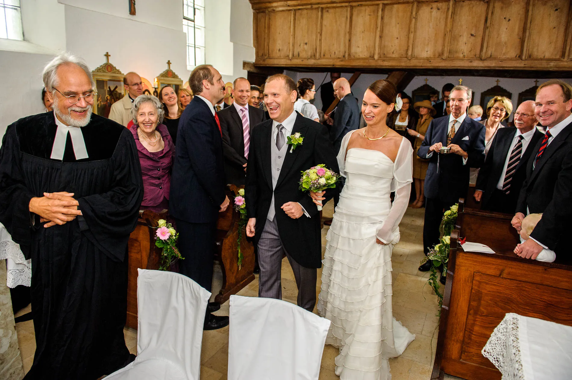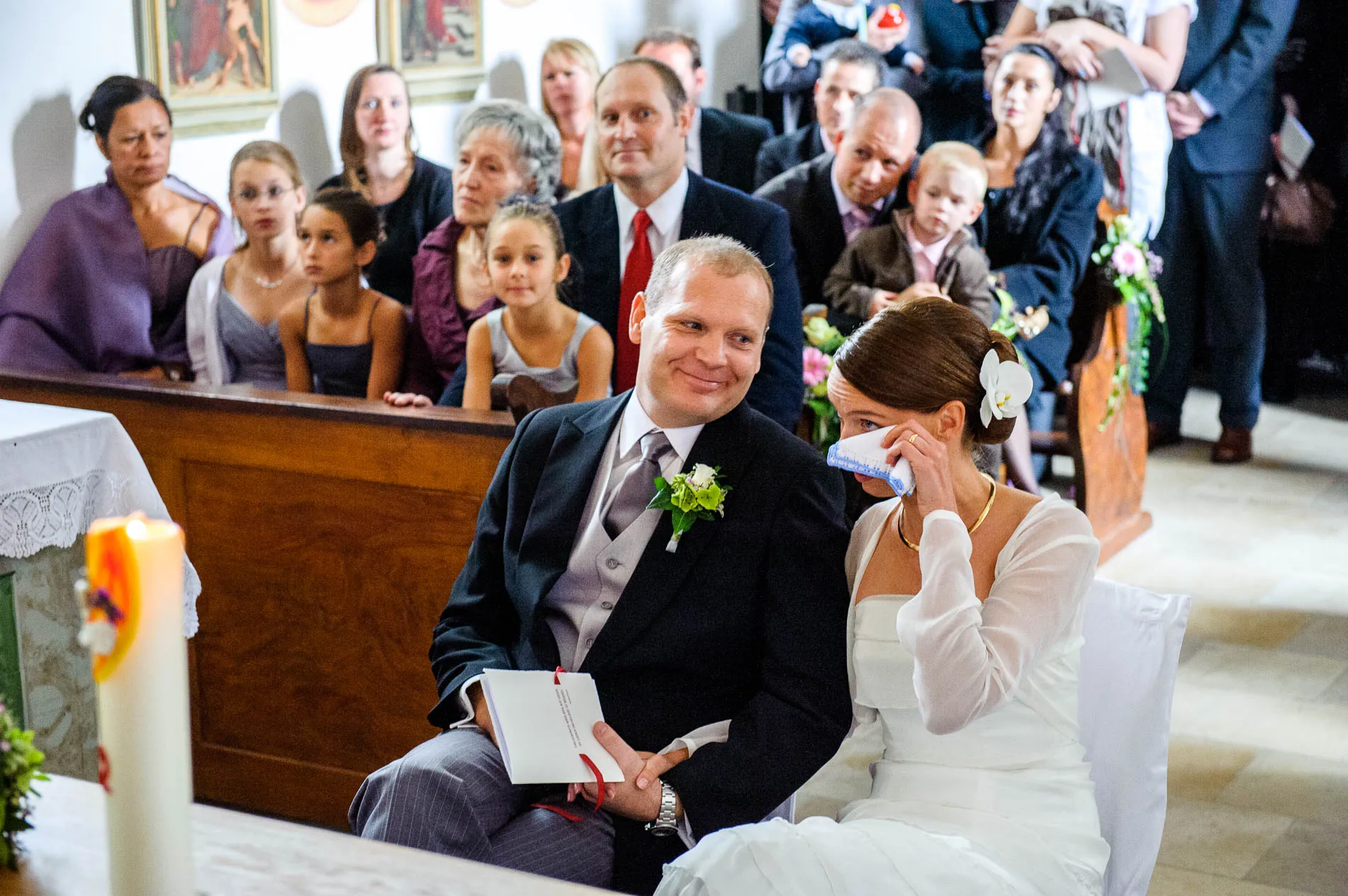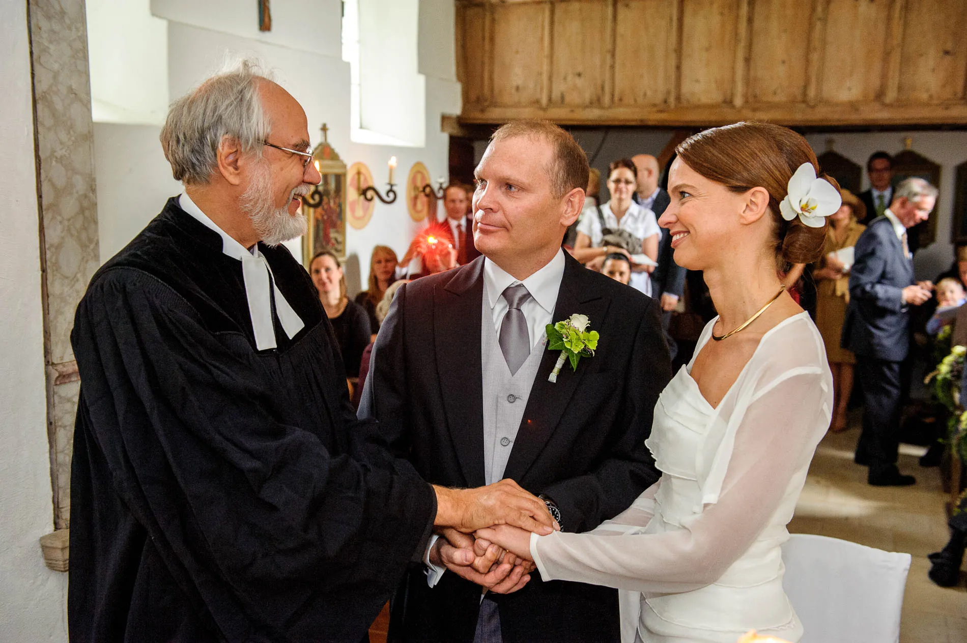 Auf einem Hügel thront die romanische Kirche aus dem 11. Jahrhundert. Hier können sowohl evangelische als auch katholische Trauungen stattfinden – ein Detail, das für viele Paare die Planung erleichtert. Mein Brautpaar entschied sich für den klassischen Einzug: gemeinsam, bestens gelaunt, der Pfarrer voran. In der Kirche wechselten sich Tränen der Freude und Tränen der Rührung ab – ein Wechselspiel, das selbst für einen erfahrenen Hochzeitsfotografen nie Routine wird.