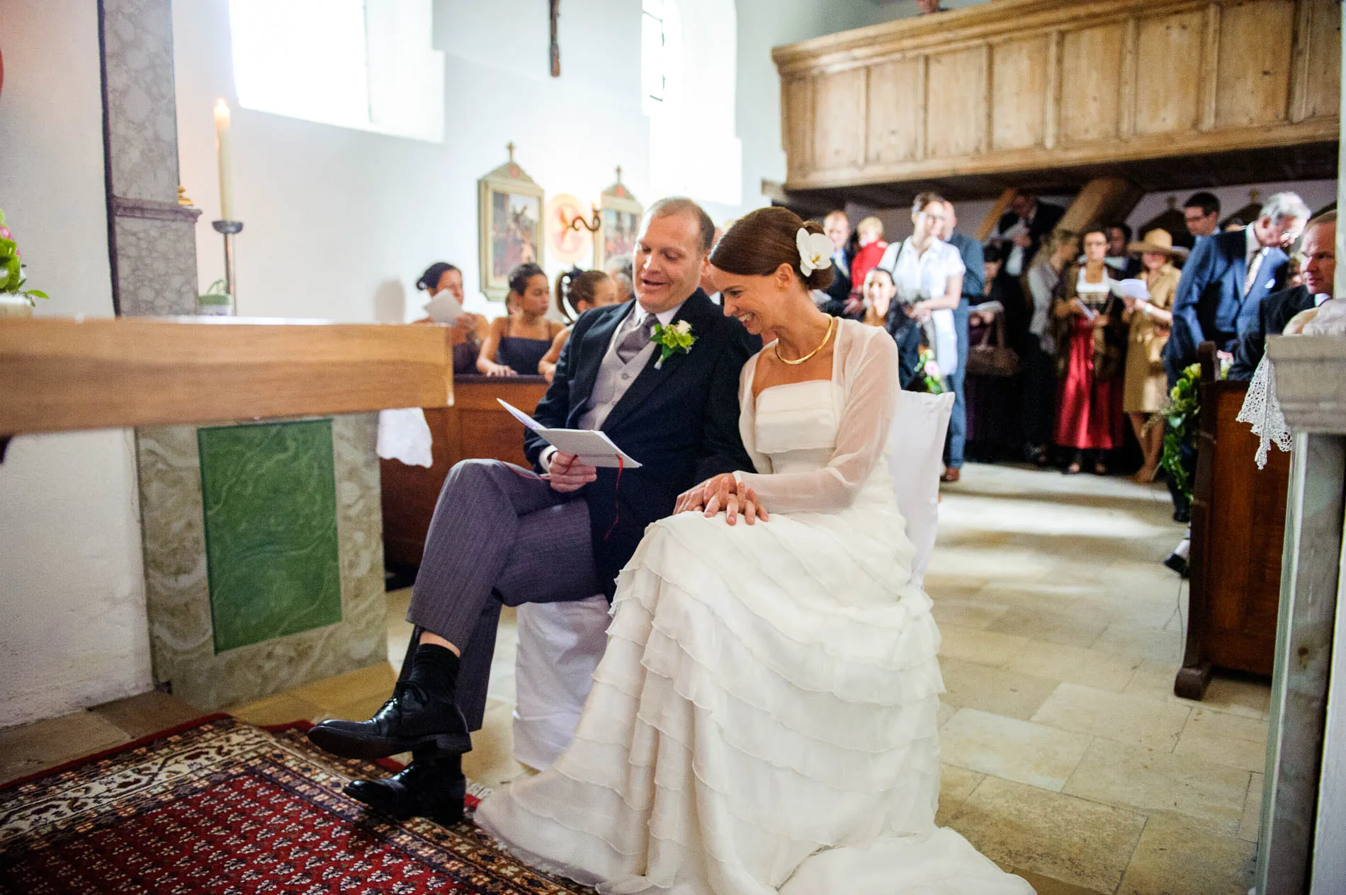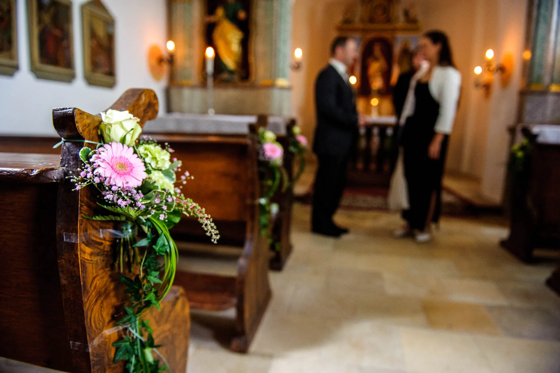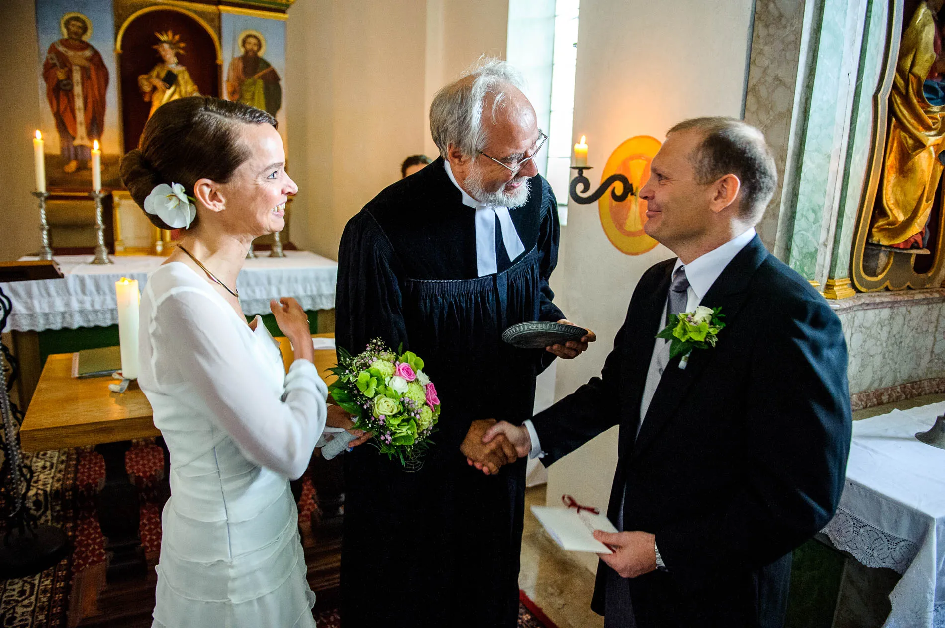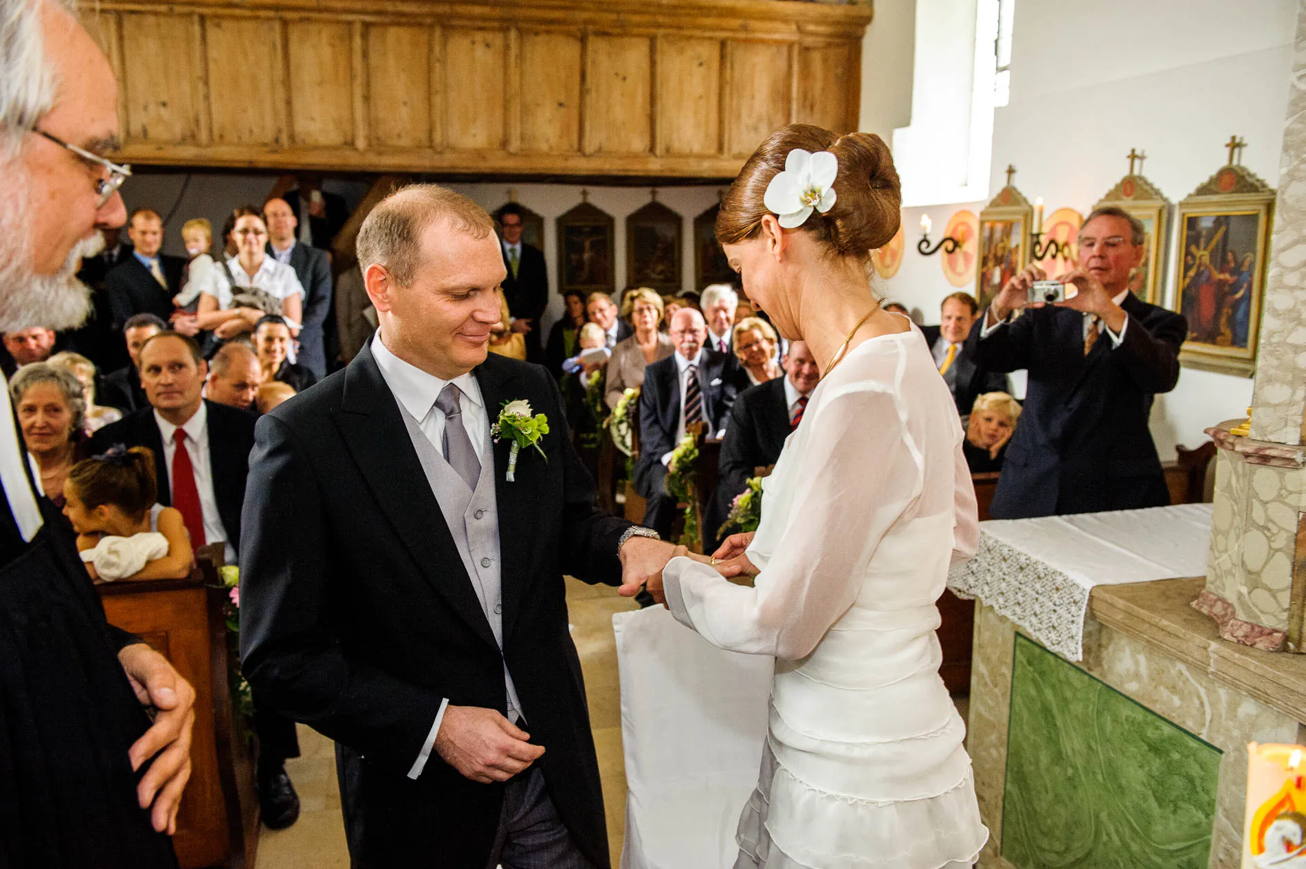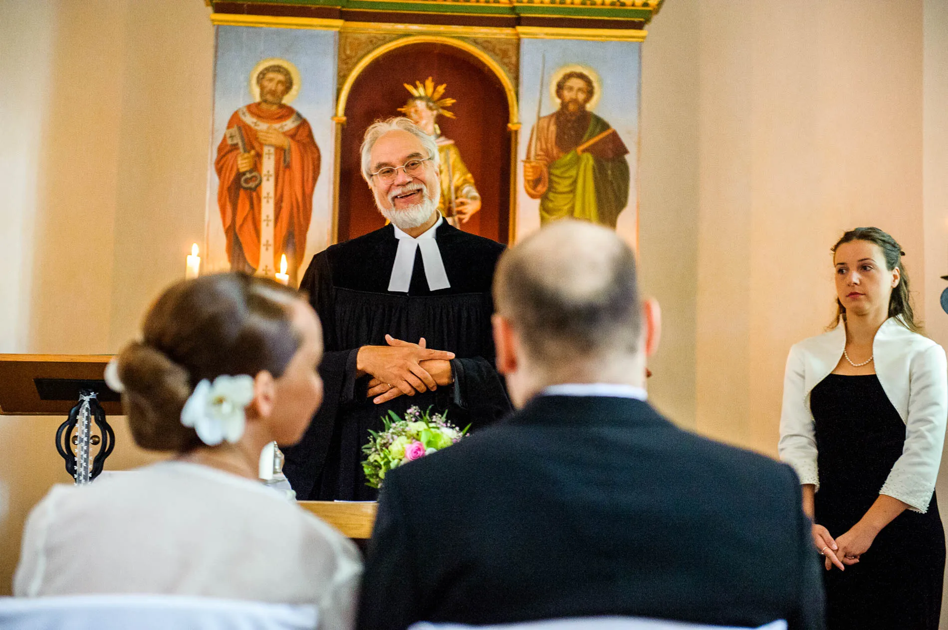 Auf einem Hügel thront die romanische Kirche aus dem 11. Jahrhundert. Hier können sowohl evangelische als auch katholische Trauungen stattfinden – ein Detail, das für viele Paare die Planung erleichtert. Mein Brautpaar entschied sich für den klassischen Einzug: gemeinsam, bestens gelaunt, der Pfarrer voran. In der Kirche wechselten sich Tränen der Freude und Tränen der Rührung ab – ein Wechselspiel, das selbst für einen erfahrenen Hochzeitsfotografen nie Routine wird.