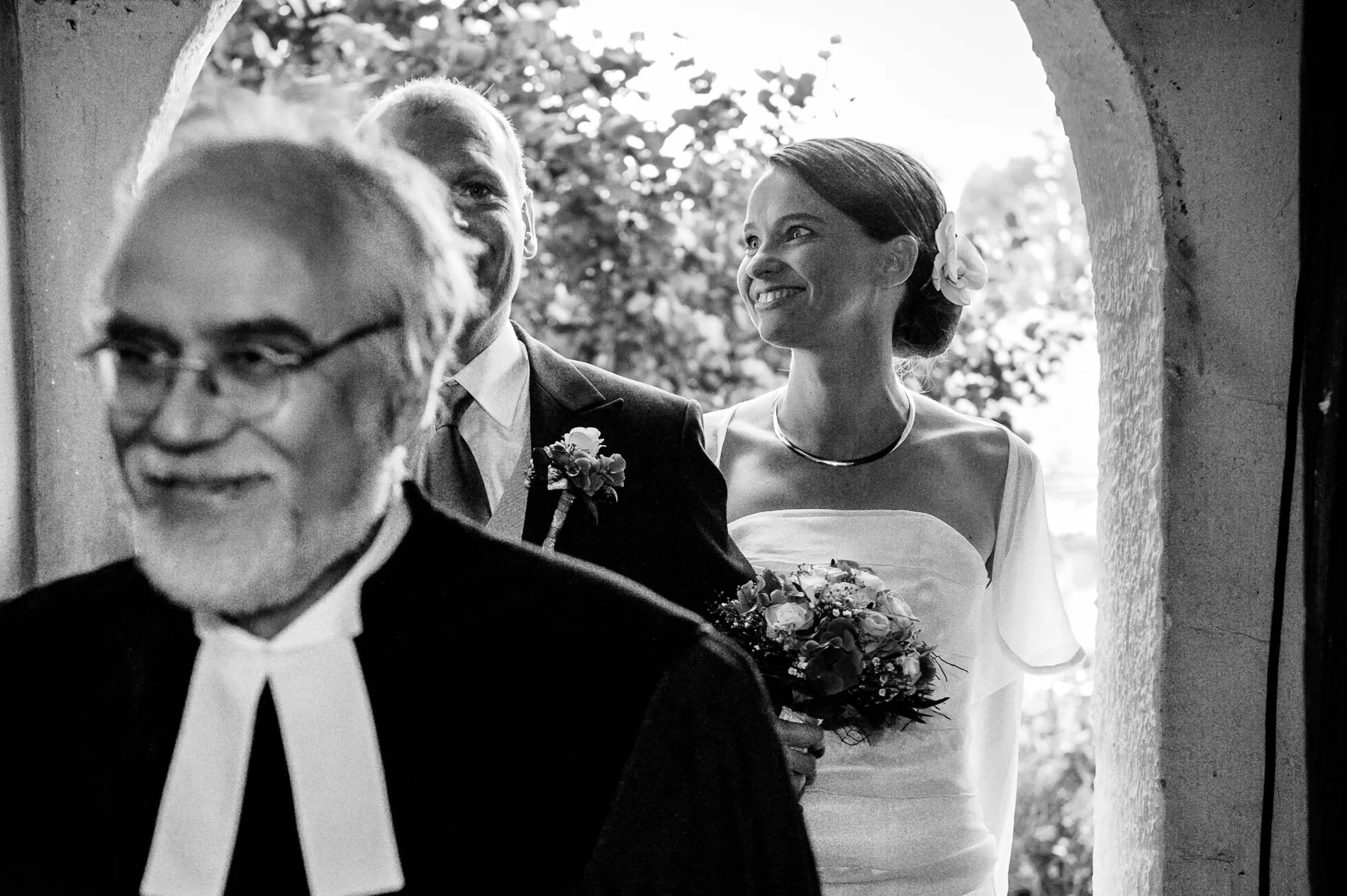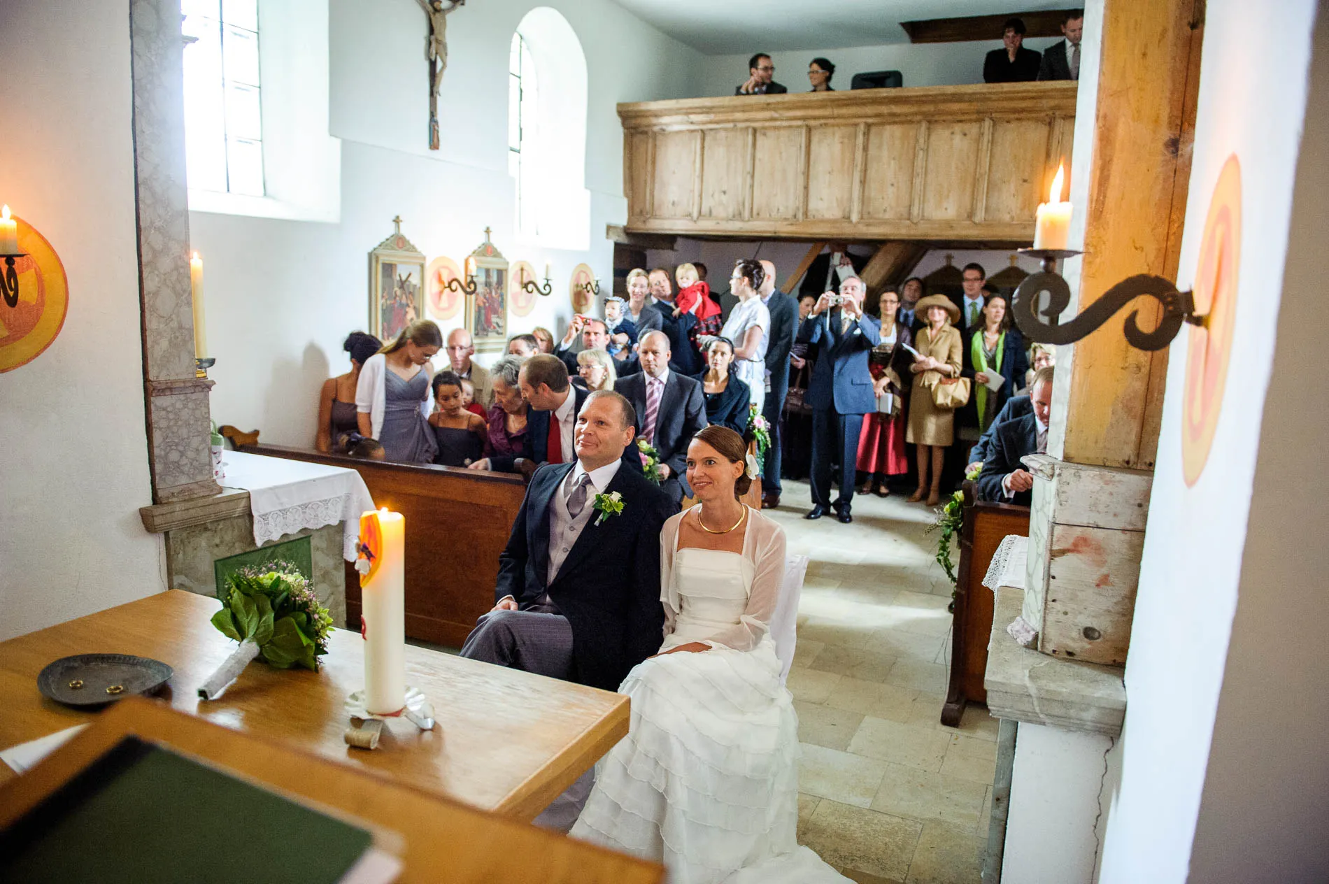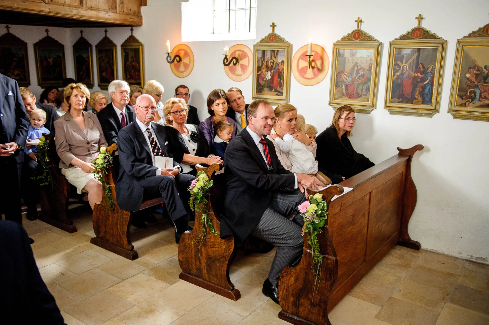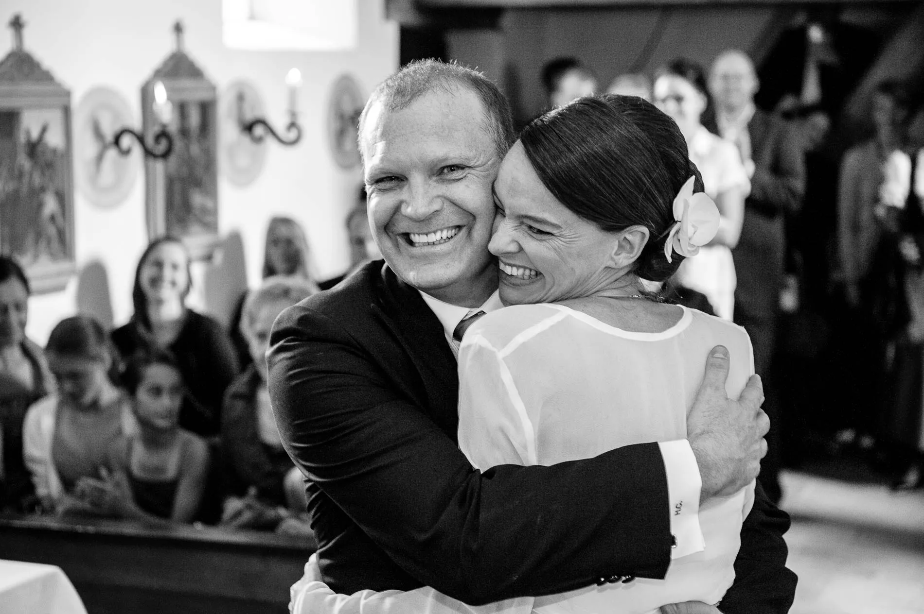 Auf einem Hügel thront die romanische Kirche aus dem 11. Jahrhundert. Hier können sowohl evangelische als auch katholische Trauungen stattfinden – ein Detail, das für viele Paare die Planung erleichtert. Mein Brautpaar entschied sich für den klassischen Einzug: gemeinsam, bestens gelaunt, der Pfarrer voran. In der Kirche wechselten sich Tränen der Freude und Tränen der Rührung ab – ein Wechselspiel, das selbst für einen erfahrenen Hochzeitsfotografen nie Routine wird.