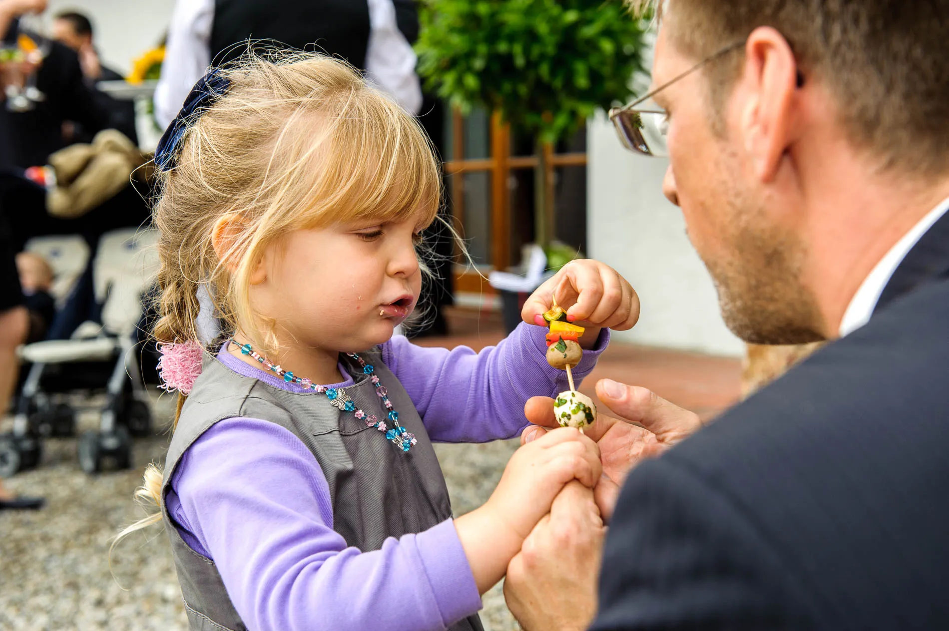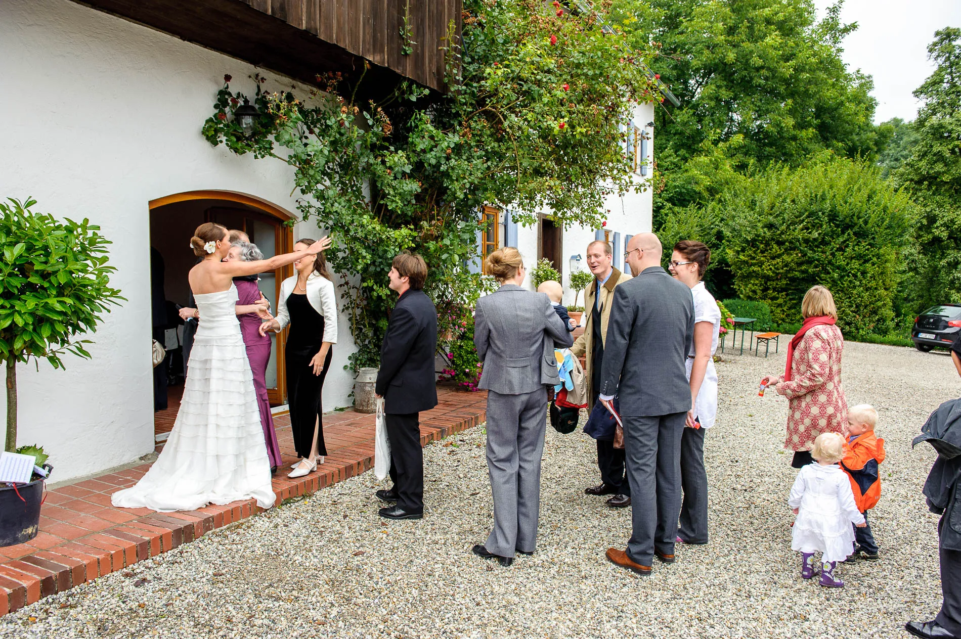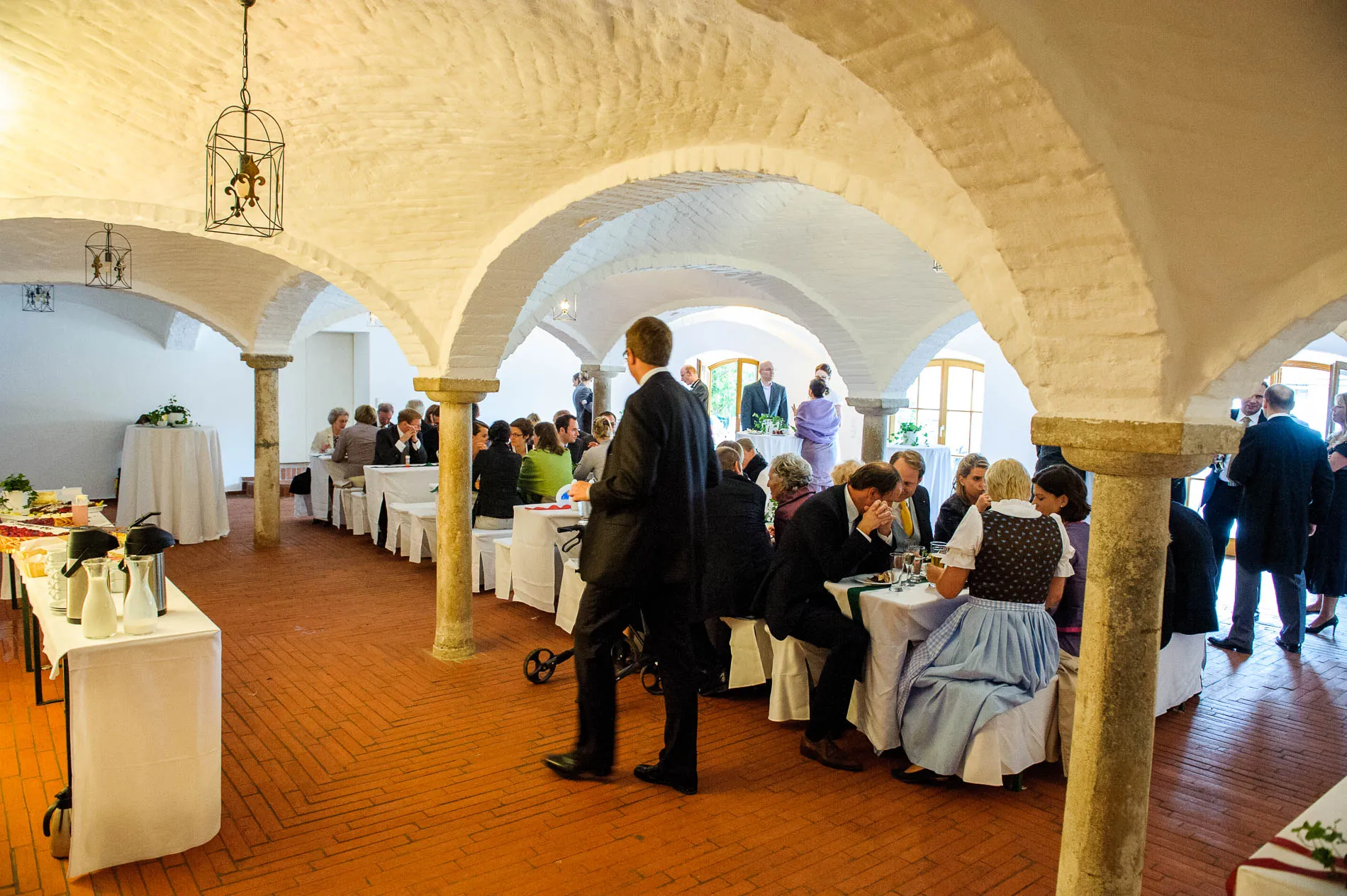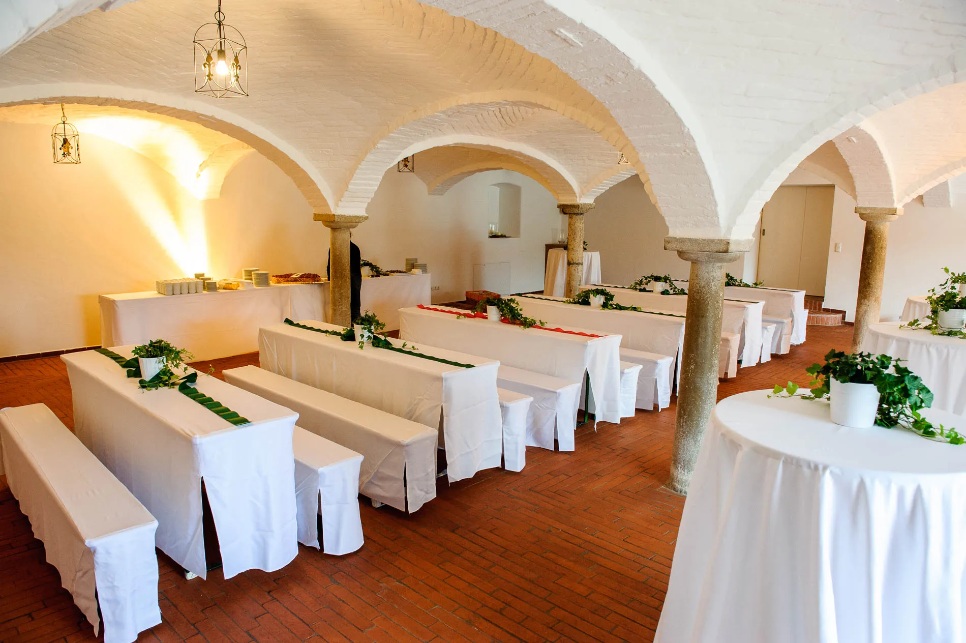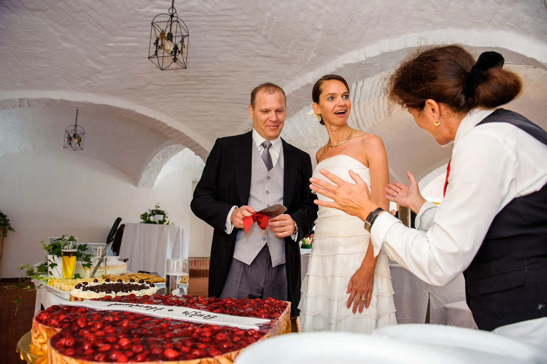 Im Innenhof und im Gewölbesaal wartete der Empfang: Sekt, Aperol Spritz und Häppchen, die man hierzulande auch schlicht „Fingerfood“ nennt. Die Gäste nutzten die Gelegenheit, sich die Beine zu vertreten, während die ersten Glückwünsche ausgesprochen wurden. Die Hochzeitstorte war ein großes Herz, mit Beeren belegt – Herzen wohin man blickte. Als Hochzeitsfotograf in Freising habe ich schon viele Torten gesehen, aber diese passte perfekt zum roten Faden des Tages.