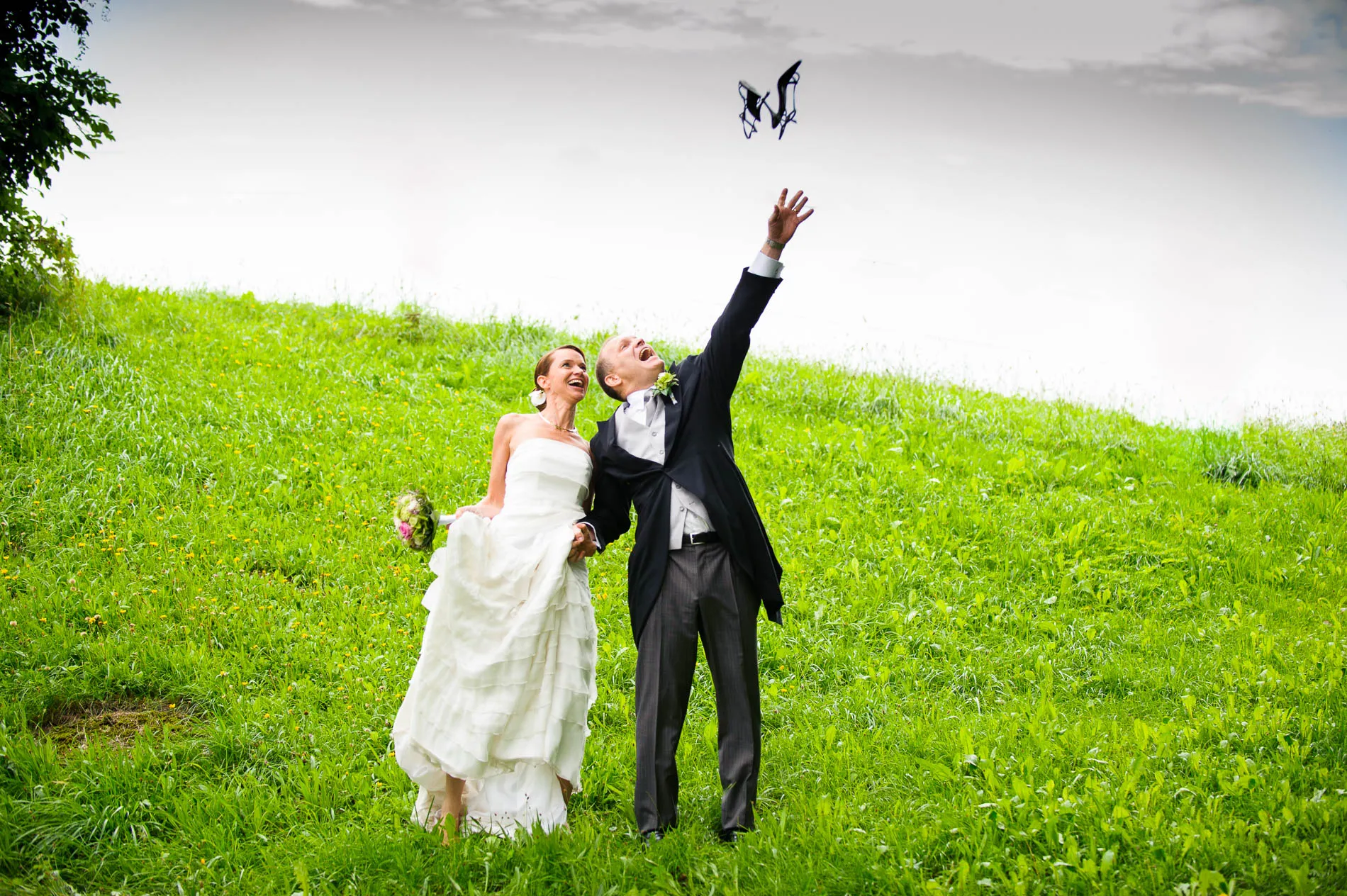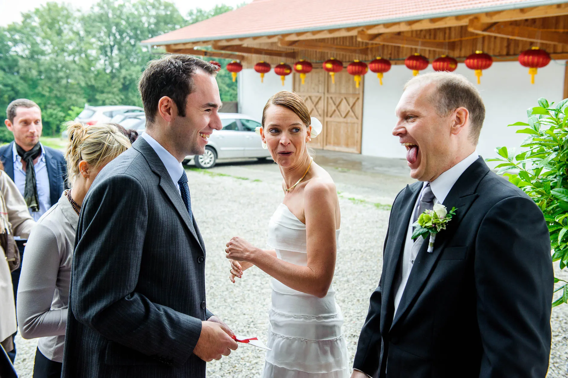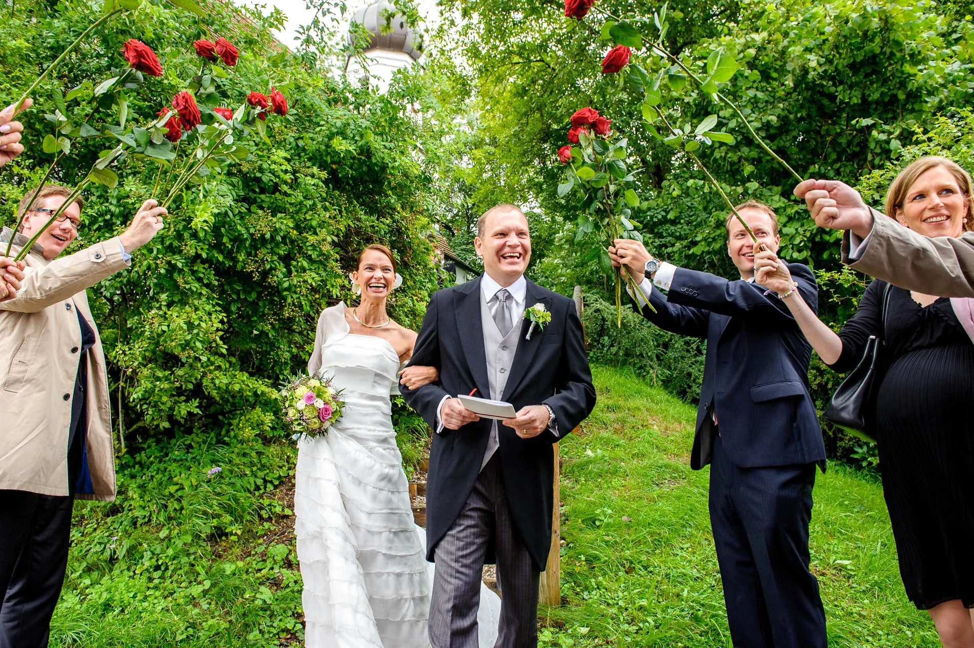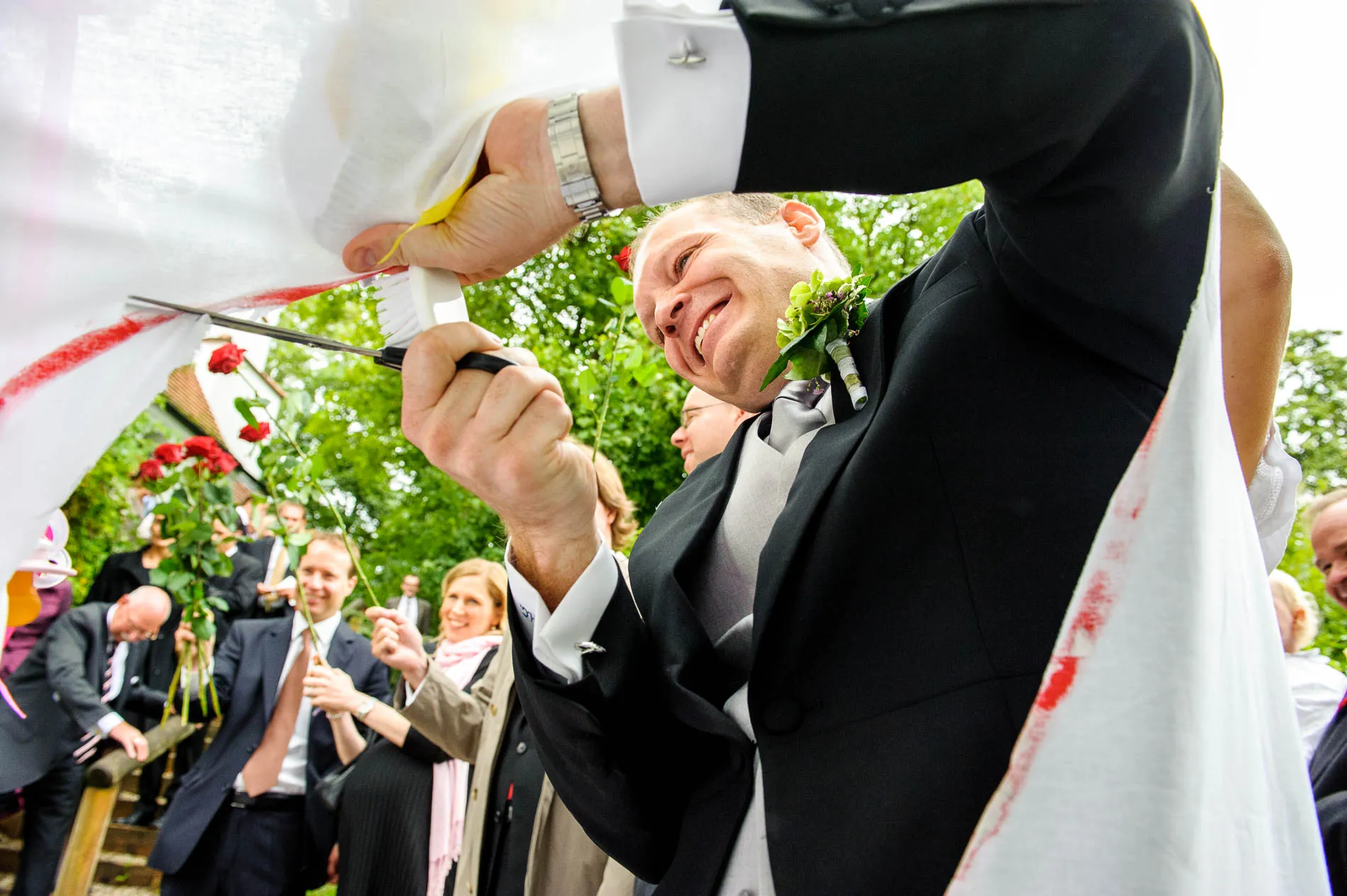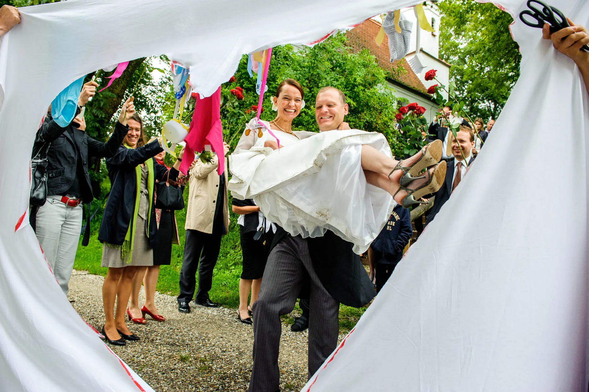 Nach der Trauung erwartete die Gäste ein Spalier aus roten Rosen. Und weil Traditionen nicht nur gepflegt, sondern auch kreativ erweitert werden dürfen, folgte das berühmte Herz-aus-dem-Bettlaken-Schneiden. Dieses Exemplar war allerdings mit allerlei Symbolik dekoriert: Schnuller, Plastikenten, Kochlöffel und Wäsche flatterten daran. Ob es ein dezenter Hinweis auf Kinder, Haushalt und Ehealltag war oder einfach nur der Spaß der Trauzeugen – man weiß es nicht. Der Bräutigam trug seine Braut durch die ausgeschnittene Öffnung, und ja, die Gefahr einer spontanen Bandscheiben-OP stand kurz im Raum. Zum Glück blieb es bei einem Lächeln und Applaus.