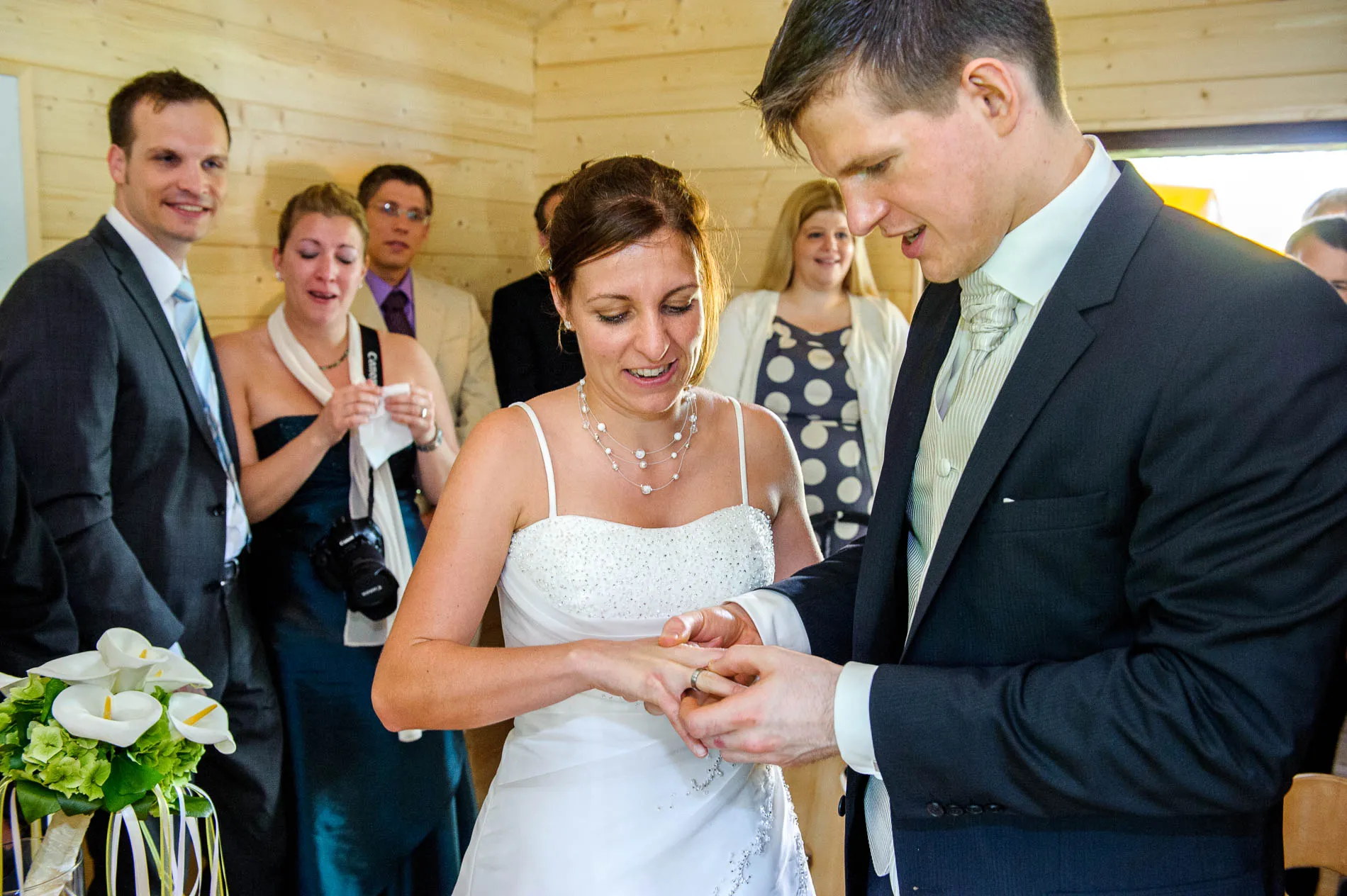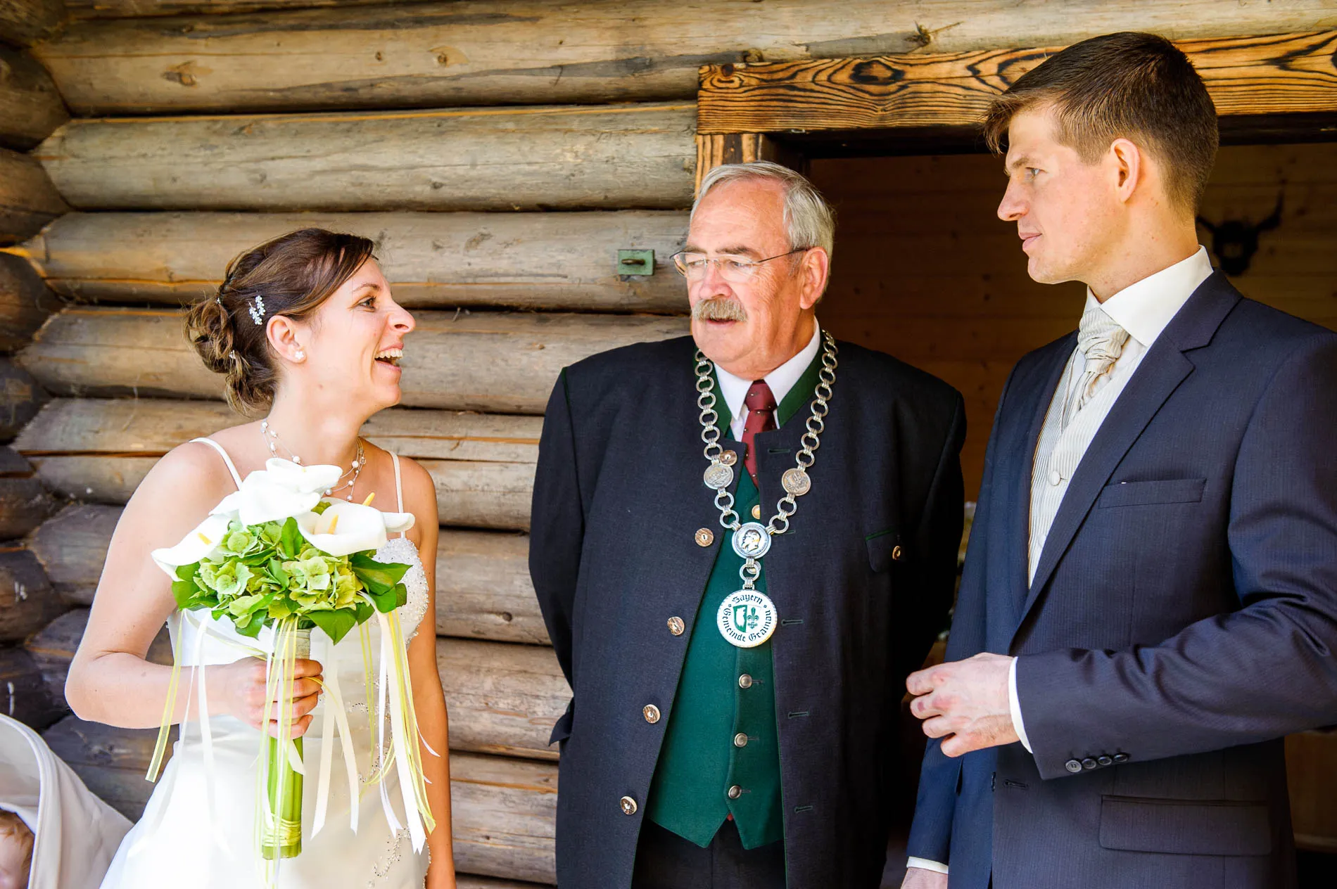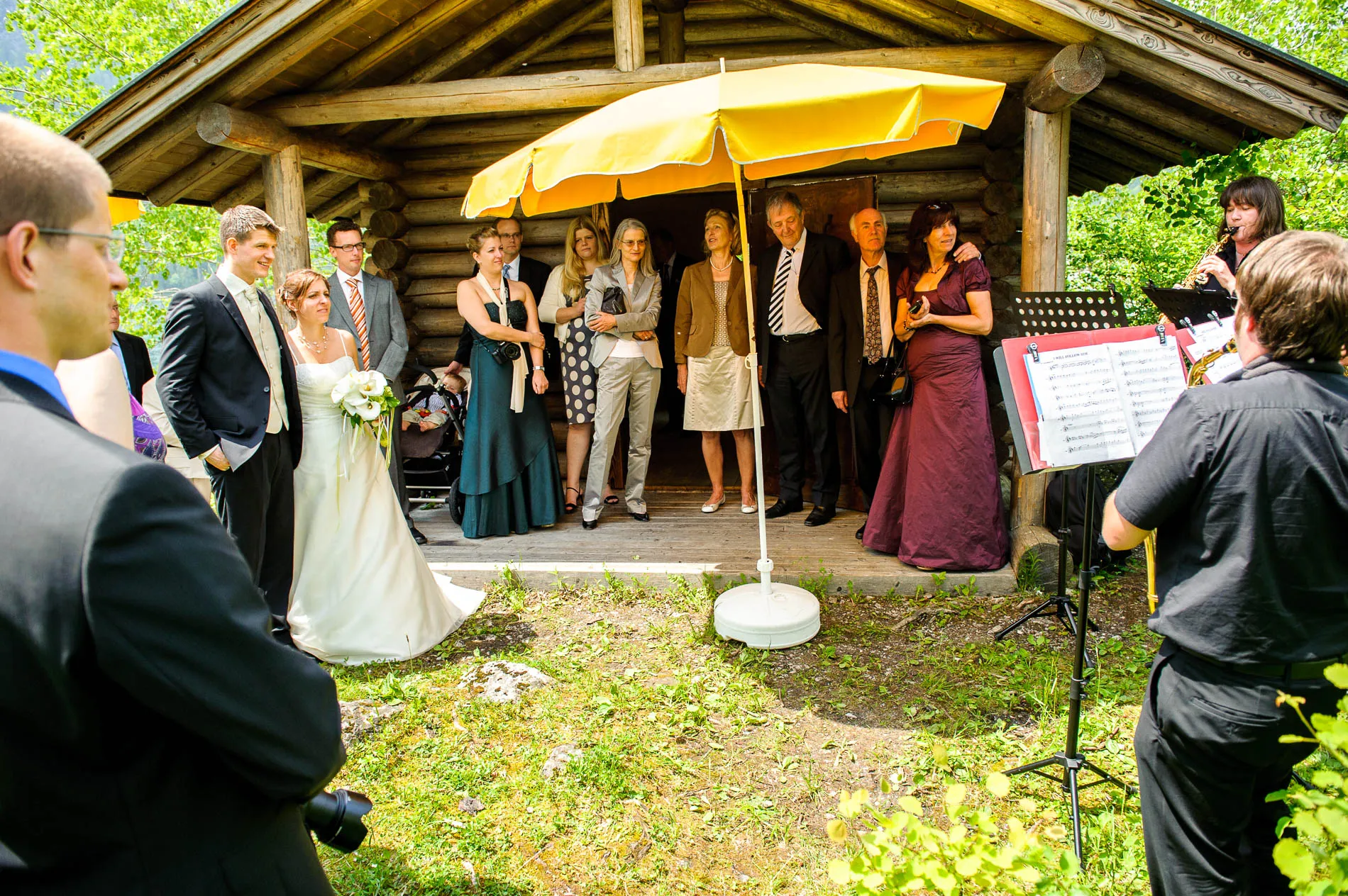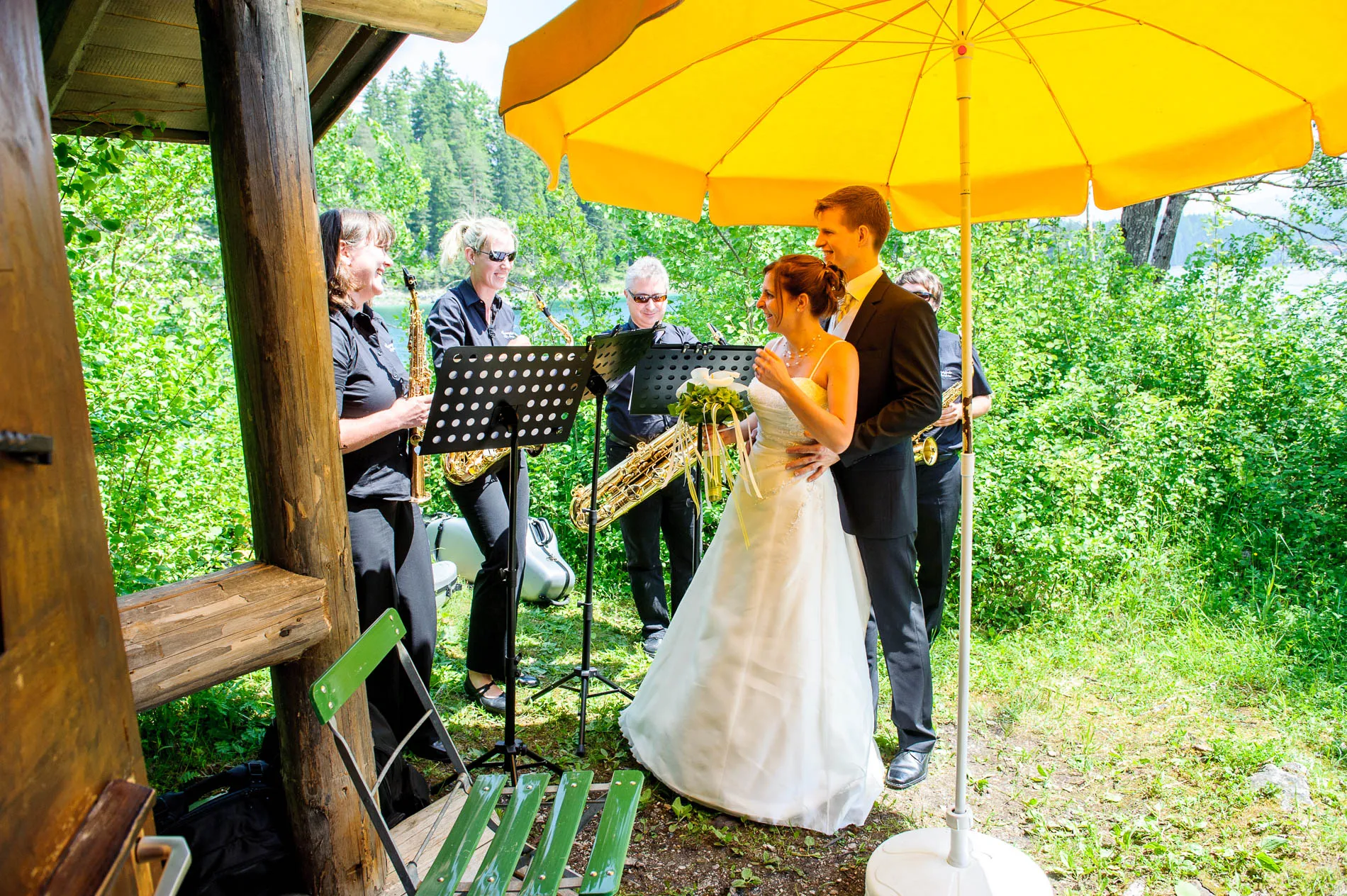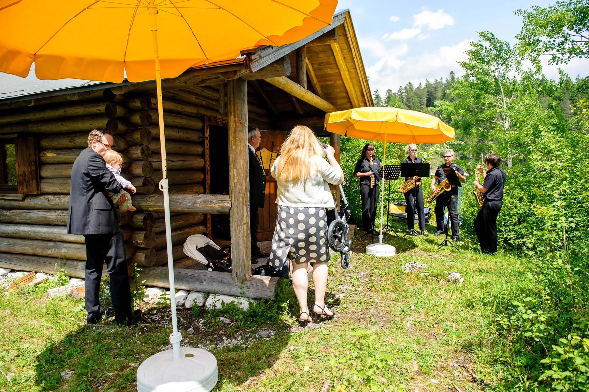 Auf der Insel angekommen, wurden wir von einer kleinen Band empfangen. Vor der Blockhütte entstand sofort eine Atmosphäre, die irgendwo zwischen „Bergromantik“ und „Festival im Kleinformat“ lag. Für mich als Hochzeitsfotograf war es ein Geschenk: Emotionen, Natur und ein Hauch Abenteuer – alles in einem Bild.