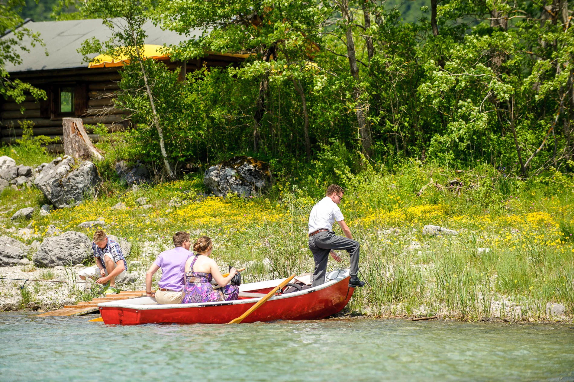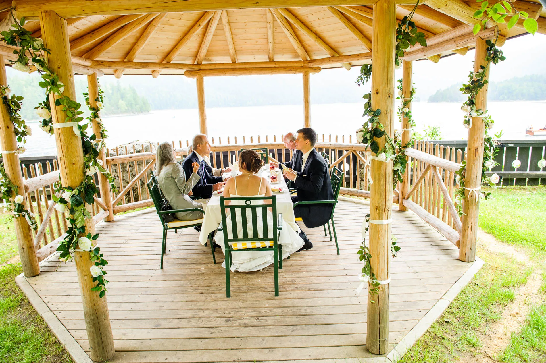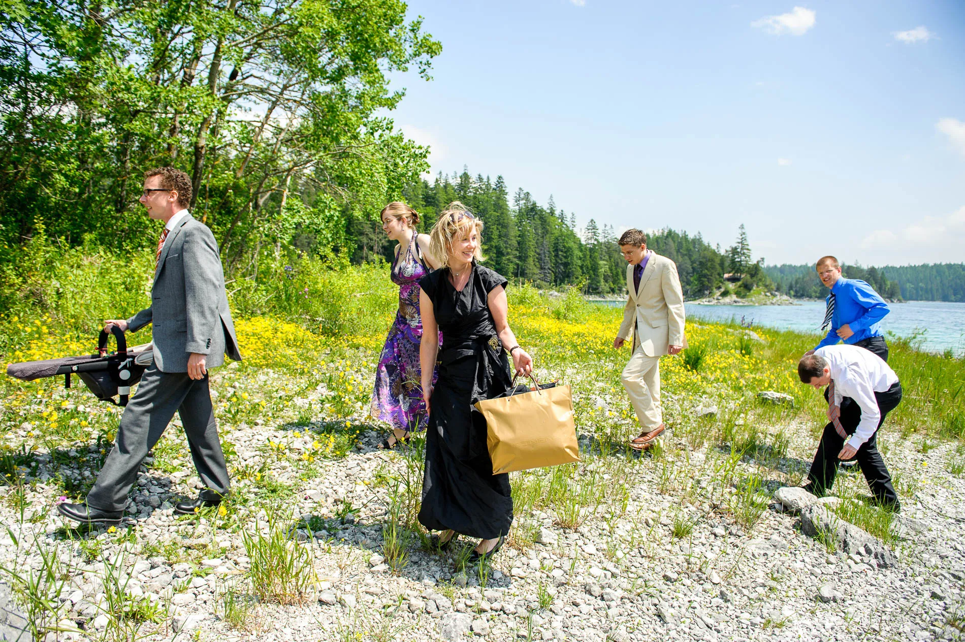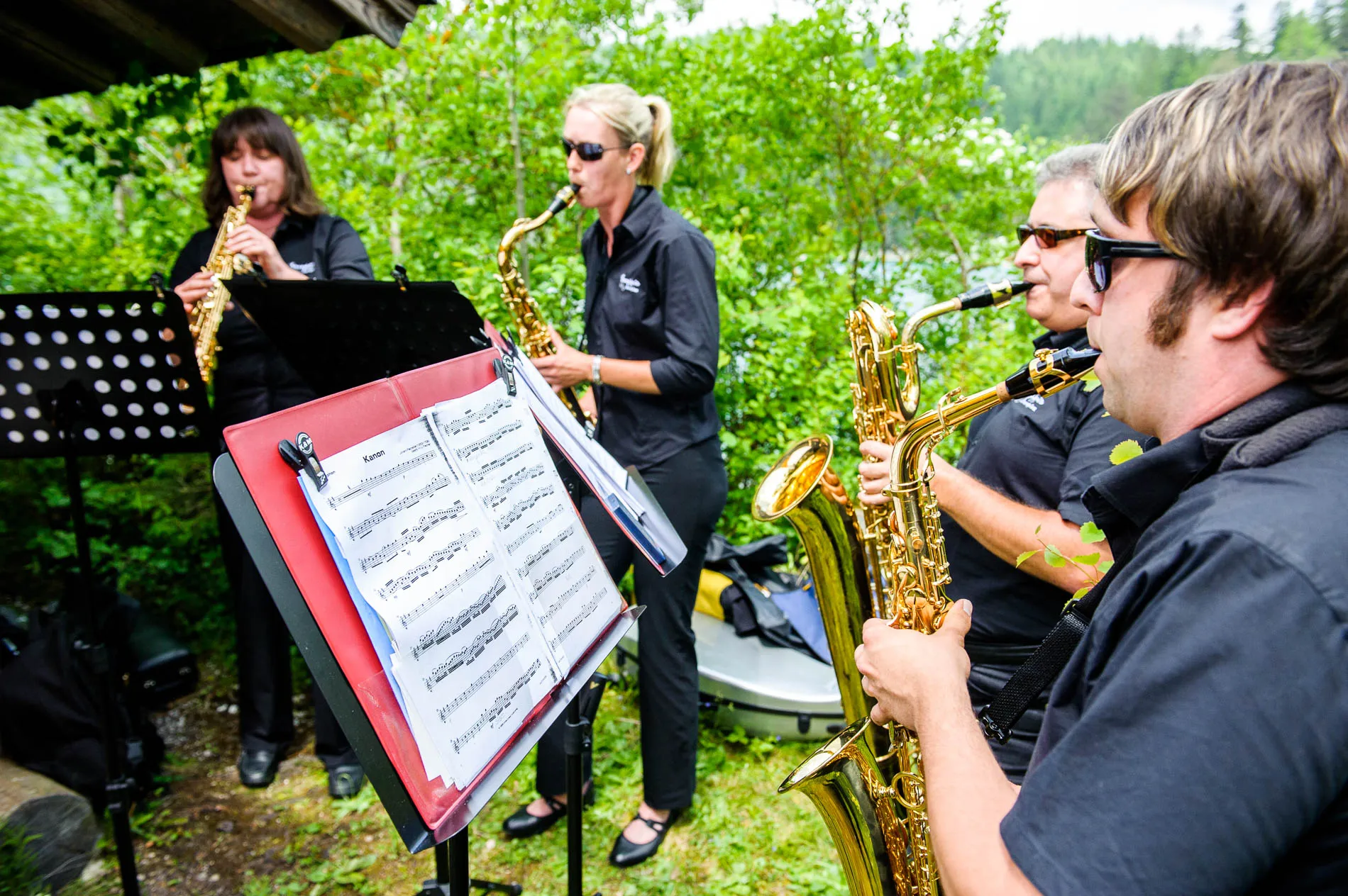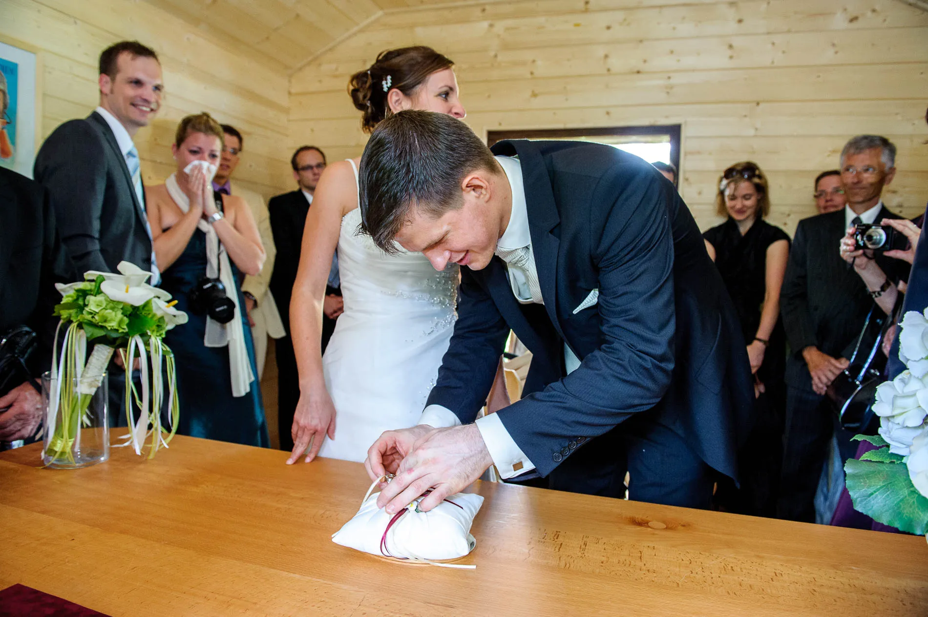 Auf der Insel angekommen, wurden wir von einer kleinen Band empfangen. Vor der Blockhütte entstand sofort eine Atmosphäre, die irgendwo zwischen „Bergromantik“ und „Festival im Kleinformat“ lag. Für mich als Hochzeitsfotograf war es ein Geschenk: Emotionen, Natur und ein Hauch Abenteuer – alles in einem Bild.