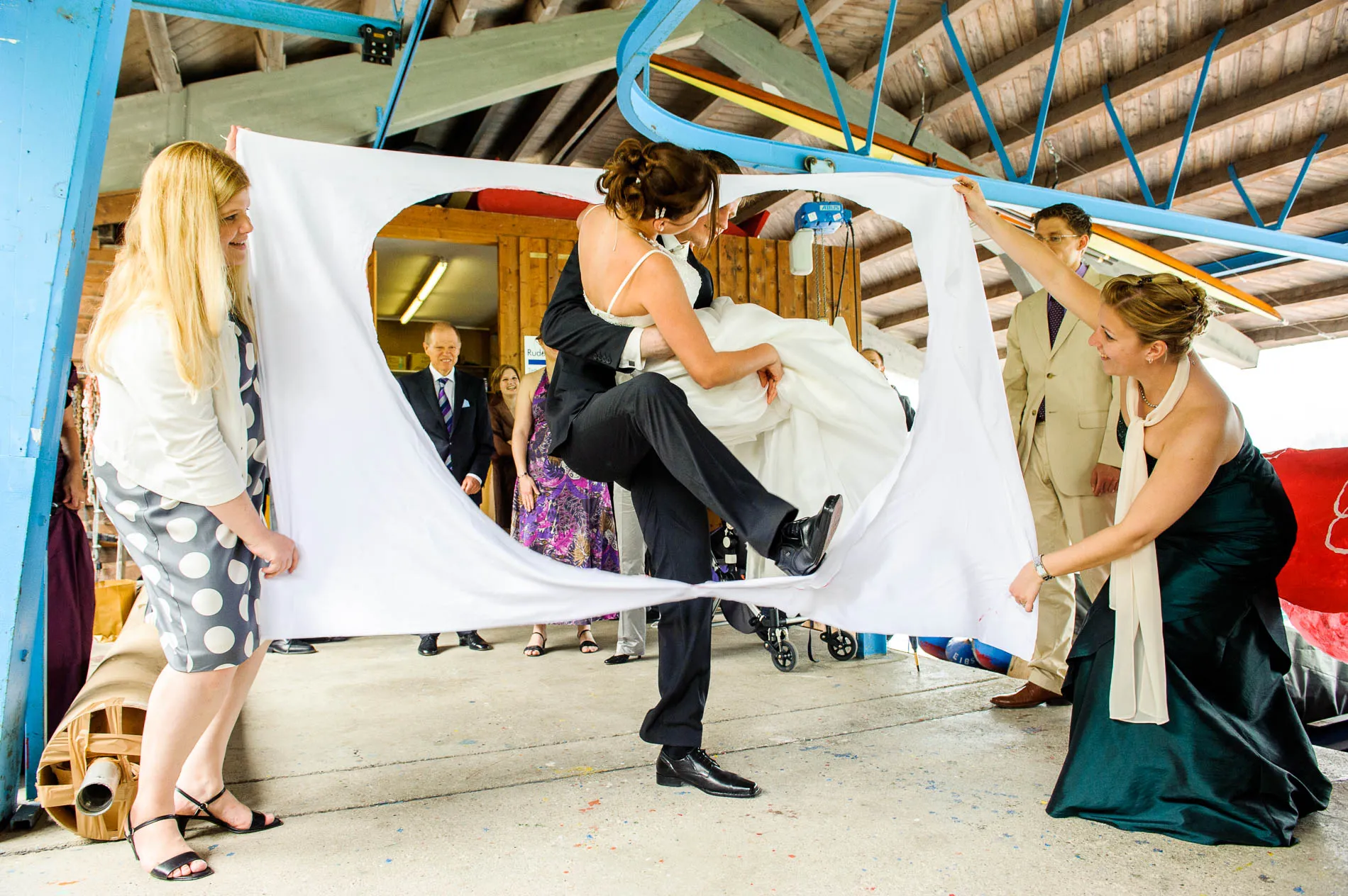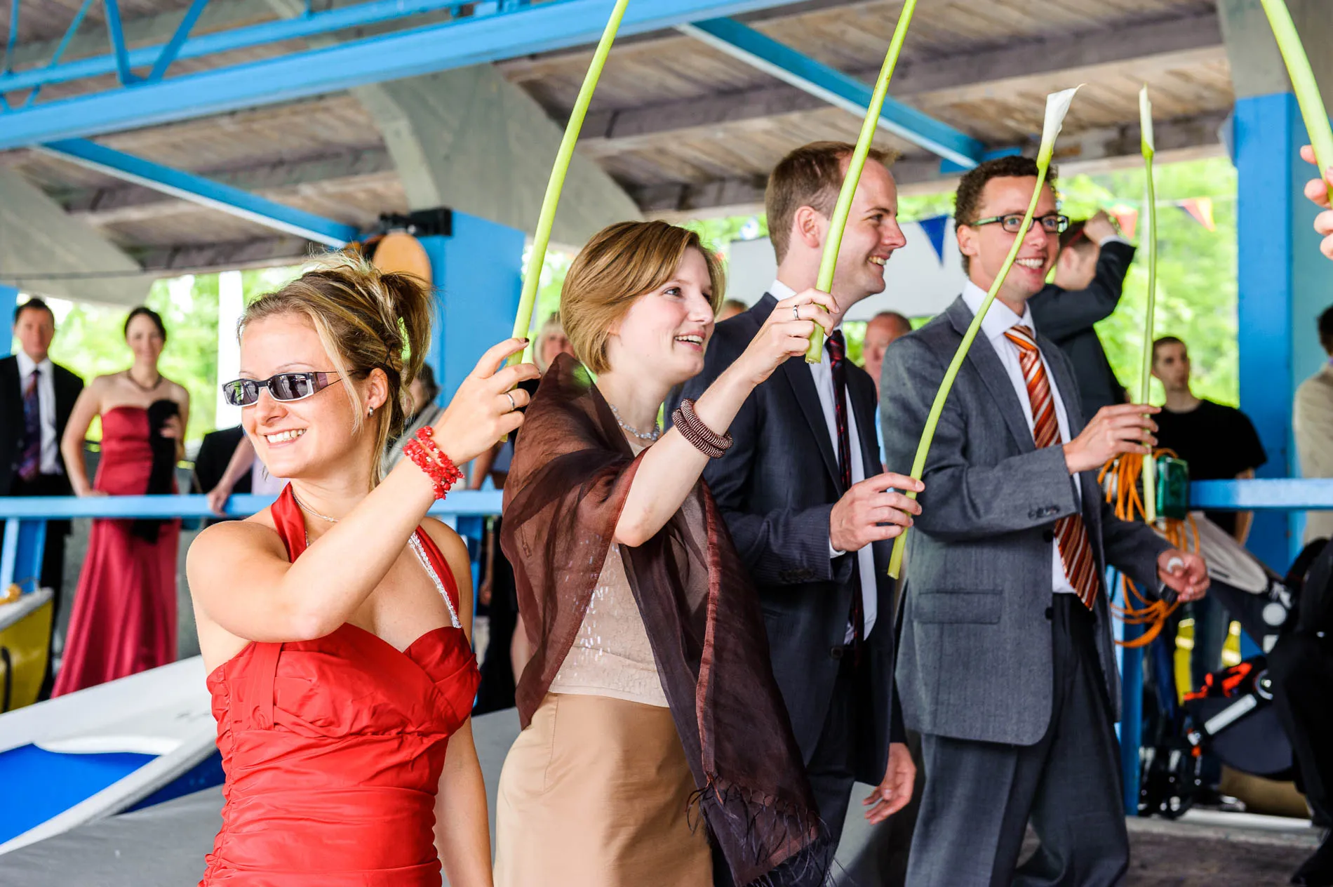 Nach der Rückkehr wartete am Anlegesteg das klassische Blumenspalier. Und natürlich das berühmte Herz aus dem Bettlaken, durch das der Bräutigam seine Braut tragen durfte. Eine Tradition, die vermutlich noch aus einer Zeit stammt, in der Fitnessstudios nicht erfunden waren.