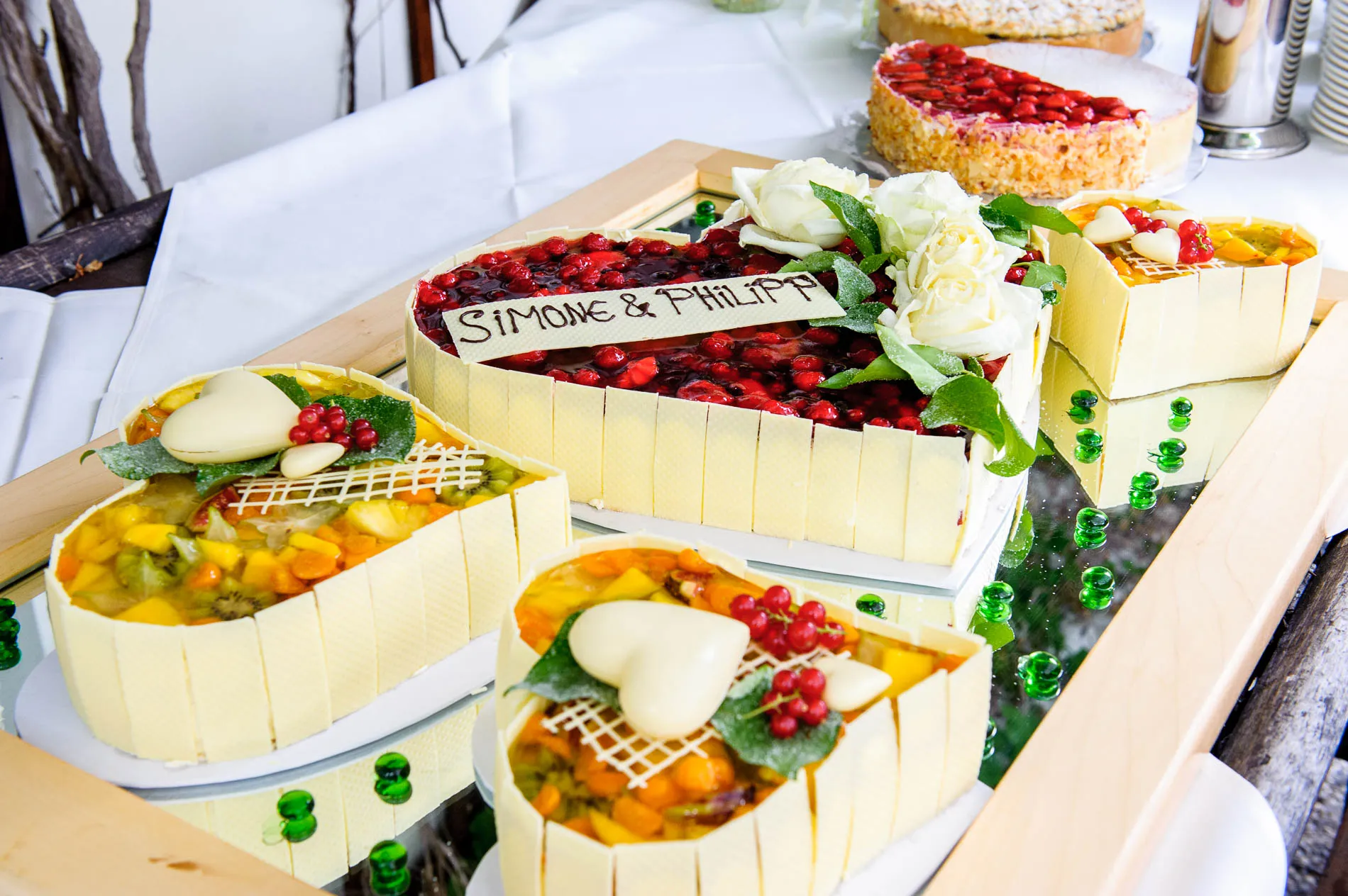 Im Seegarten des Hotels ging es weiter mit Kaffee und Kuchen. Die Hochzeitstorte war eine kleine architektonische Meisterleistung: eine große Herztorte, flankiert von drei kleineren, fruchtigen Varianten. Ein Ensemble, das fast zu schade zum Anschneiden war – aber nur fast.
