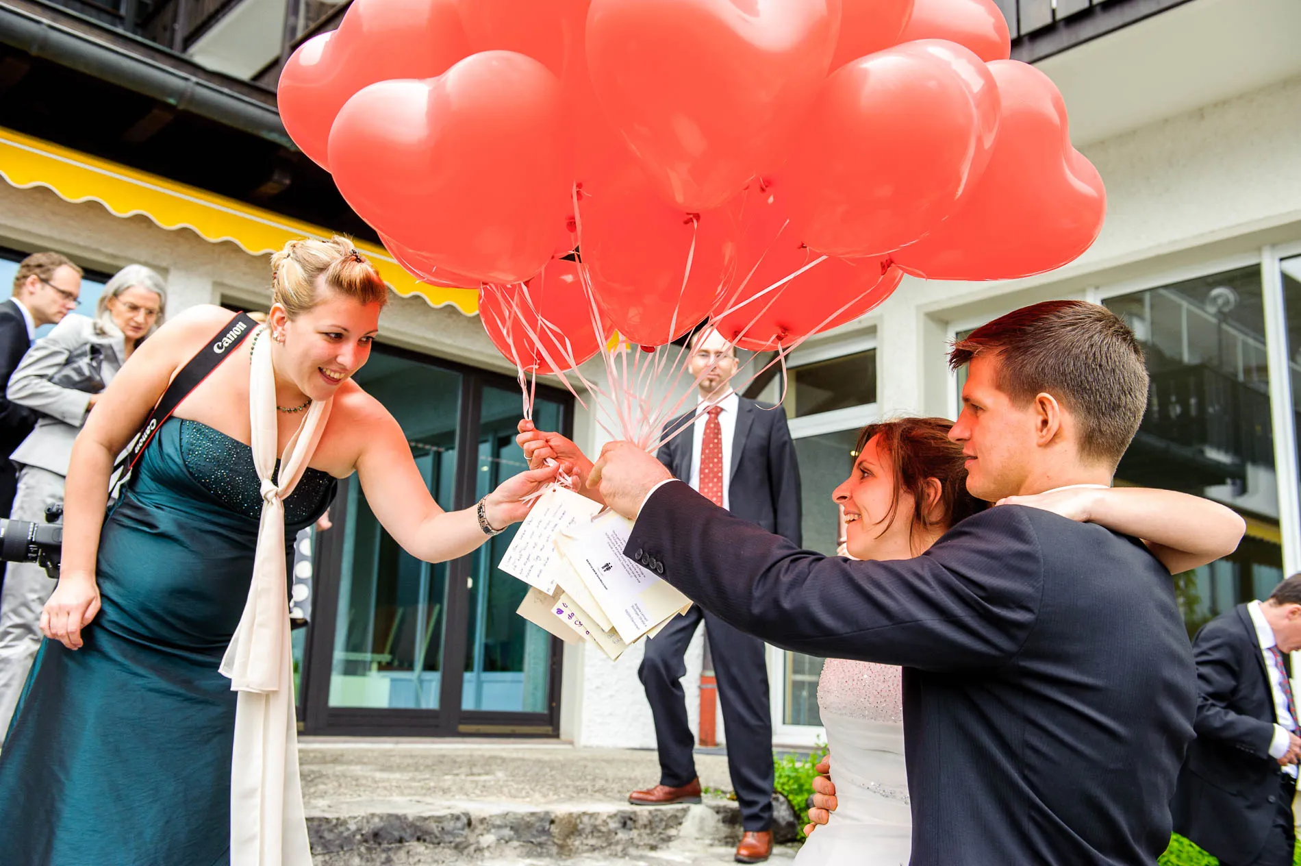 Ein besonders schöner Moment: das Steigenlassen der Herzballons. Anders als üblich bekam nicht jeder Gast einen einzelnen Ballon, sondern das Brautpaar erhielt das gesamte Bündel. Gemeinsam ließen sie es steigen – ein Bild, das nicht nur auf den Fotos eindrucksvoll wirkt, sondern auch symbolisch: Manchmal ist es eben besser, wenn man die Dinge zusammen in die Luft gehen lässt.