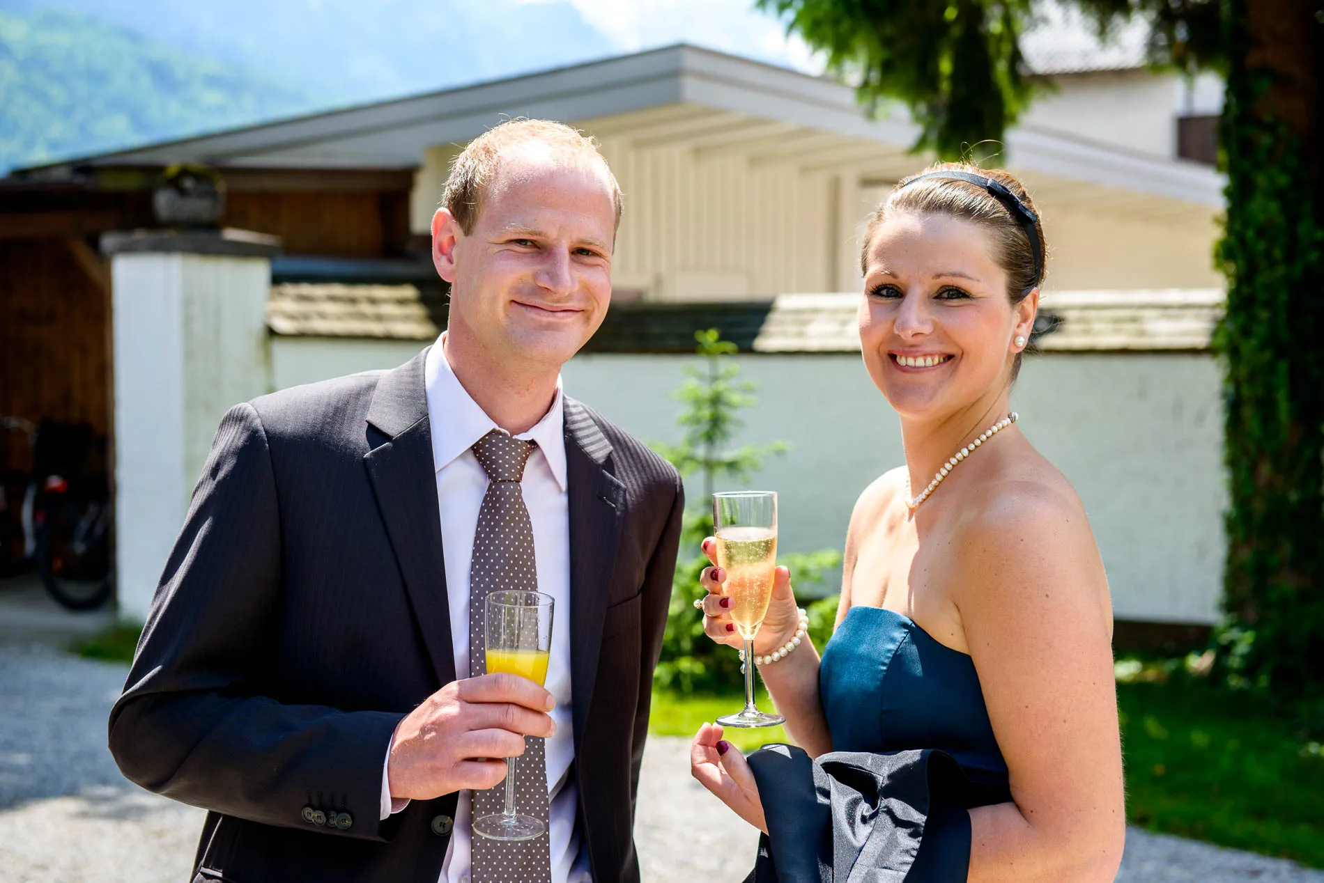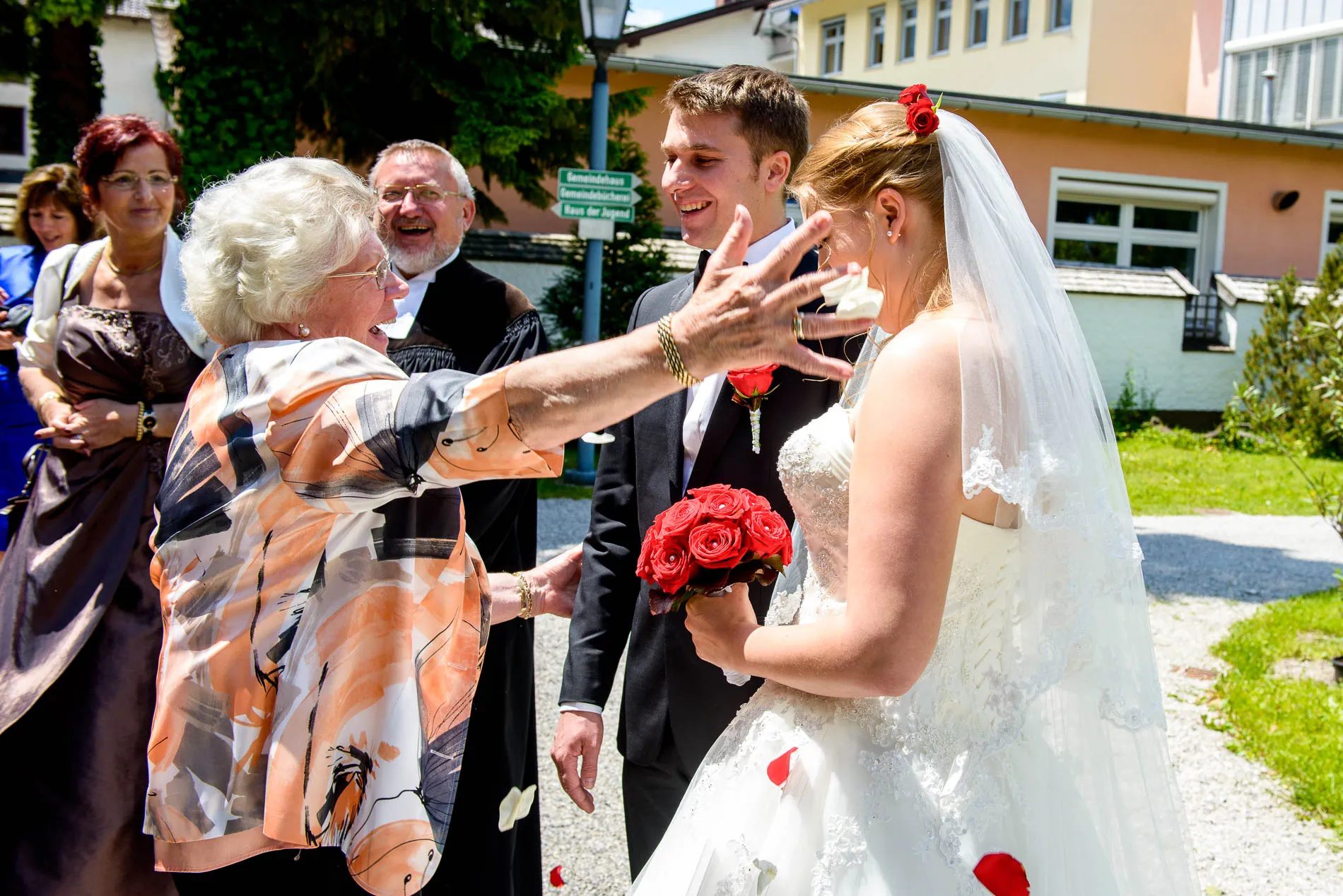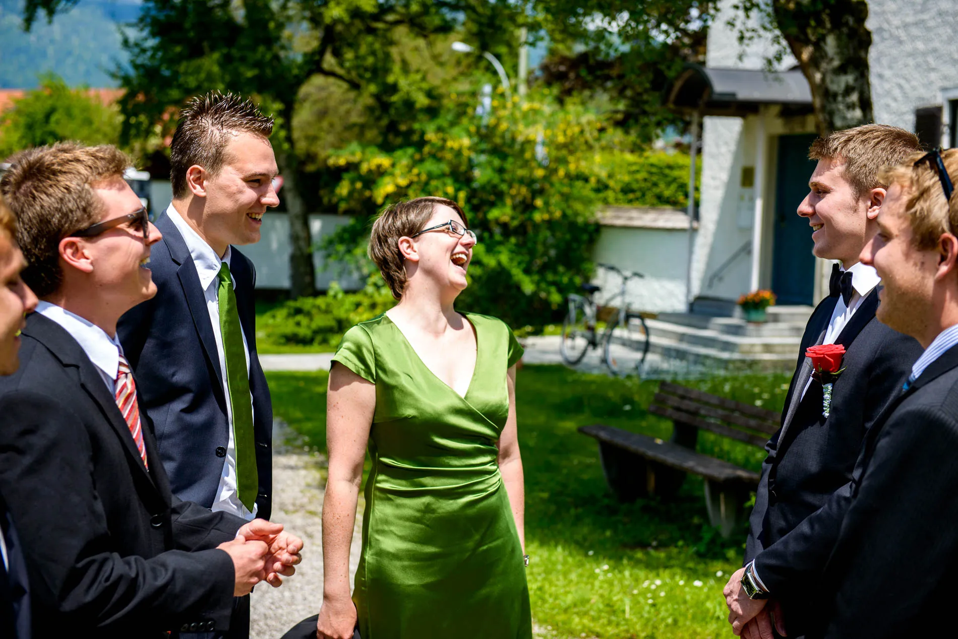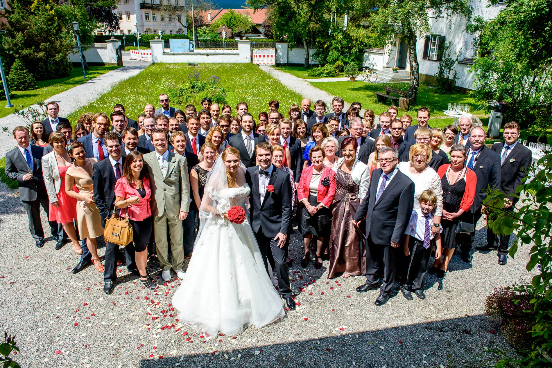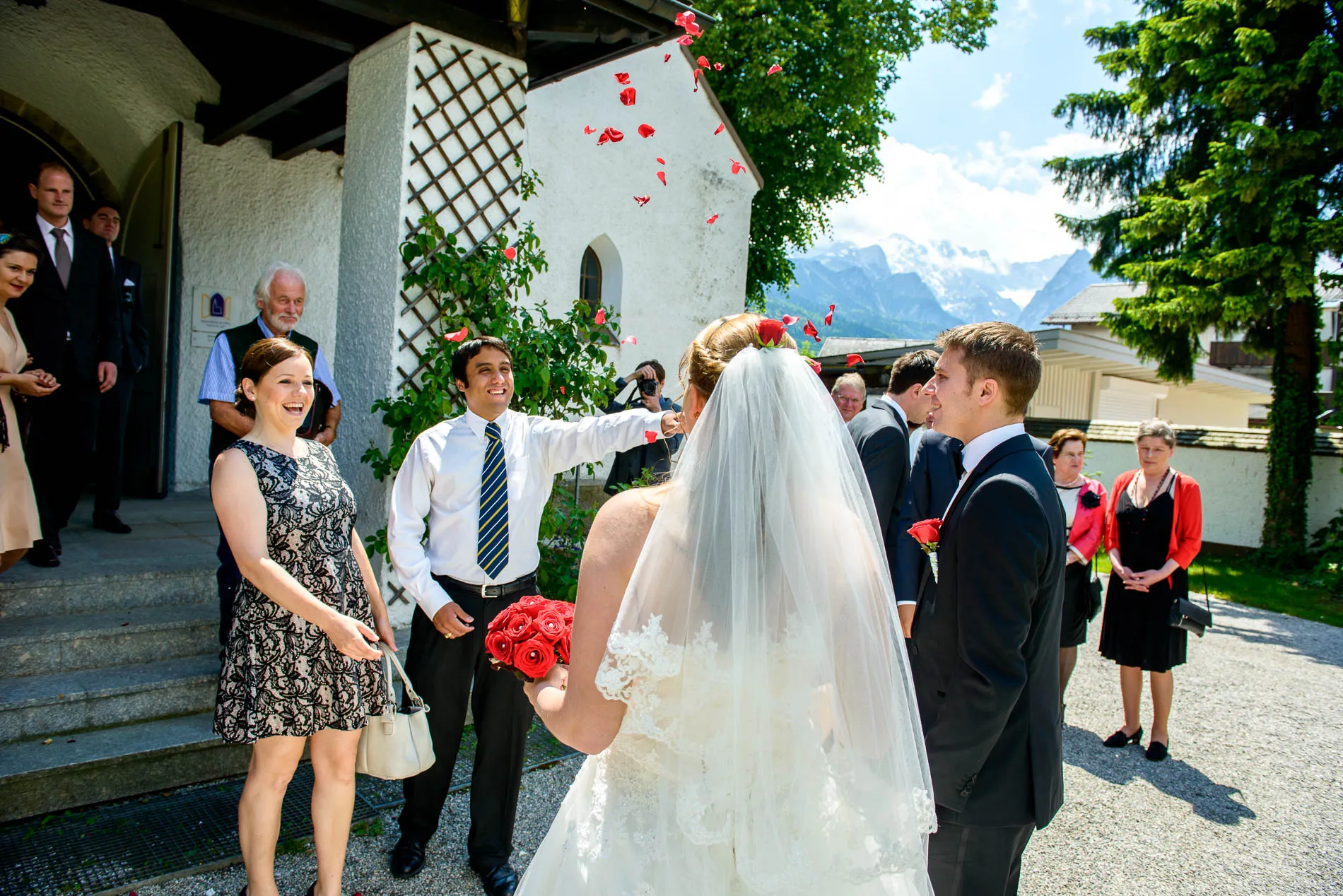Nach der Trauung verwandelte sich der kleine Park rund um die Kirche in eine Bühne für Glückwünsche, Umarmungen und einen regelrechten Blütenhagel. Praktischerweise bot der Garten nicht nur Platz für den Sektempfang, sondern auch für das erste große Gruppenfoto. Und wenn man schon die bayerischen Berge als Hintergrund hat, braucht man eigentlich nur noch ein Glas Sekt in der Hand, um das Bild perfekt zu machen.