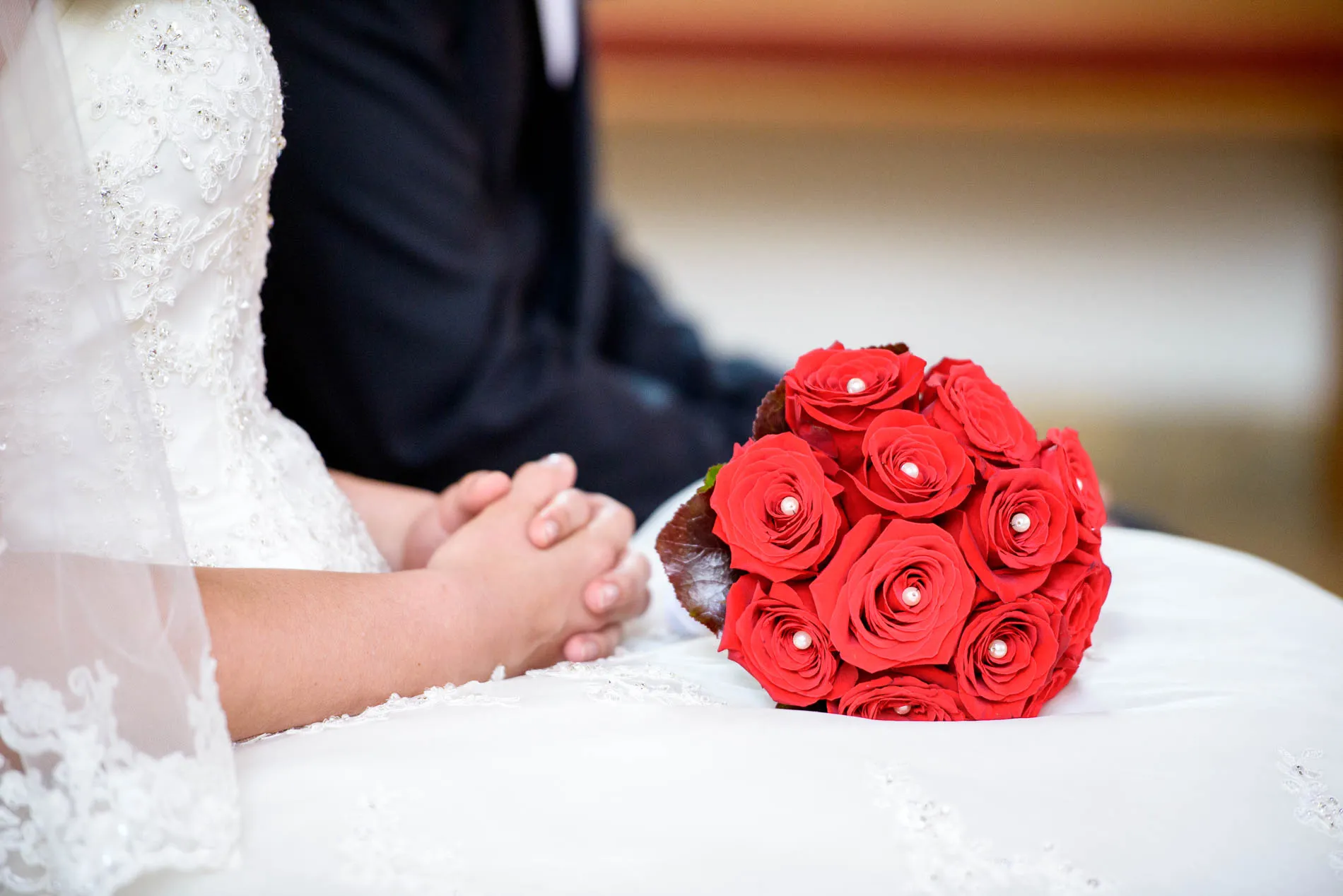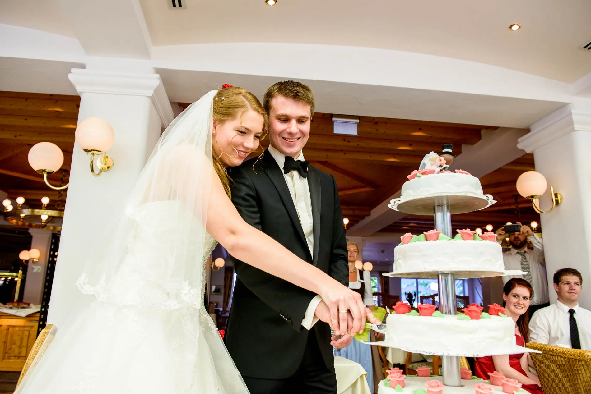 Auf der Terrasse des Hotels wartete die nächste Attraktion: eine vierstöckige Hochzeitstorte, kunstvoll verziert mit Marzipanrosen. Passend dazu trug die Braut einen Strauß aus roten Rosen – ein Detail, das sich wie ein roter Faden (oder besser: eine rote Rose) durch den Tag zog. Bei Kaffee und Kuchen genossen die Gäste die Aussicht, während die Torte Stück für Stück verschwand. Und ja, bei vier Etagen voller Marzipanrosen ging wirklich niemand leer aus – höchstens die Waage am nächsten Morgen.