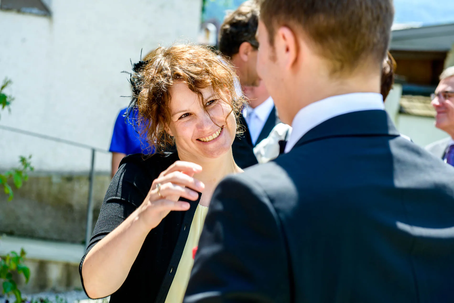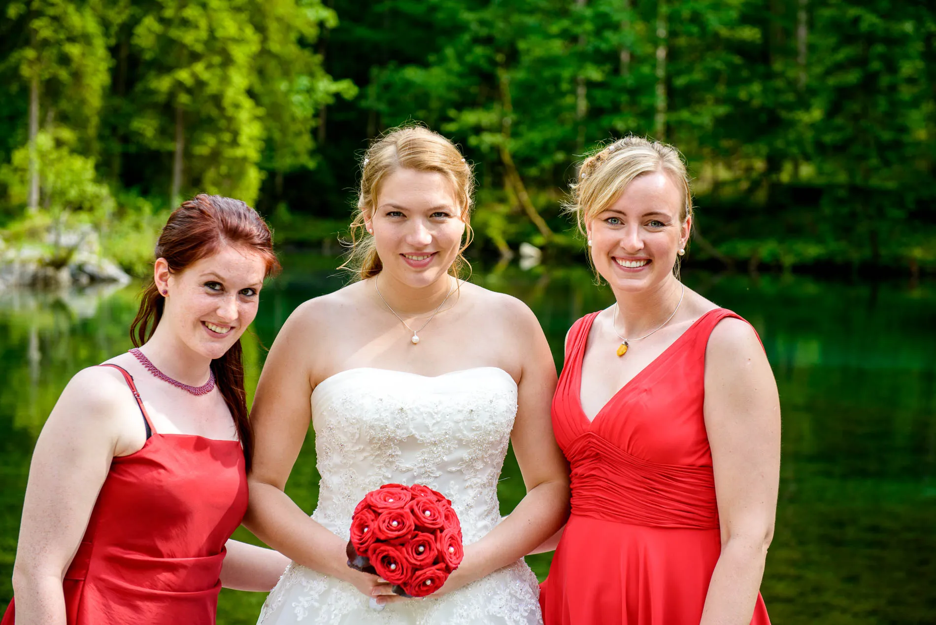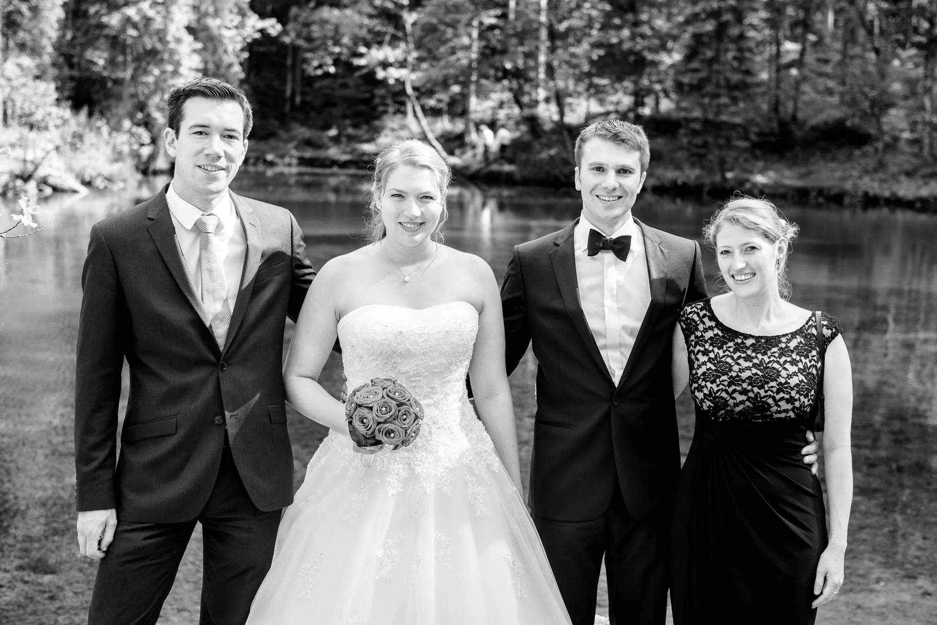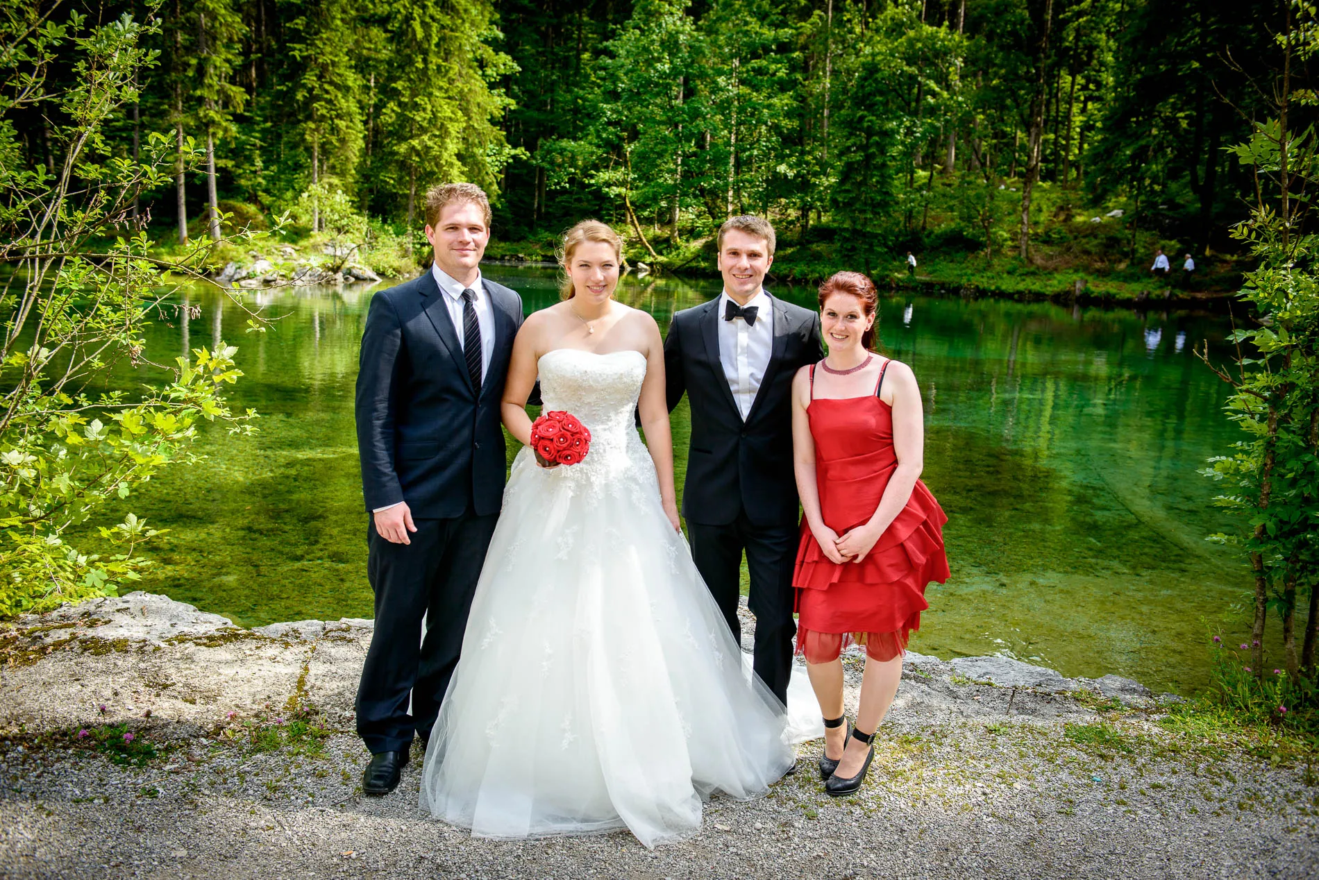Ein Highlight war das große Gruppenfoto am Seeufer. Mit Super-Weitwinkel-Objektiv und einer Portion Geduld gelang es, die gesamte Hochzeitsgesellschaft samt imposanter Bergkulisse einzufangen.