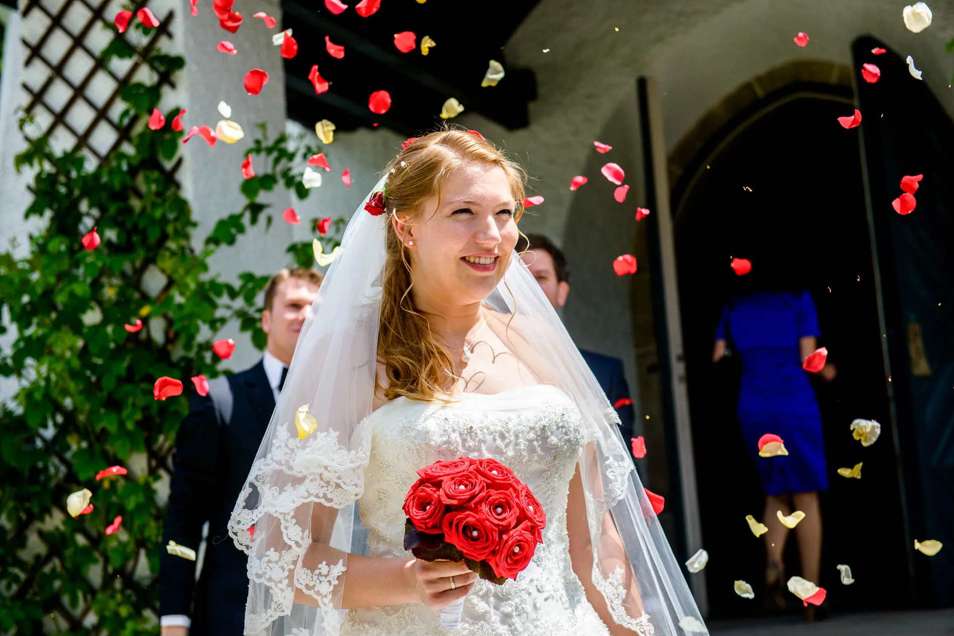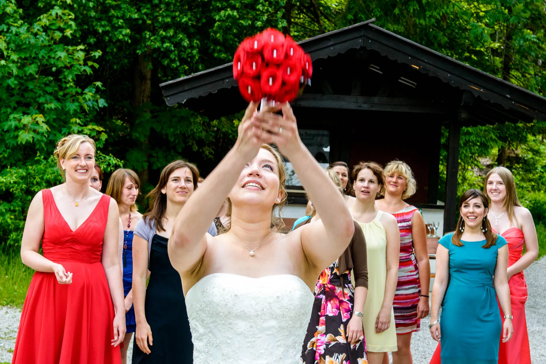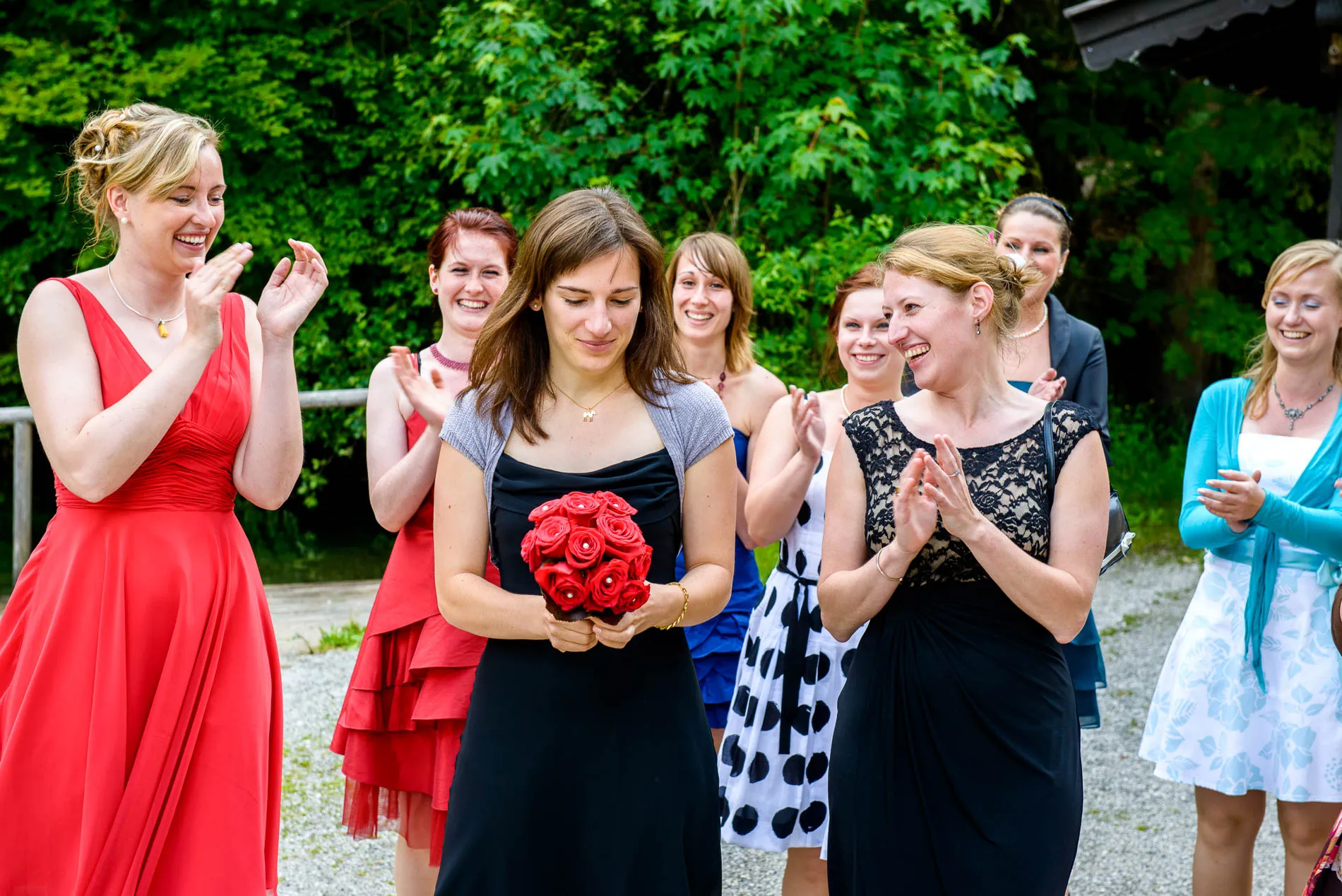 Natürlich durften auch die klassischen Programmpunkte nicht fehlen: Gruppenfotos, der Wurf des Brautstraußes und viele kleine Momente, die den Tag einzigartig machten. Besonders schön war, dass das Brautpaar schon am Nachmittag Zeit für diese Traditionen fand – so blieb der Abend entspannt und voller Leichtigkeit. Und noch ein Detail: In Bayern gibt es ja die charmante Tradition des Brautstrauß-Stehlens – wobei „stehlen“ hier eher in die Kategorie „spielerische Folklore“ fällt. Da der Strauß aber schon früh am Tag geworfen wurde, musste niemand Wache schieben oder gar über ein späteres Auslösen verhandeln. Praktisch und nervenschonend – und die Braut konnte sich entspannt dem Kuchen widmen.