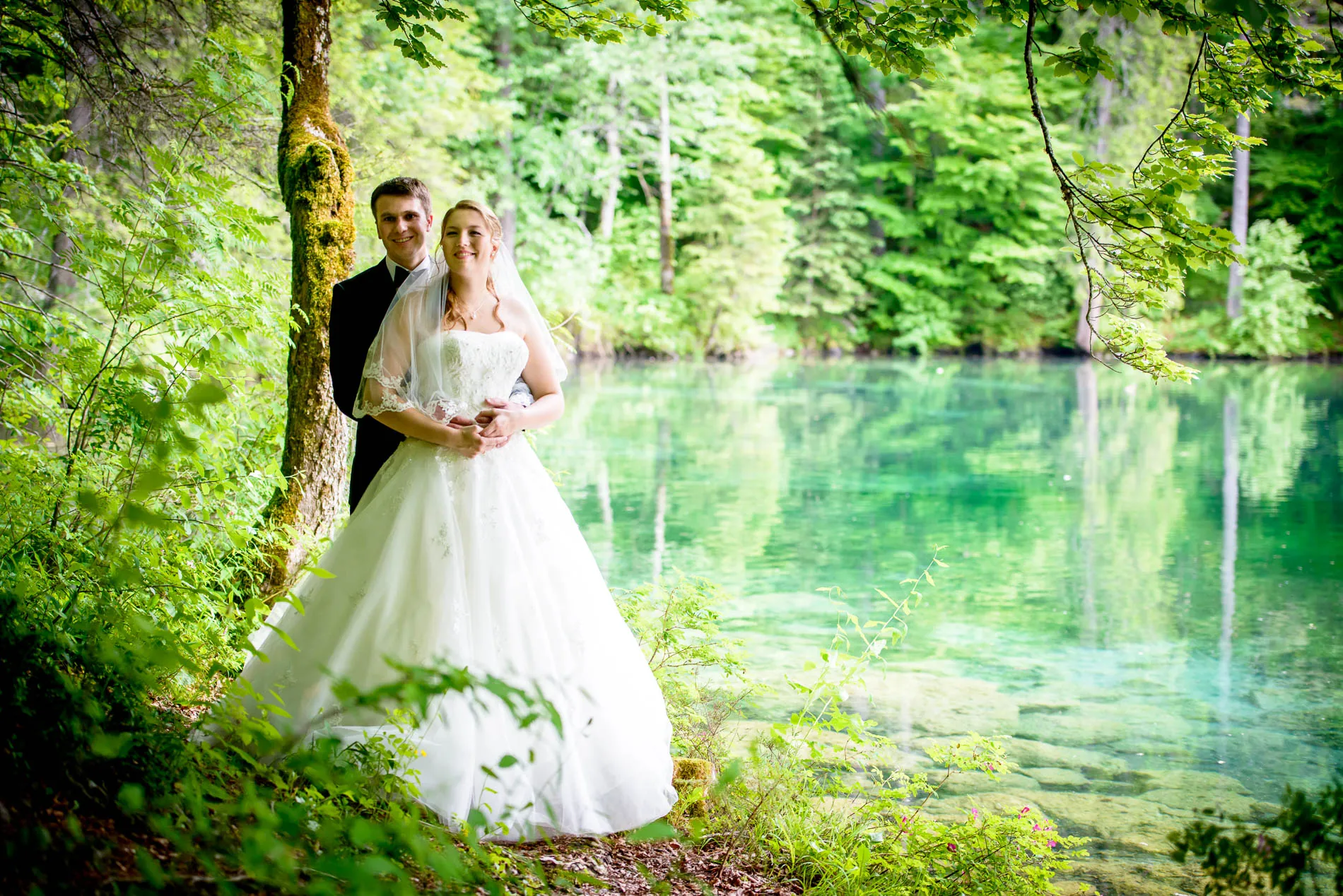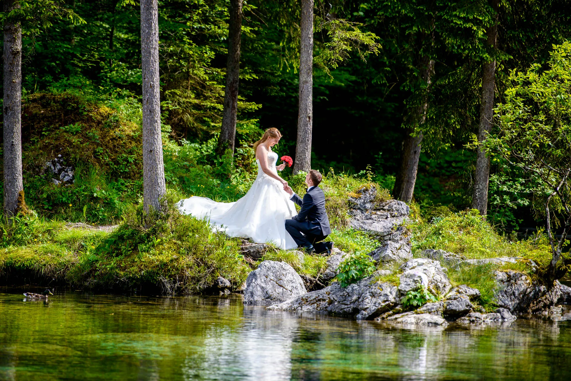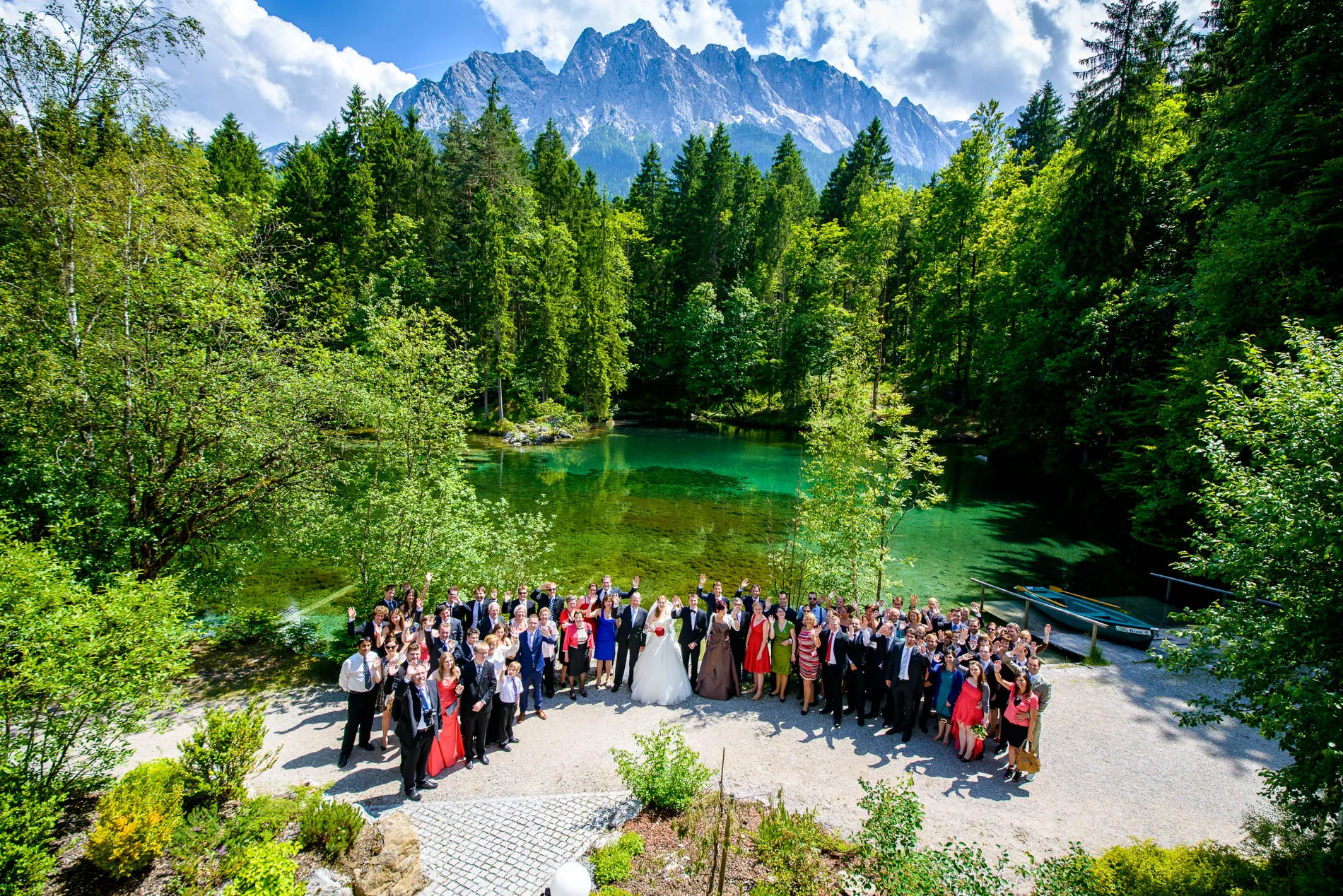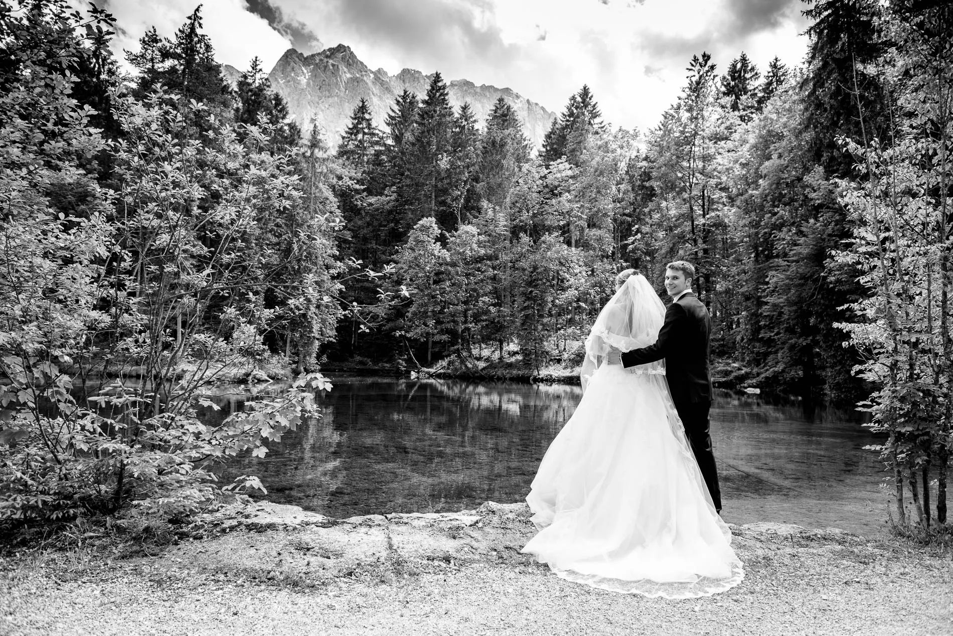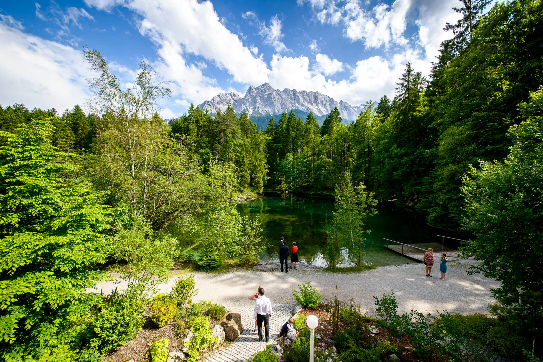 Nach den Gratulationen ging es weiter nach Grainau ins Hotel am Badersee. Wer schon einmal dort war, weiß: Dieser Ort ist fast schon eine Postkarte in 3D. Der kleine See direkt am Hotel, eingerahmt von Wald und mit der Zugspitze im Hintergrund, ist ein Traum für jedes Brautpaar – und für jeden Hochzeitsfotografen sowieso.