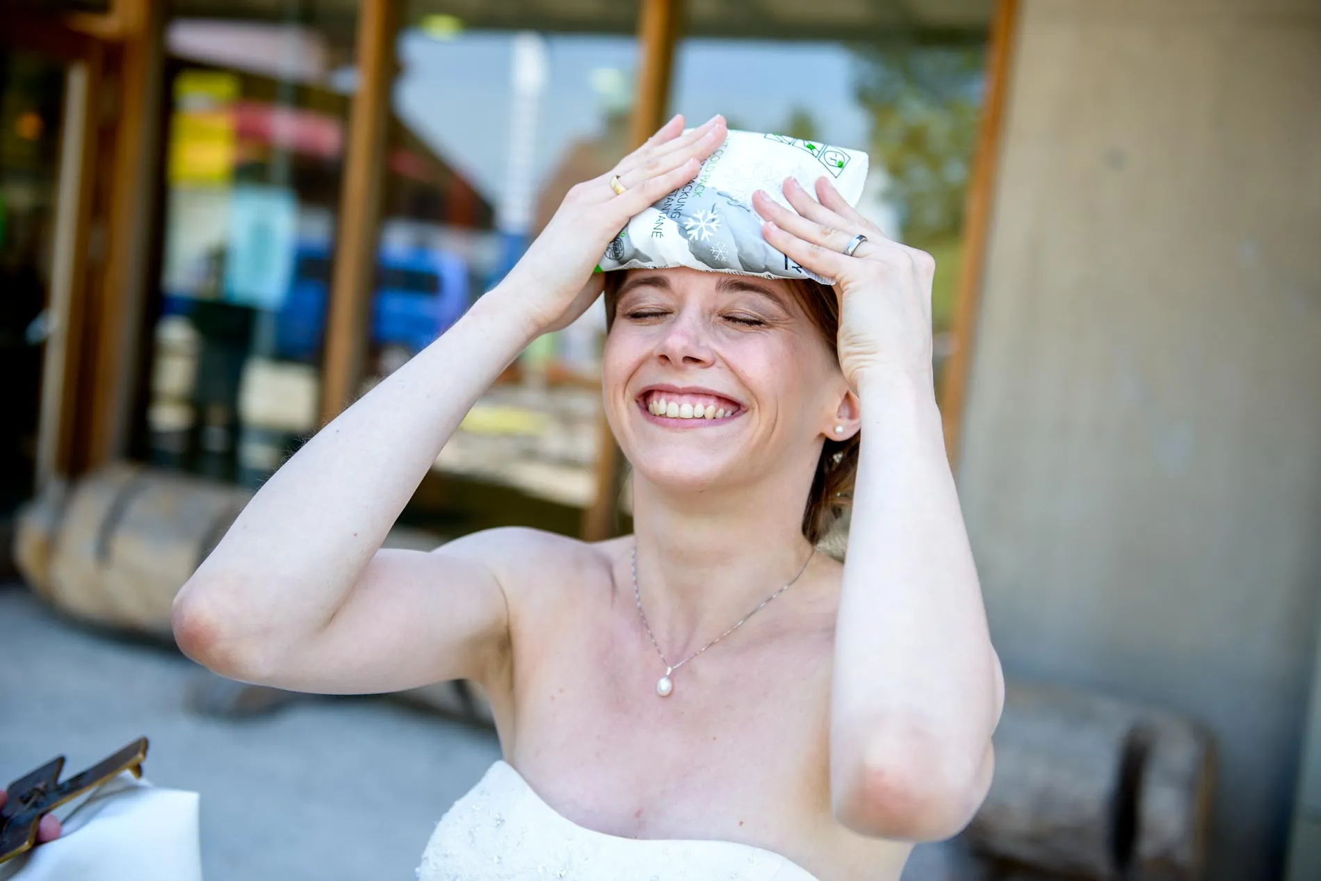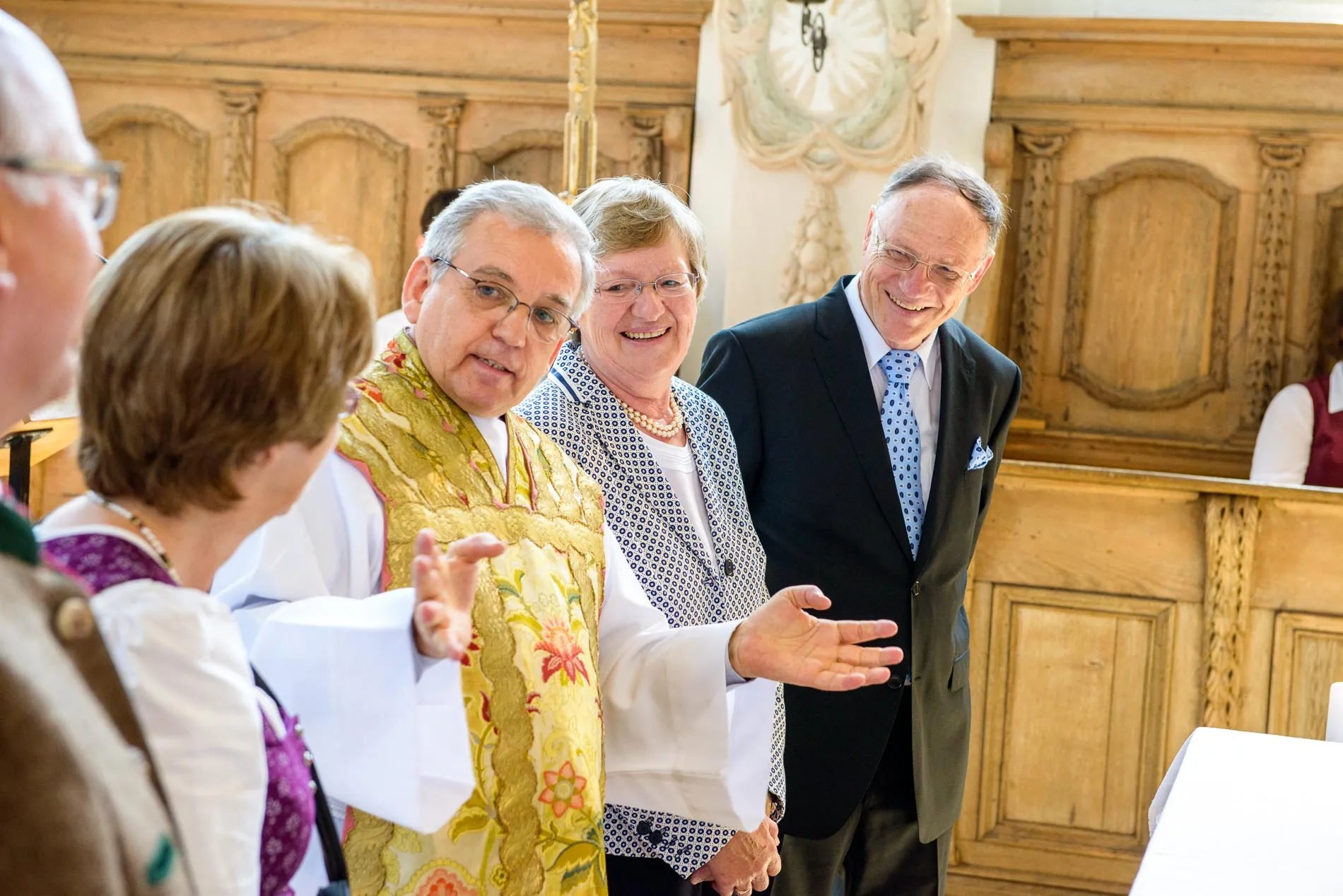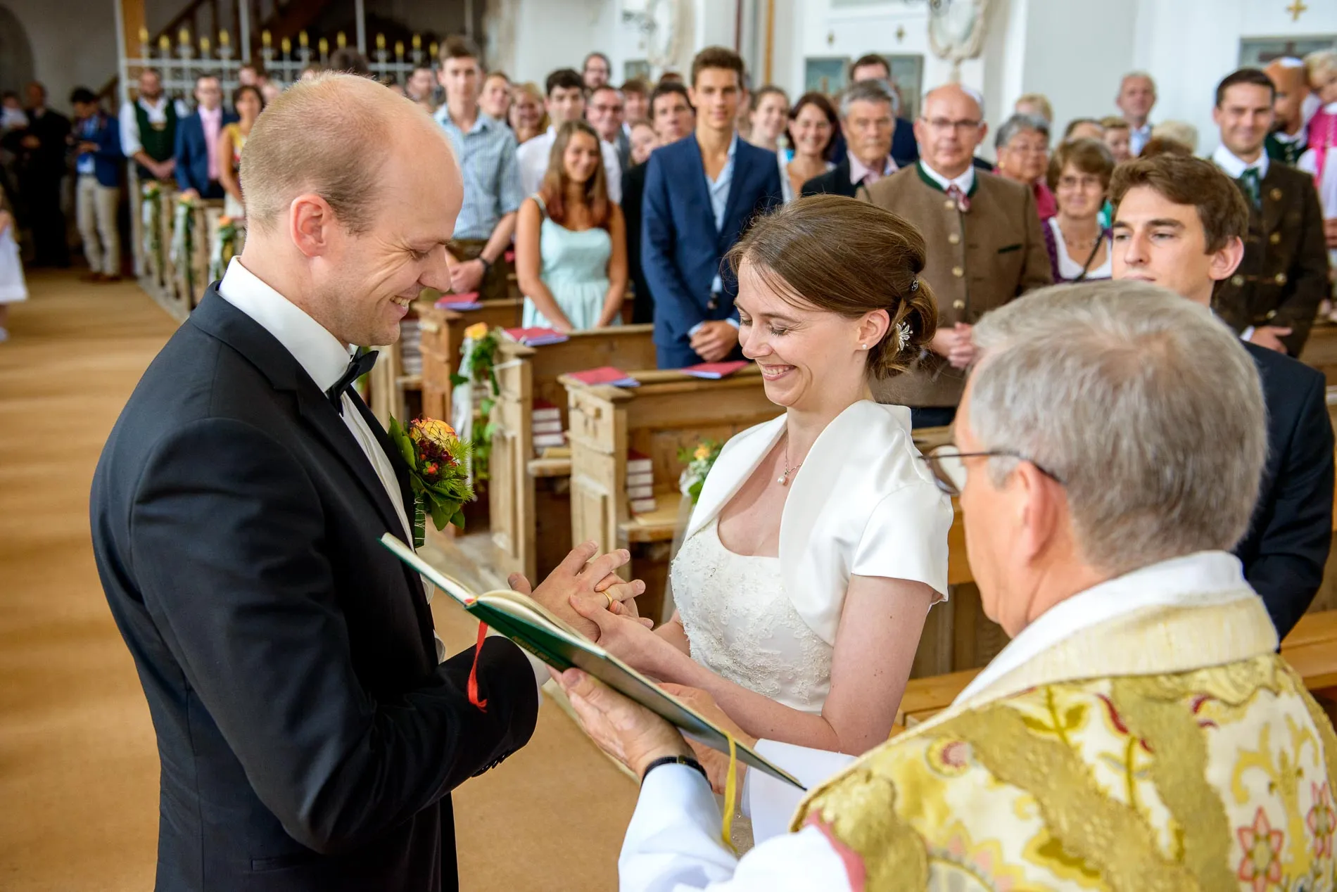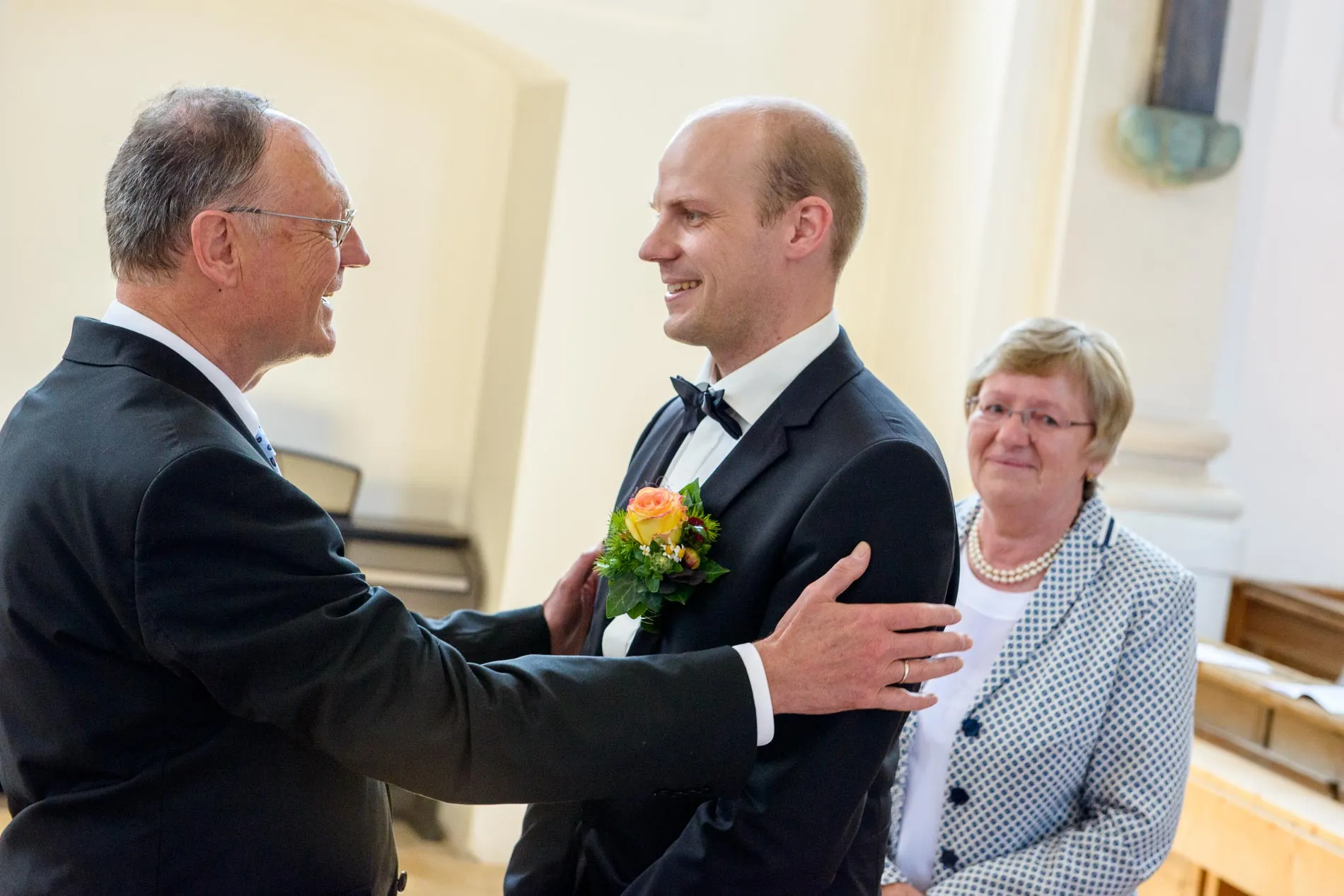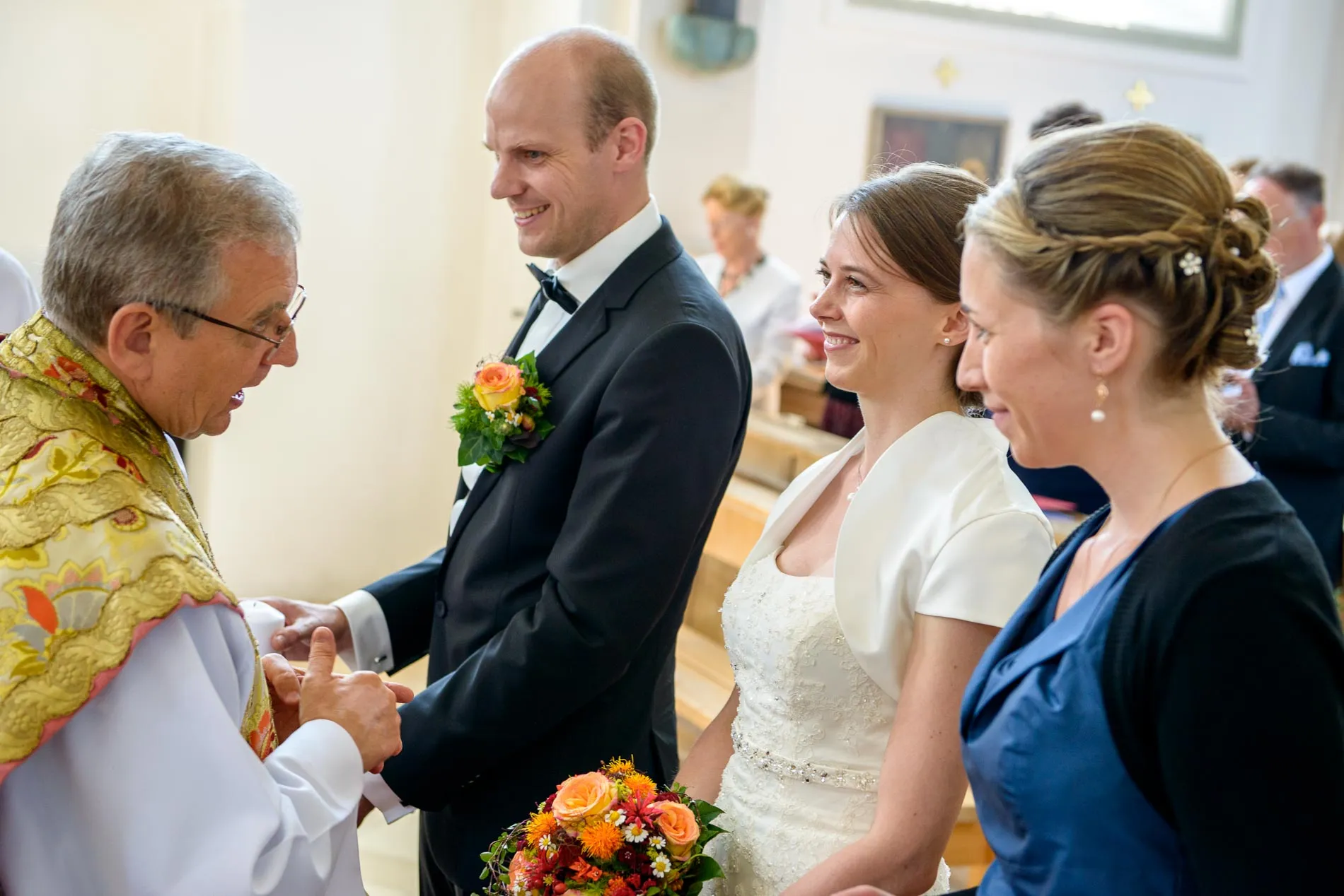 Die Pfarrkirche St. Johann Baptist ist ein barockes Schmuckstück, das schon beim Betreten eine gewisse Feierlichkeit ausstrahlt. Während der Trauung gab es eine kleine Besonderheit: Der Pfarrer bat die Eltern des Brautpaares nach vorne. Ein Moment, der zeigte, dass auch in jahrhundertealten Mauern Platz für kleine Neuerungen ist. Nach dem Ja‑Wort gab es dann das erste Geschenk – einen Eisbeutel. Praktisch, kühlend und ehrlich gesagt das sinnvollste Präsent des Tages.