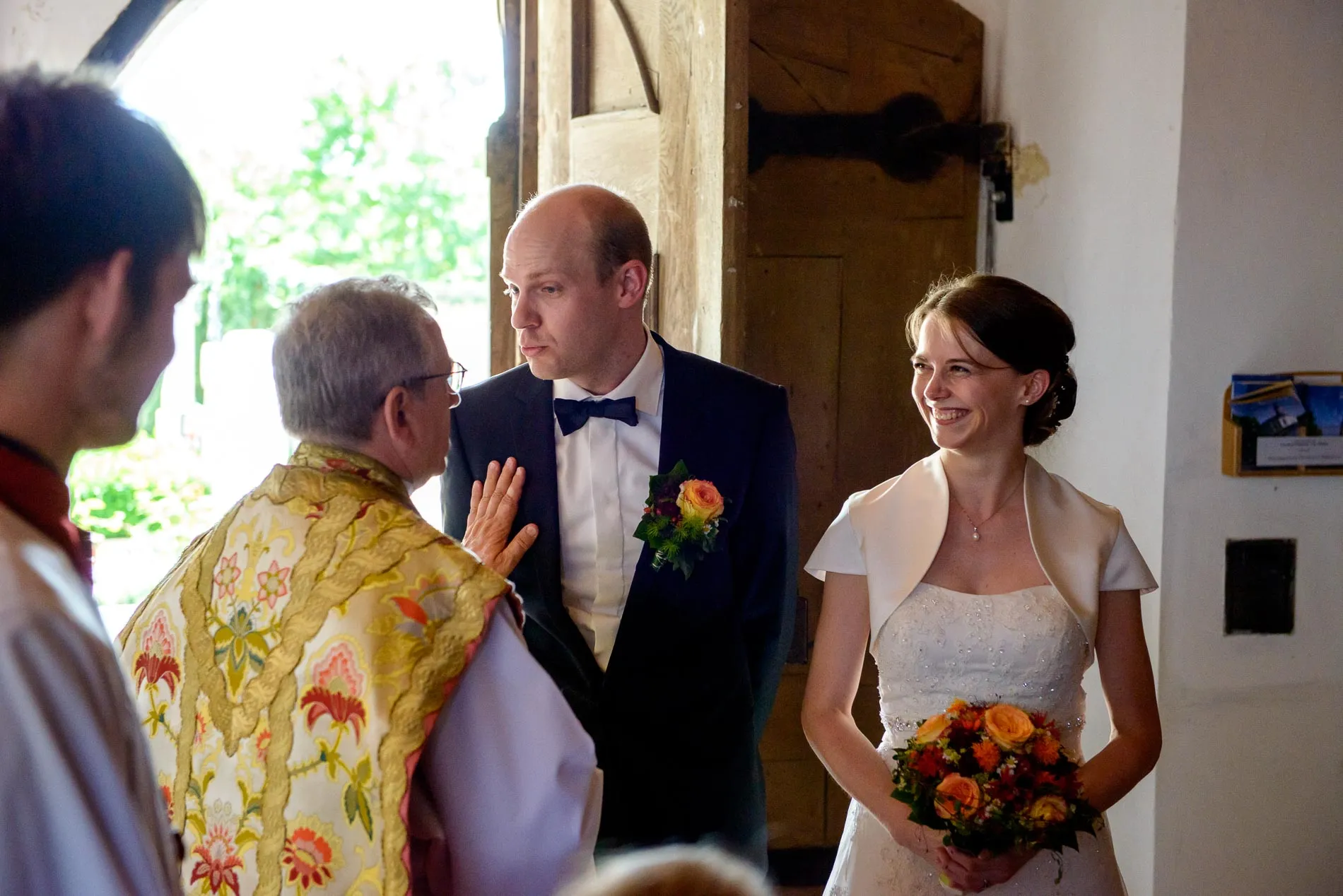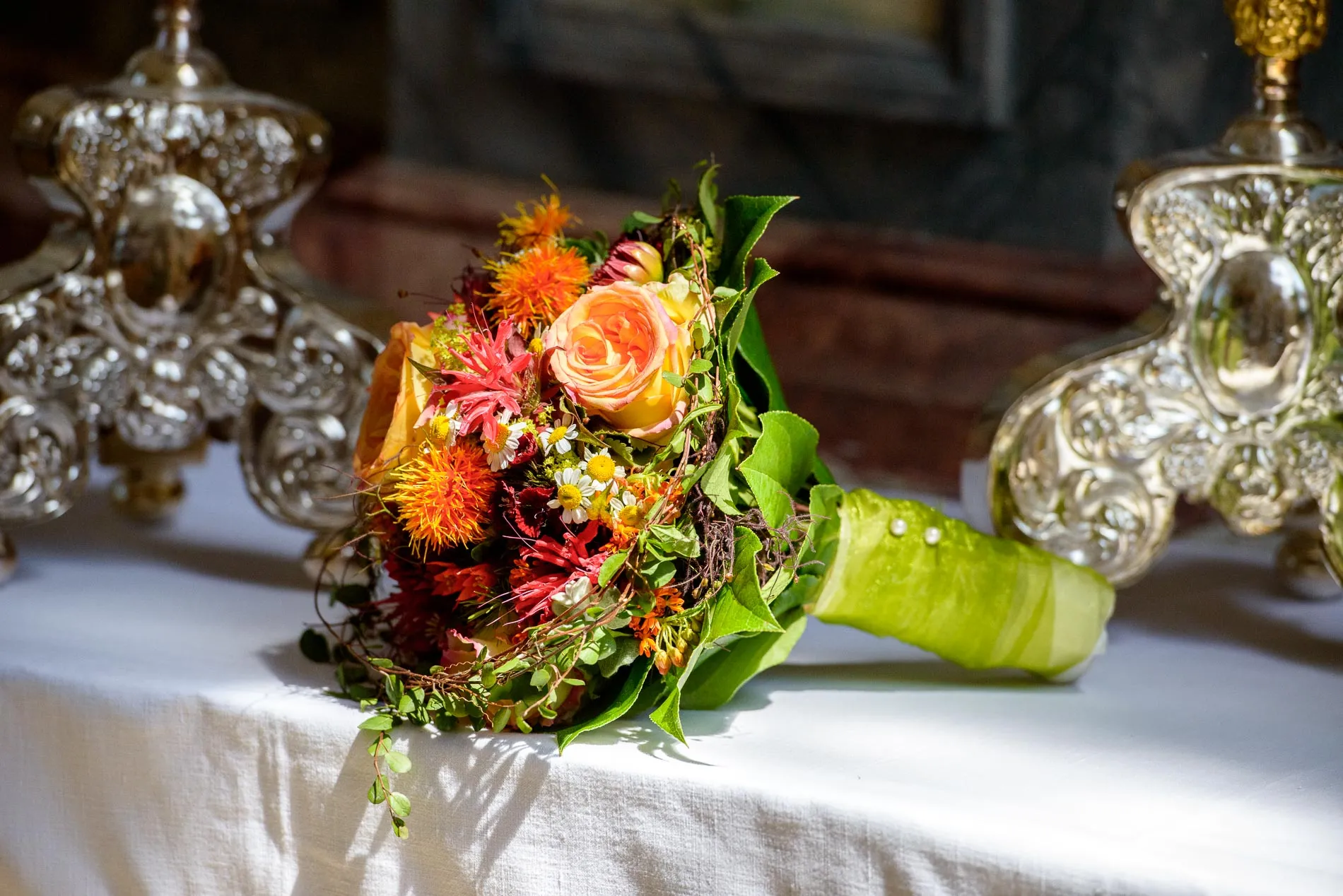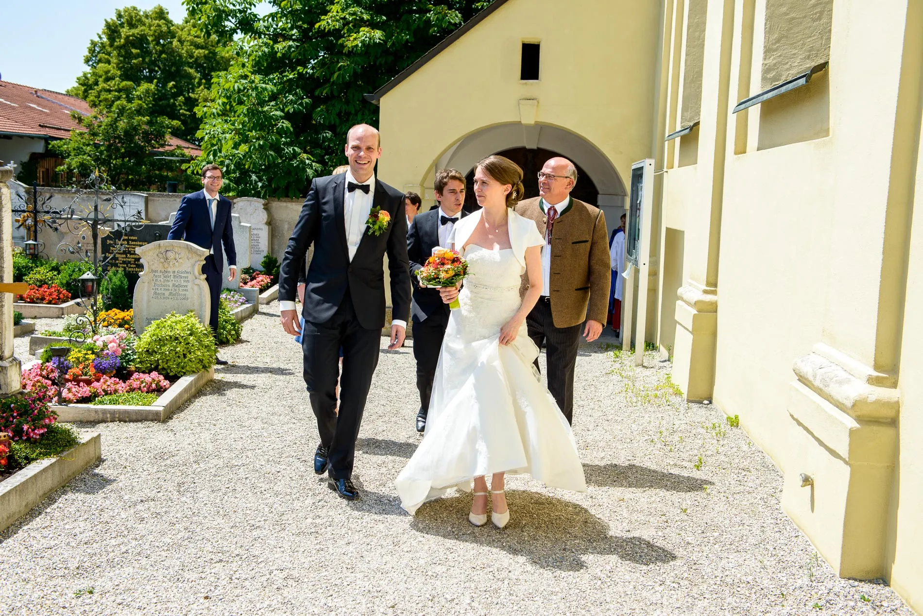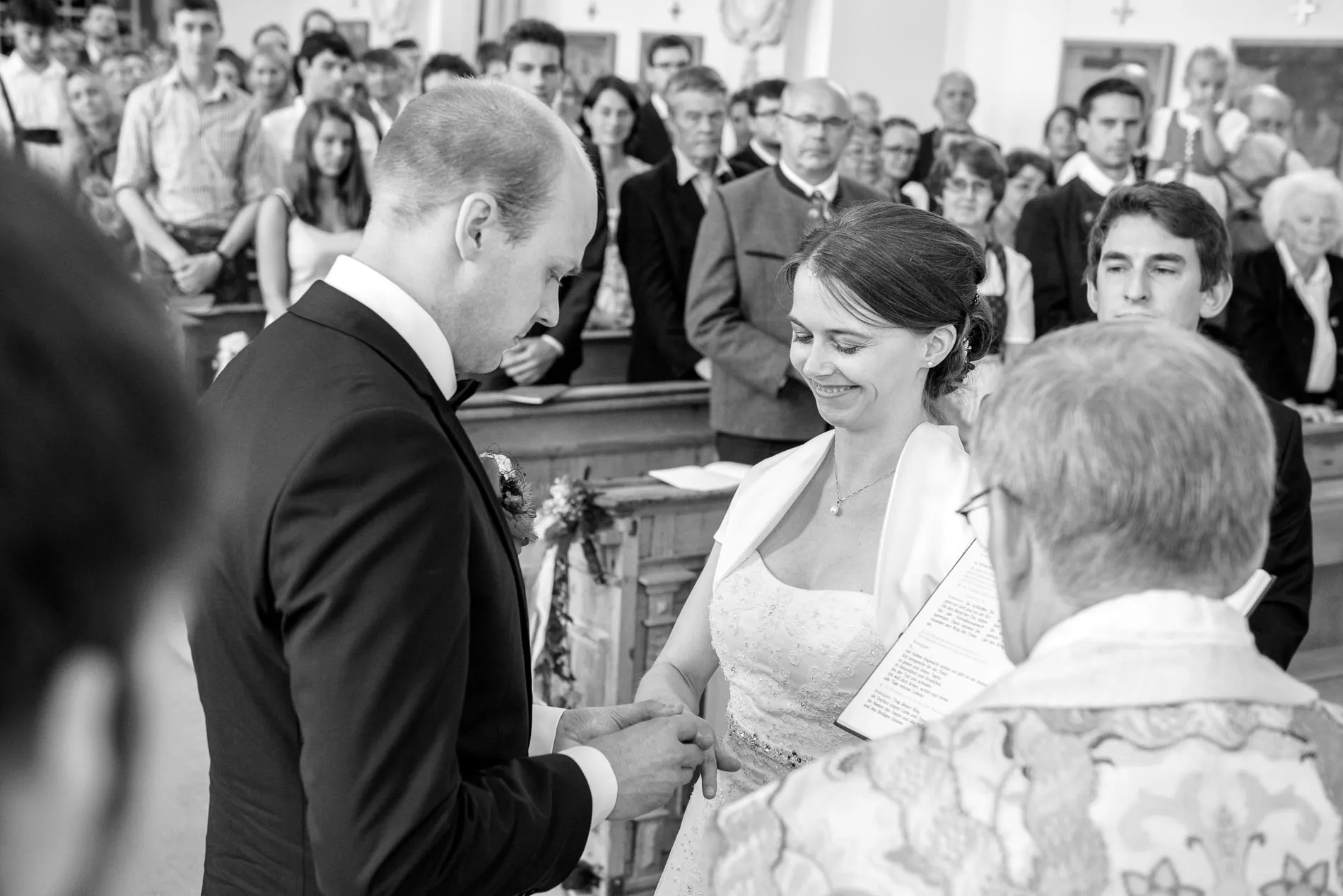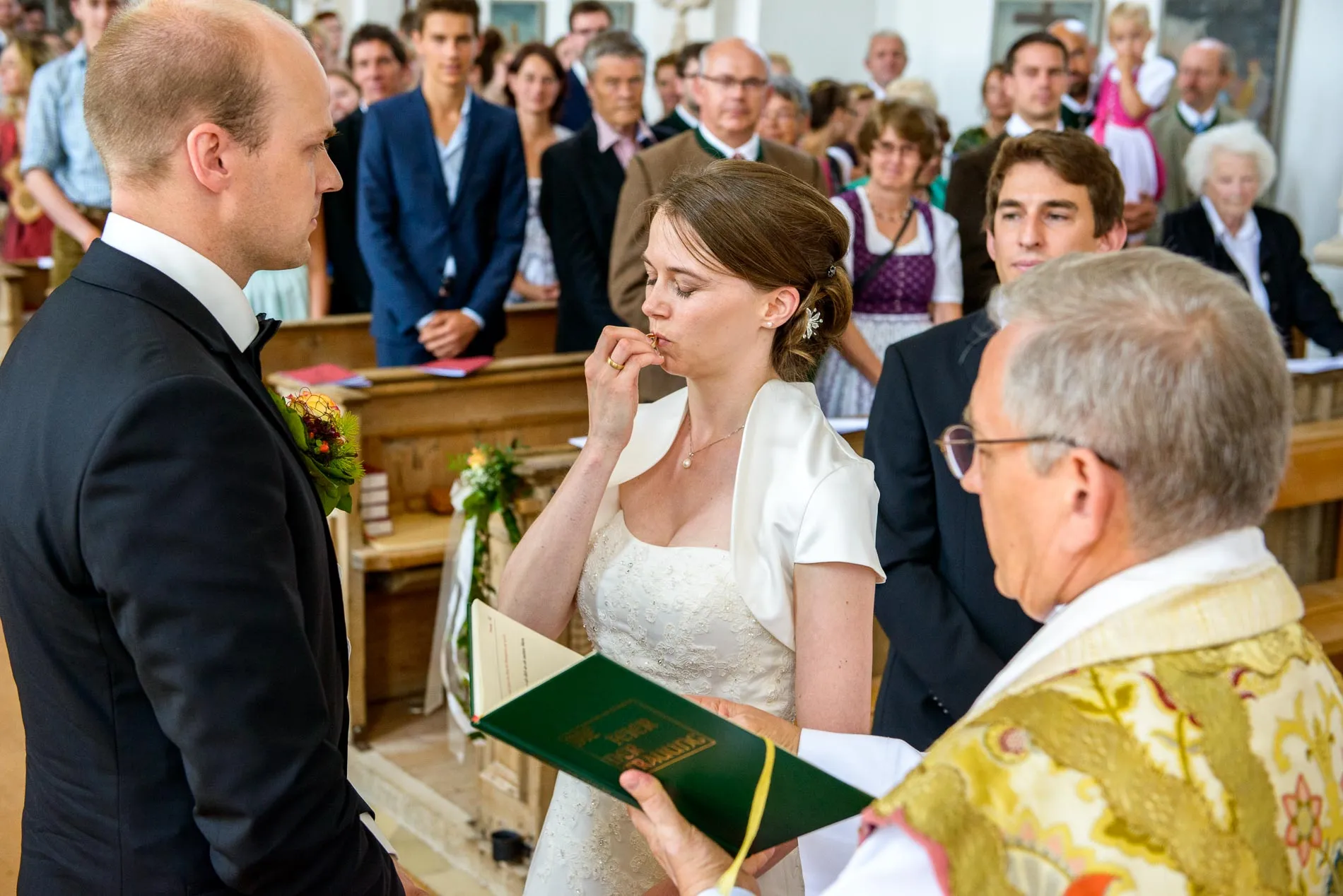 Die Pfarrkirche St. Johann Baptist ist ein barockes Schmuckstück, das schon beim Betreten eine gewisse Feierlichkeit ausstrahlt. Während der Trauung gab es eine kleine Besonderheit: Der Pfarrer bat die Eltern des Brautpaares nach vorne. Ein Moment, der zeigte, dass auch in jahrhundertealten Mauern Platz für kleine Neuerungen ist. Nach dem Ja‑Wort gab es dann das erste Geschenk – einen Eisbeutel. Praktisch, kühlend und ehrlich gesagt das sinnvollste Präsent des Tages.