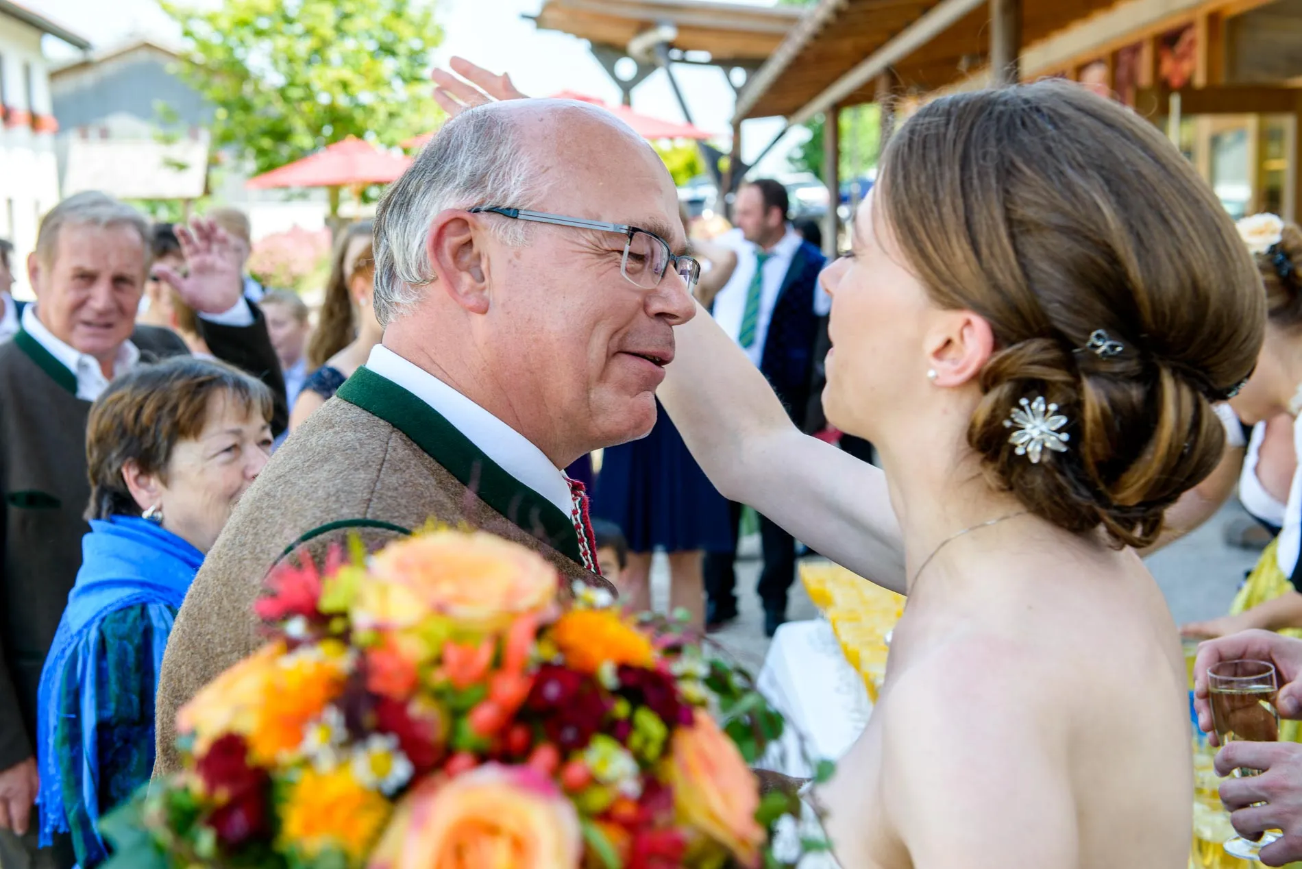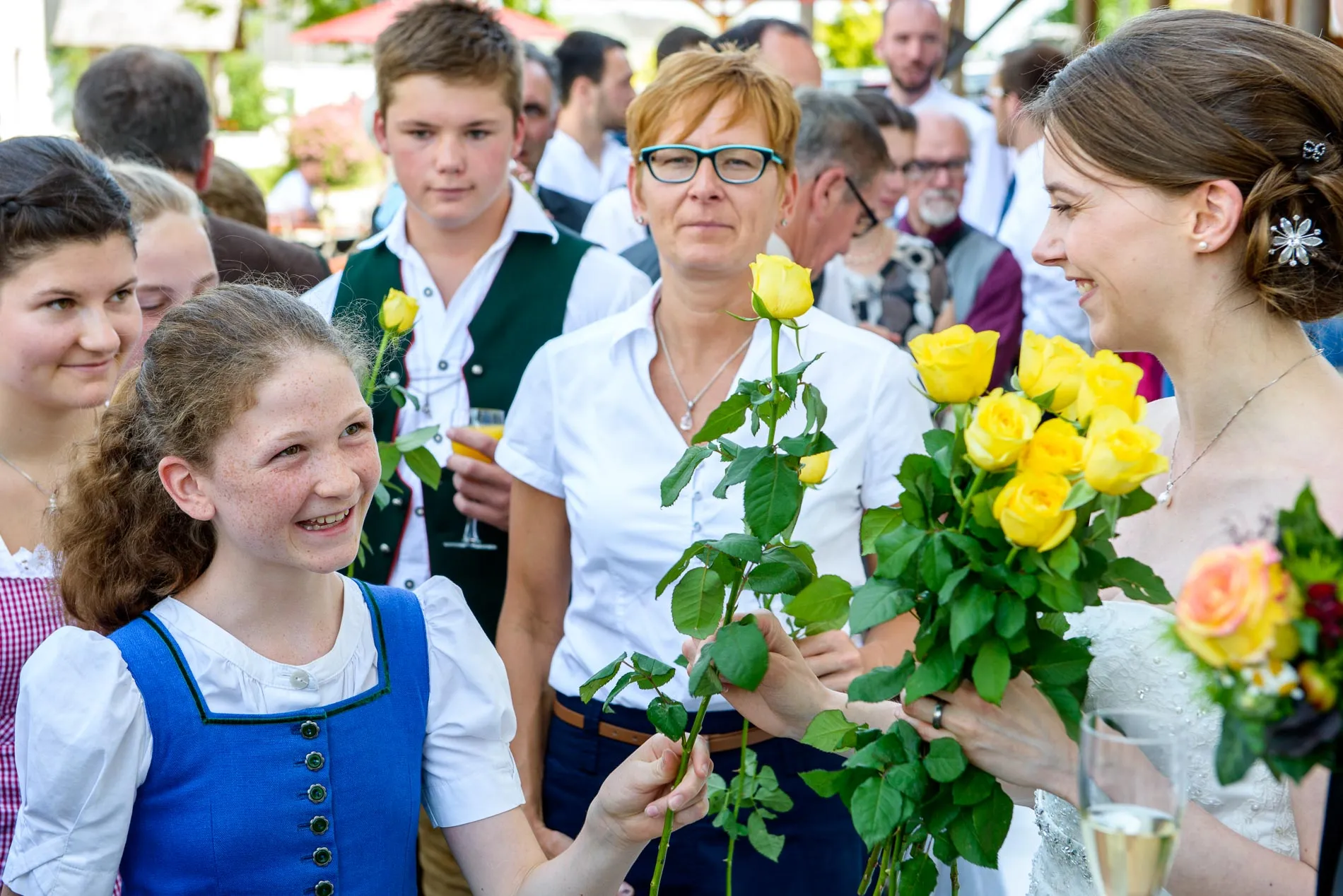 Draußen warteten die Gäste im Schatten, um ihre Glückwünsche zu überbringen. Besonders auffällig: die gelben Rosen, die der Braut überreicht wurden. Ein Farbspiel, das sich später auch in den Fotos wiederfand. Trotz der Hitze war die Stimmung erstaunlich energiegeladen – vielleicht lag es daran, dass jeder wusste, dass im Trachtenheim bald die Tanzfläche eröffnet wird.
