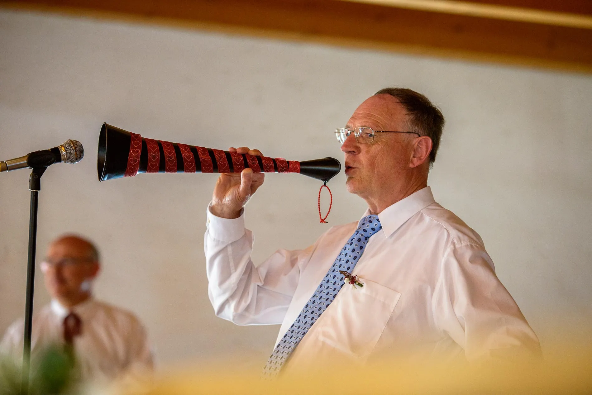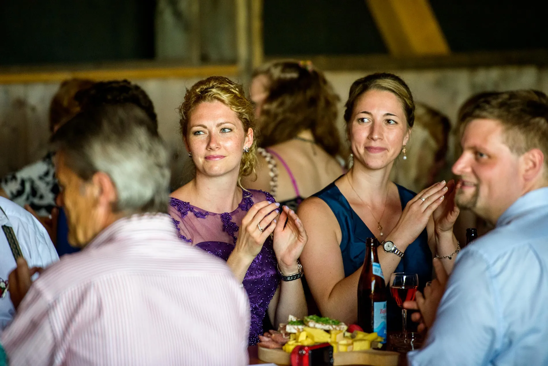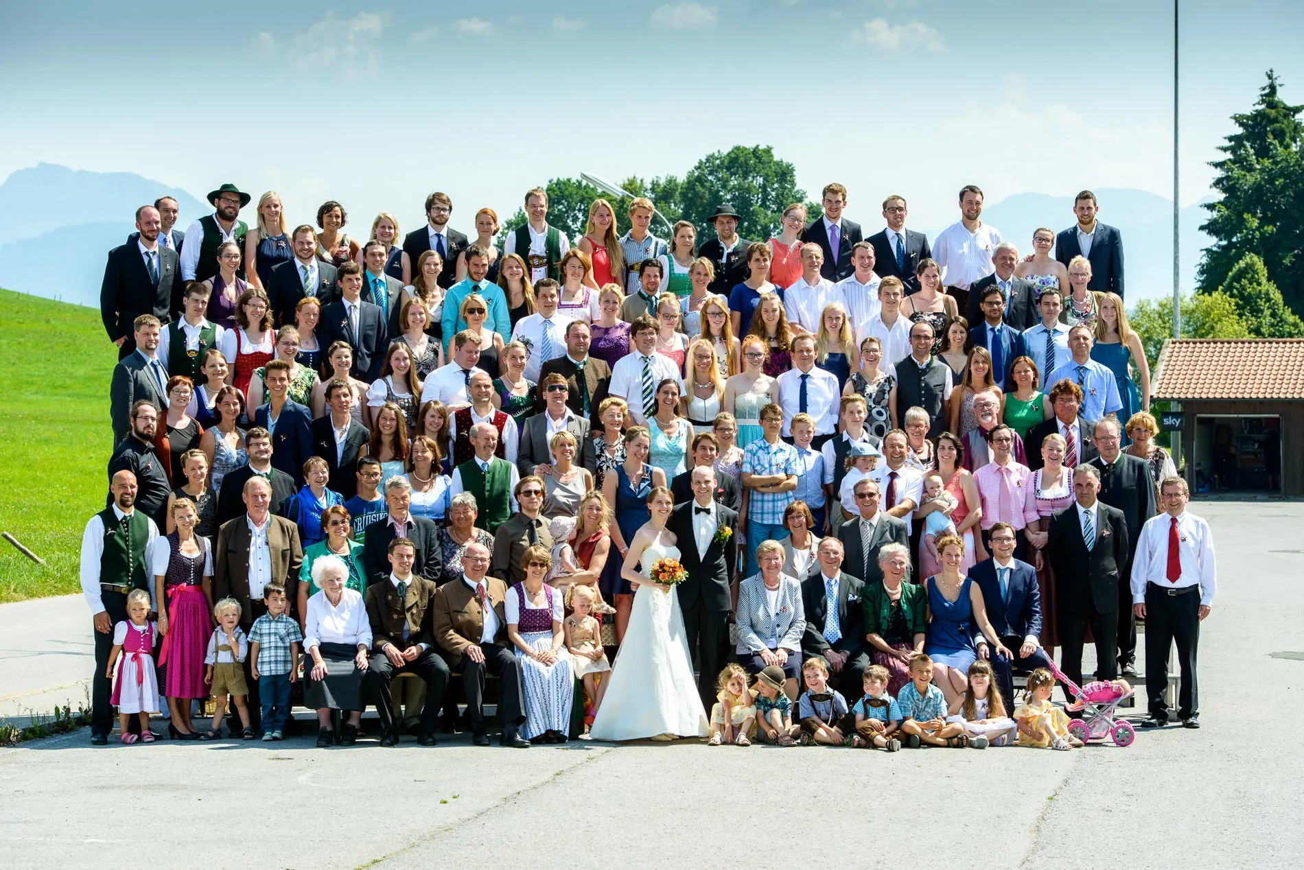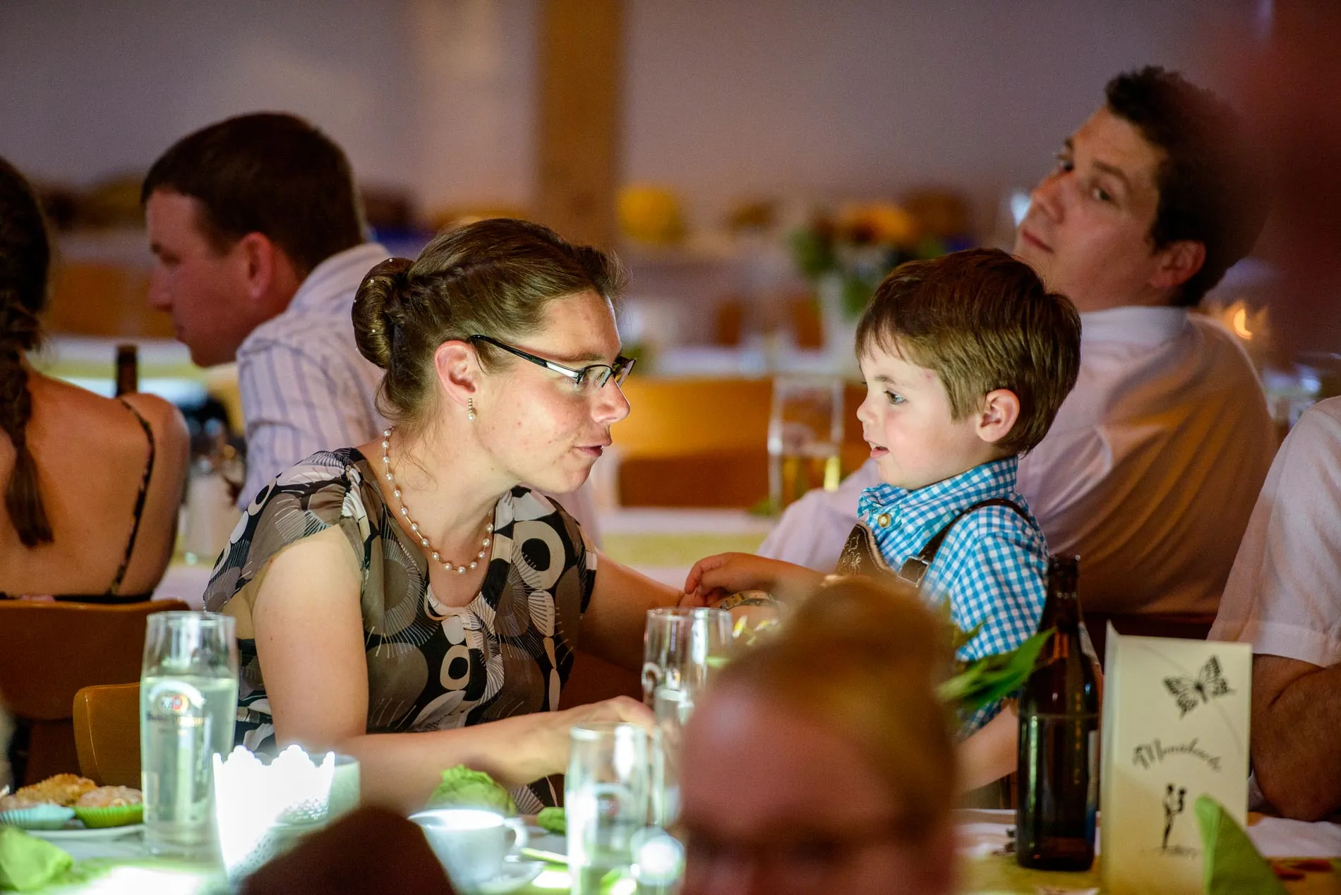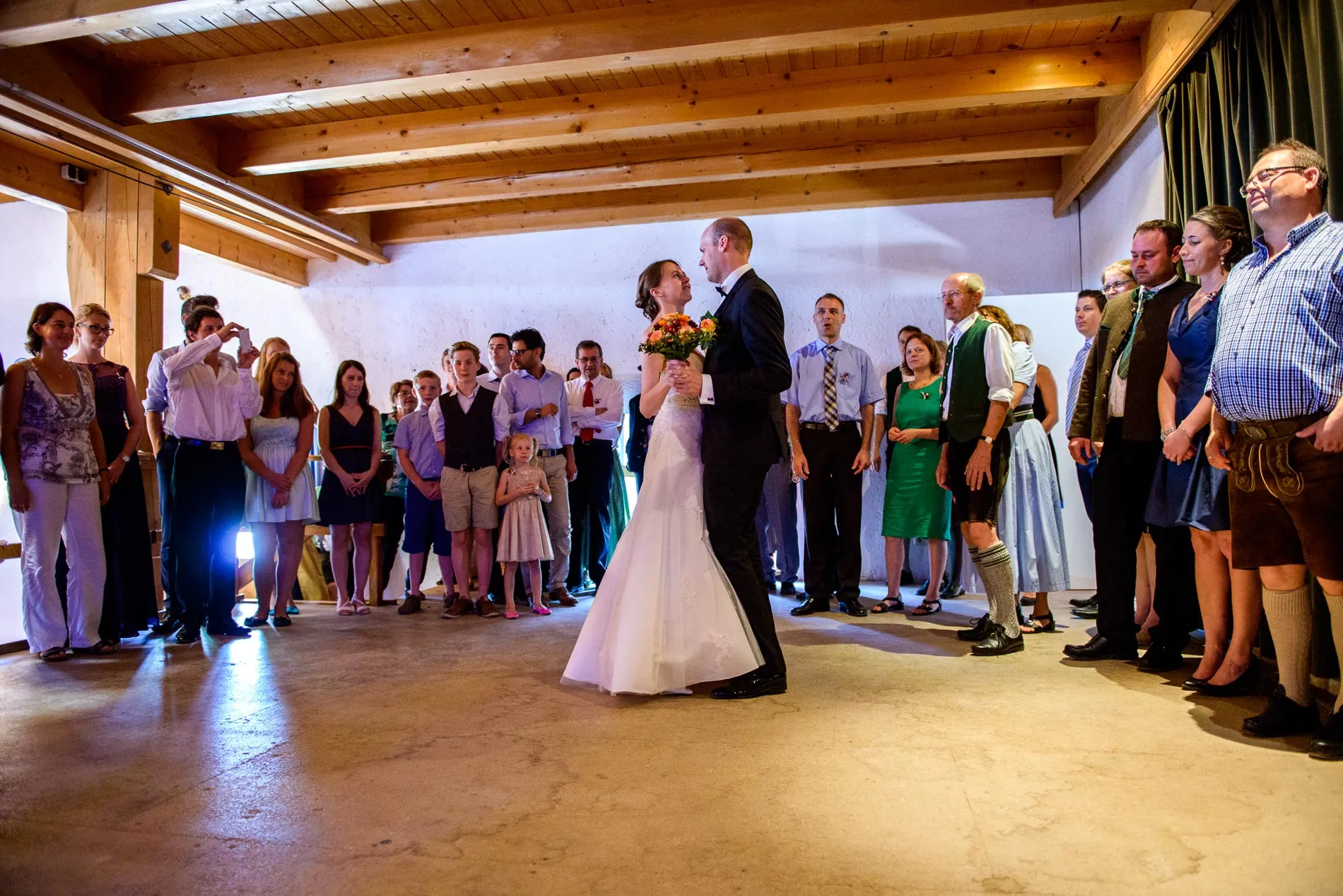 Das Trachtenheim ist eine Location, die weiß, wie man Hochzeiten feiert: großer Saal, Bühne, Empore und genug Platz für Musik, Tanz und Reden. Vor dem Gebäude entstand das Gruppenfoto, bevor die Band das Brautpaar und die Gäste in den Saal spielte. Dort folgte das Pflichtprogramm: Hochzeitstorte anschneiden, humorvolle Reden der Väter und der Brautwalzer. Typisch bayerisch: Schon am Nachmittag war die Tanzfläche eröffnet – schließlich will man ja nicht riskieren, dass jemand zu lange sitzt.