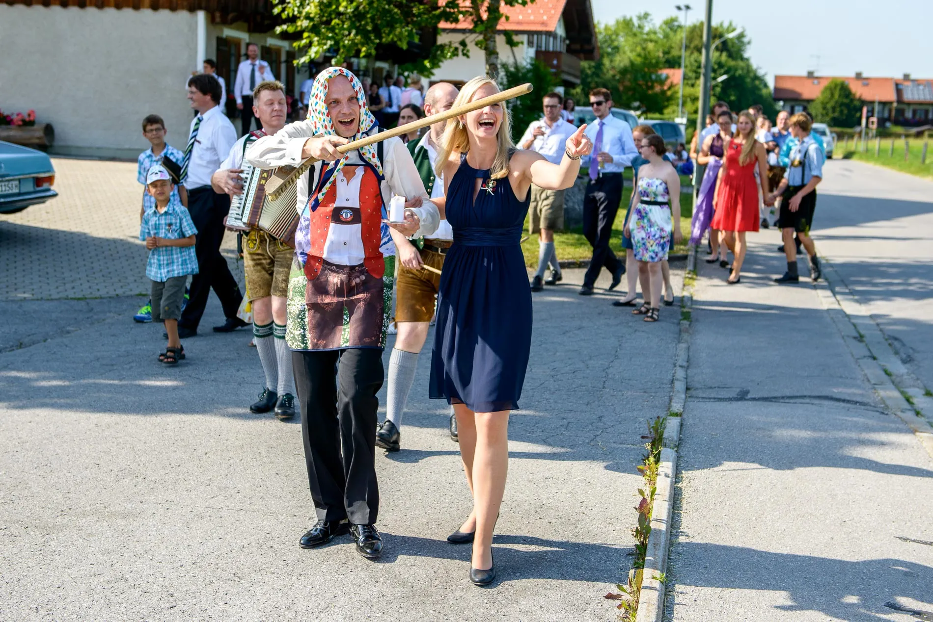 Kaum war der Walzer getanzt, war die Braut auch schon verschwunden. Der Bräutigam, abgelenkt durch eine andere Tanzpartnerin, bekam Kopftuch, Schürze, Besen und Kerze verpasst – die klassische Ausstattung für die Suche. Nach kurzer Zeit fand er seine Braut im Heustadel nebenan. Dort begann die ausgelassene Party, die schnell eskalierte in Richtung „Tanzen auf den Bänken“. Die Band heizte ein, die Gäste schwitzten, und die Stimmung war auf dem Höhepunkt. Wer behauptet, Tradition sei langweilig, hat hier wohl noch nie getanzt.