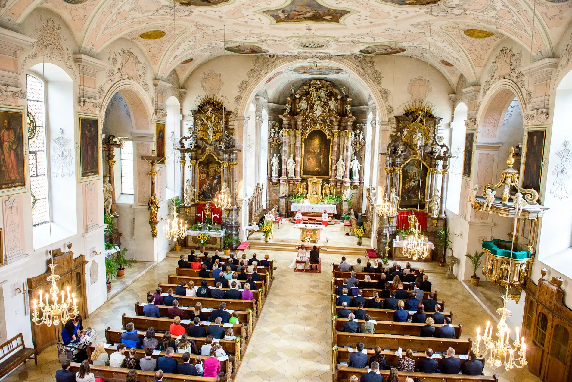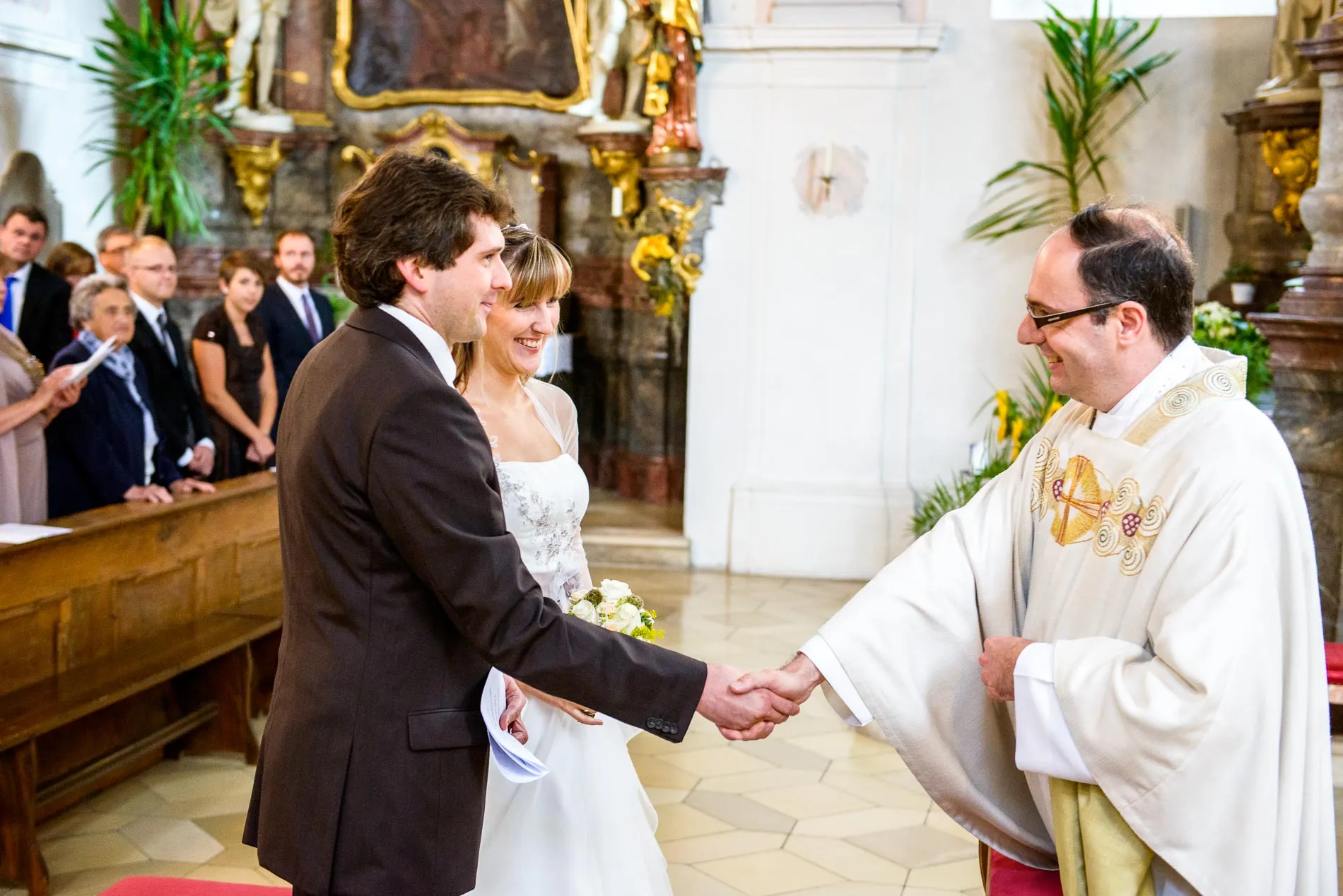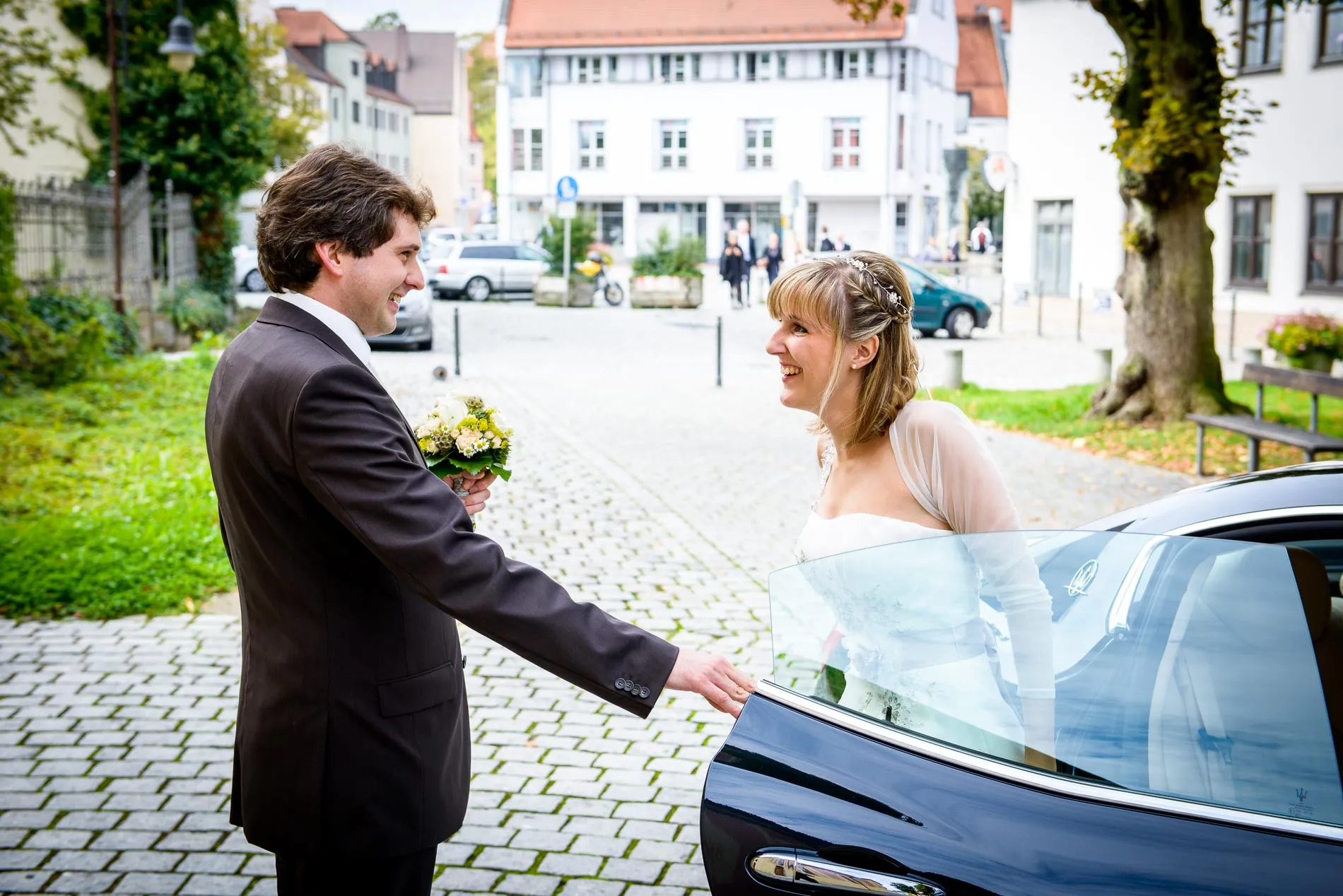 Die kirchliche Trauung fand in der Heilig‑Geist‑Kirche im Zentrum von Neuburg statt. Ein klassischer Ort, der schon beim Einzug für Gänsehaut sorgt. Der Bräutigam wartete – wie es die Tradition verlangt – vor der Kirche und begrüßte die Gäste. Die Braut wurde „angeliefert“ und beim First Look war die Begeisterung des Bräutigams so offensichtlich, dass man fast meinte, er hätte gerade das schönste Geschenk seines Lebens ausgepackt.