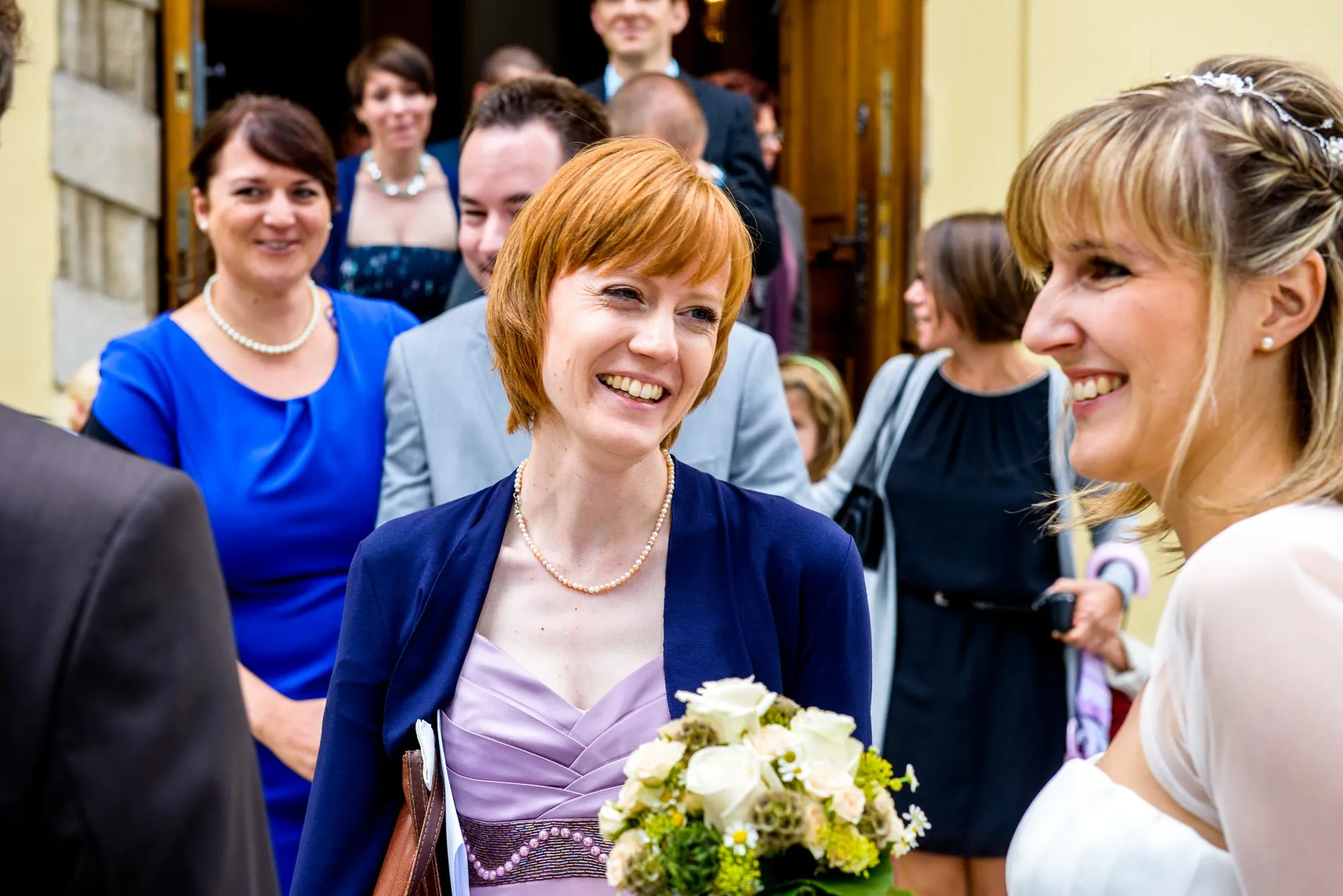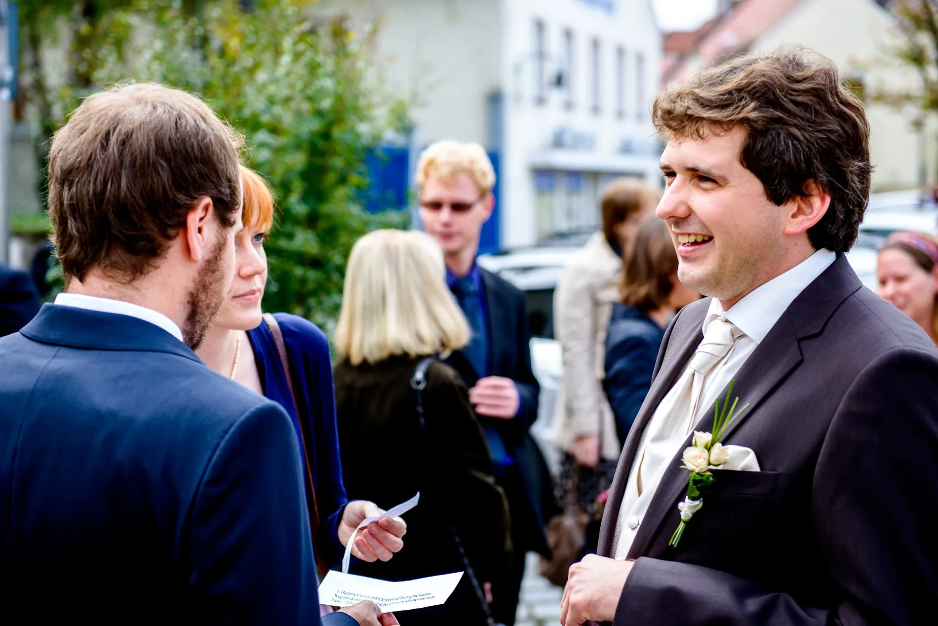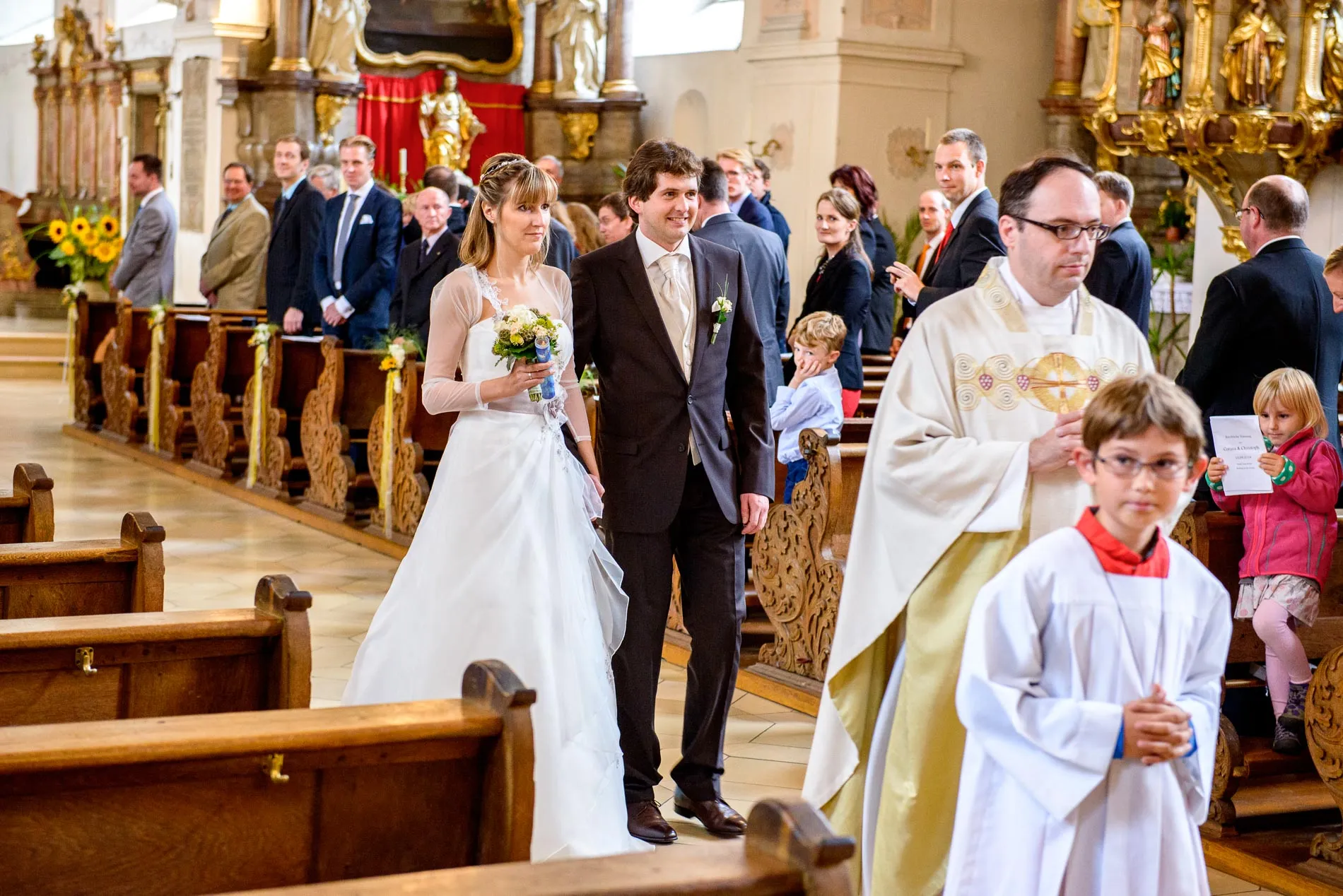 Die kirchliche Trauung fand in der Heilig‑Geist‑Kirche im Zentrum von Neuburg statt. Ein klassischer Ort, der schon beim Einzug für Gänsehaut sorgt. Der Bräutigam wartete – wie es die Tradition verlangt – vor der Kirche und begrüßte die Gäste. Die Braut wurde „angeliefert“ und beim First Look war die Begeisterung des Bräutigams so offensichtlich, dass man fast meinte, er hätte gerade das schönste Geschenk seines Lebens ausgepackt.