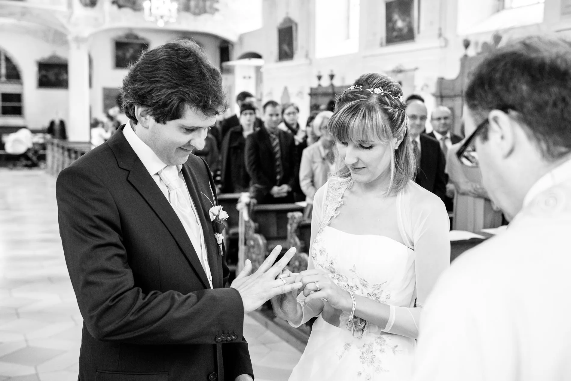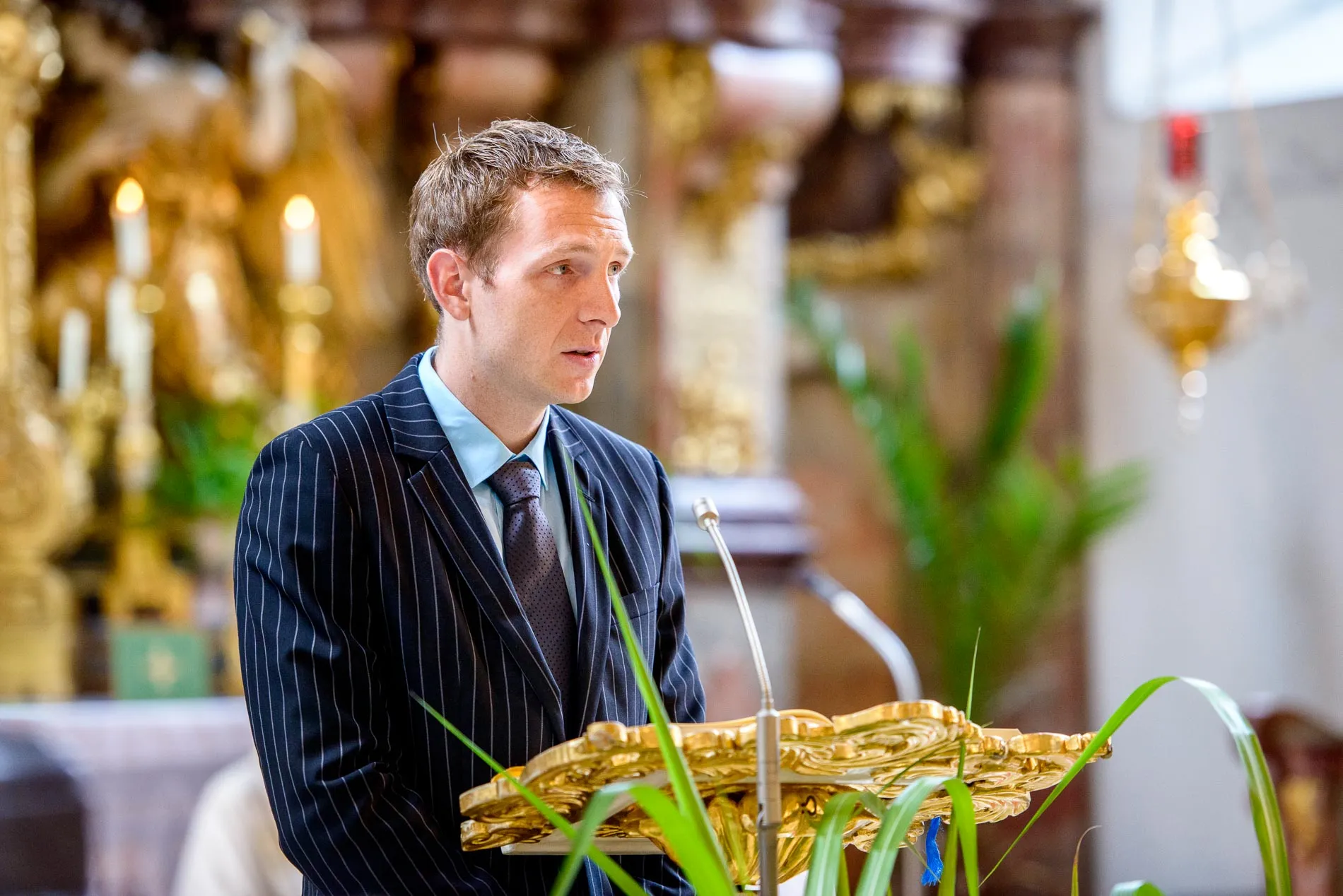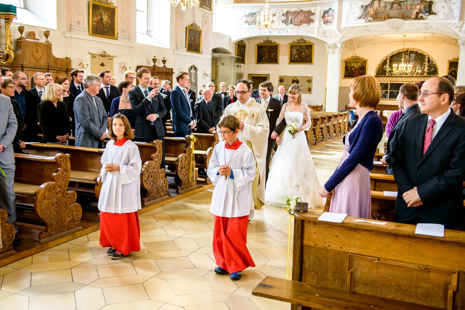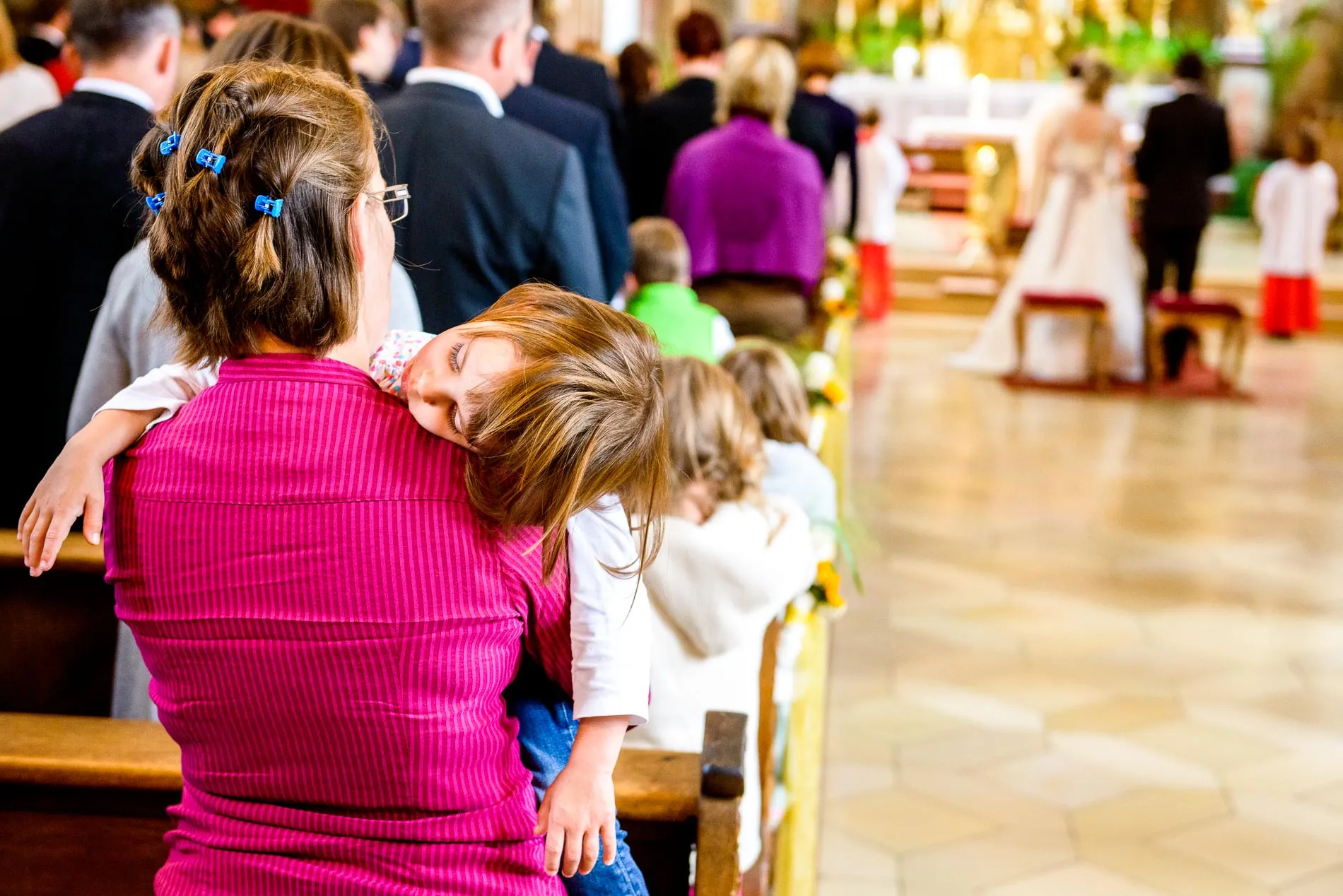Gemeinsam zog das Brautpaar in die Kirche ein, begleitet vom Pfarrer und zwei Ministranten. Viele Kinder waren dabei – und wie jeder Hochzeitsfotograf weiß: Kinder sind die heimlichen Stars jeder Trauung. Während die Predigt ihre Länge auskostete, schlief ein Kind friedlich auf dem Arm seiner Mutter ein. Ein Bild, das mehr über die Ruhe des Moments sagt als jede Predigt.