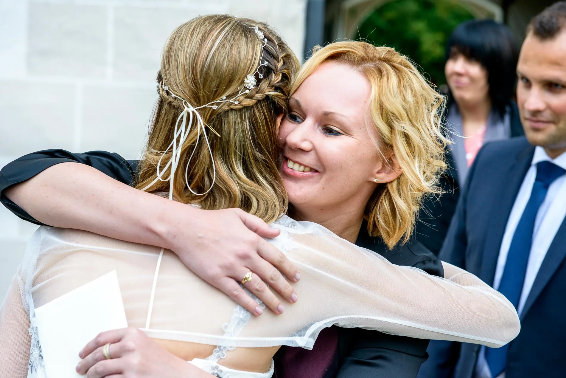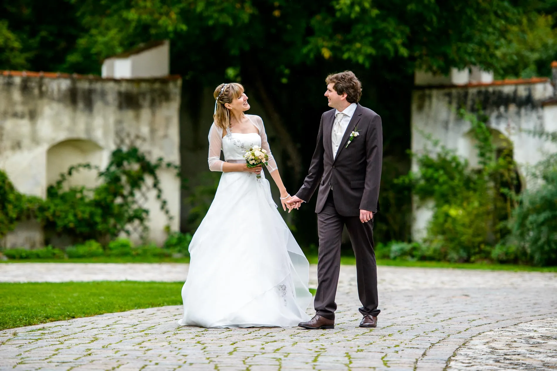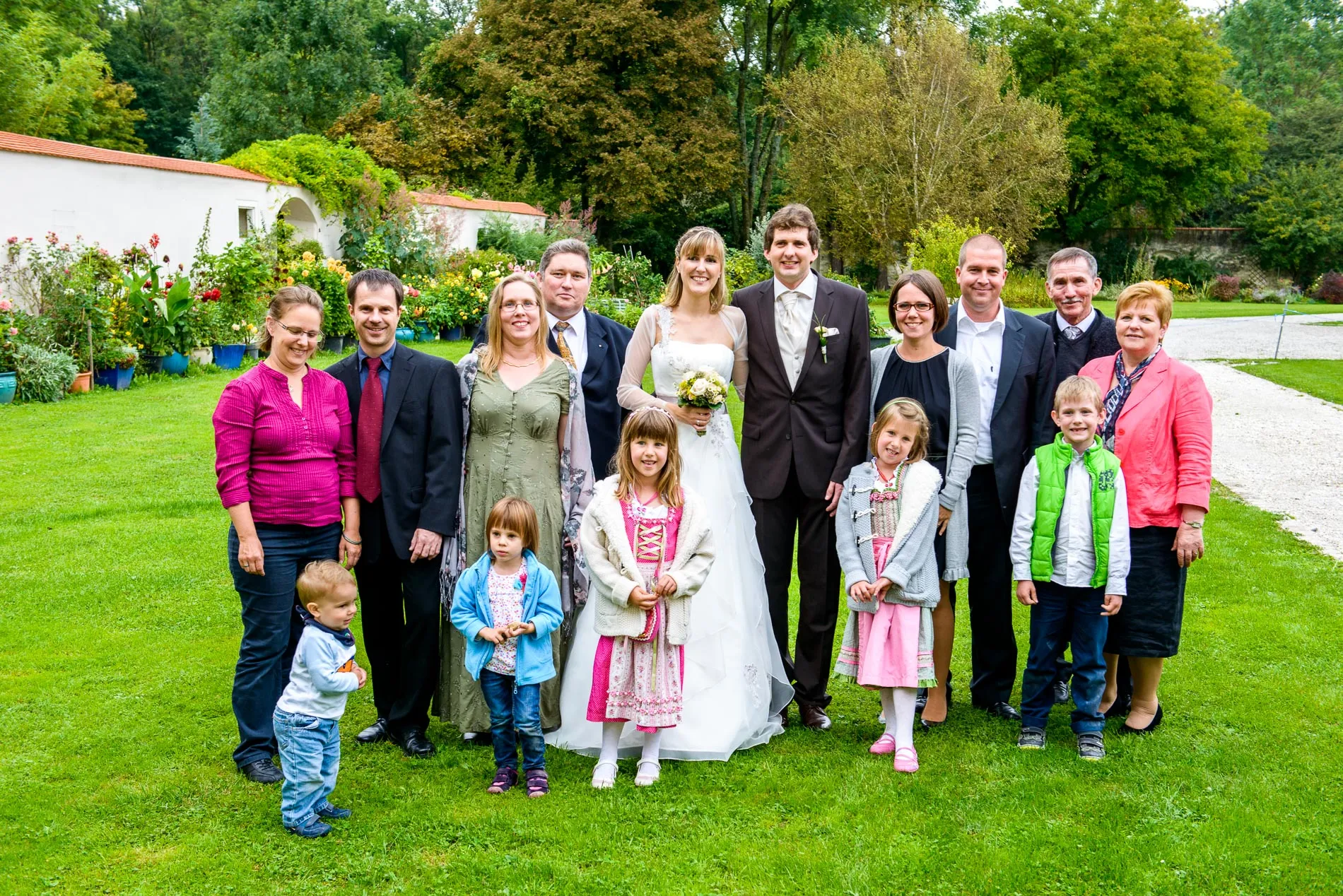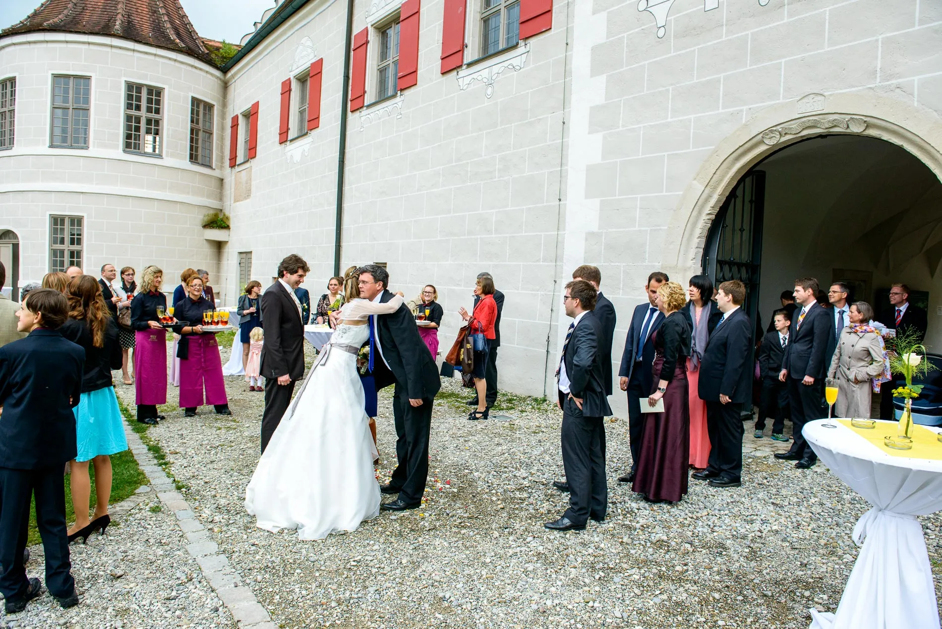 Damit es den Gästen nicht zu gemütlich wurde, bat ich alle noch einmal in den Hof zum großen Gruppenfoto. Danach folgten kleinere Gruppenbilder – eine Mischung aus Familienporträts und spontanen Momenten. Anschließend entführte ich das Brautpaar für einen Spaziergang rund um das Schloss. Zwischen alten Mauern, dem Auwald und der Donau entstanden natürliche und lebendige Hochzeitsfotos.