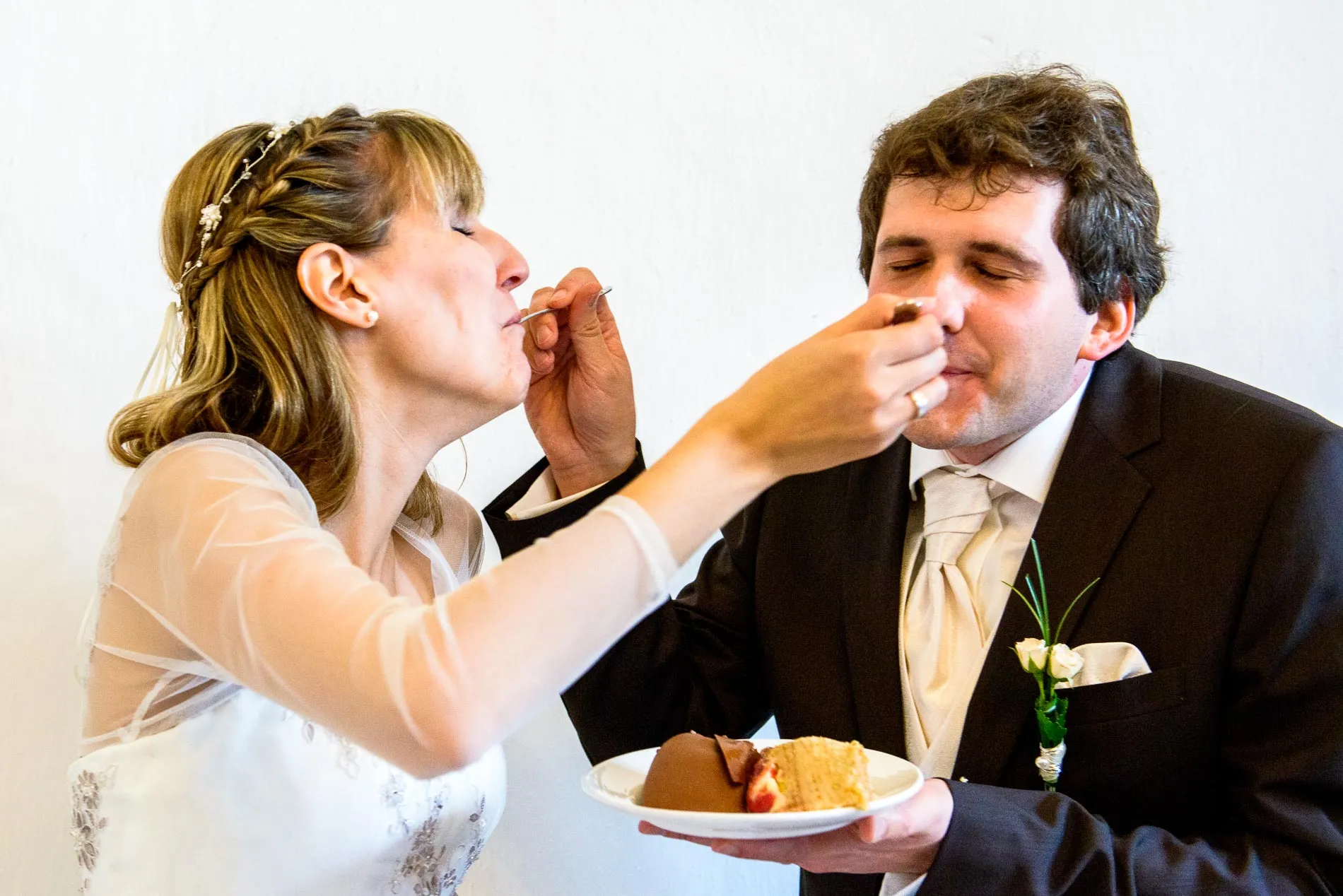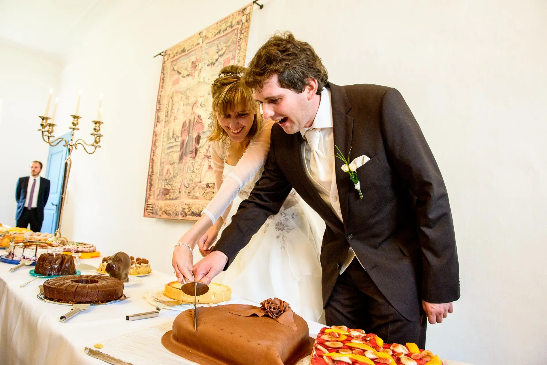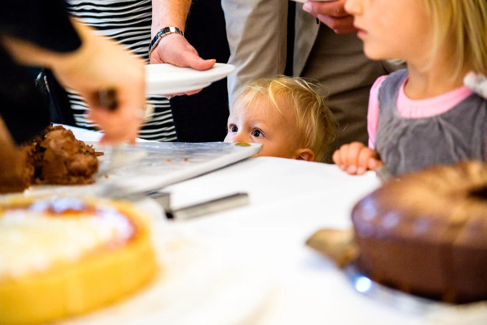 Im Festsaal folgten Reden und das Anschneiden der Hochzeitstorte. Hier kam wieder einmal das praktische Messer mit zwei Griffen zum Einsatz – eine Erfindung, die jede Diskussion über „wer hat die Hand oben“ elegant beendet. Die Kinder konnten es kaum erwarten, bis das Kuchenbuffet eröffnet wurde. Nach dem gegenseitigen Füttern des Brautpaars war es endlich soweit: die süße Schlacht begann.