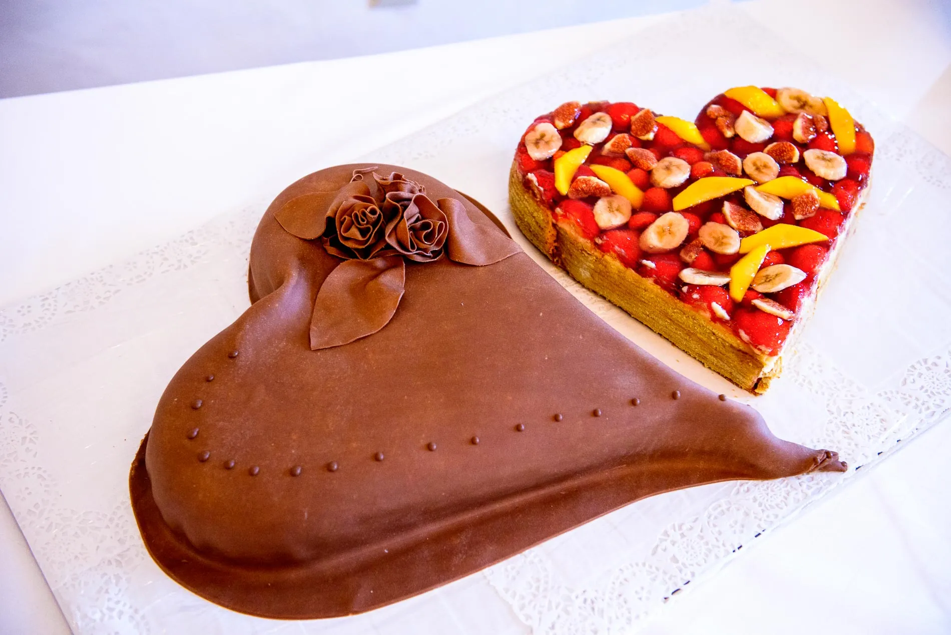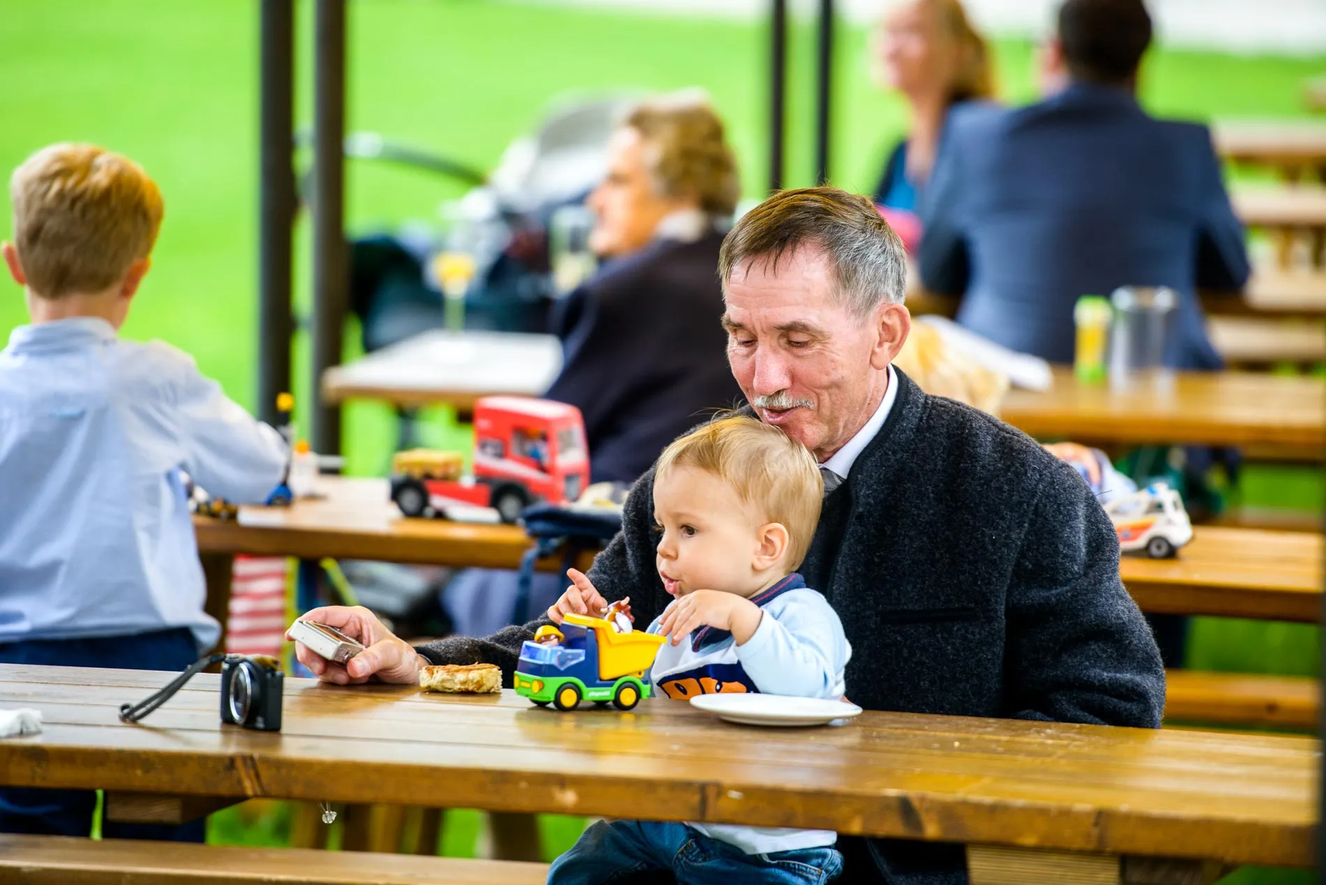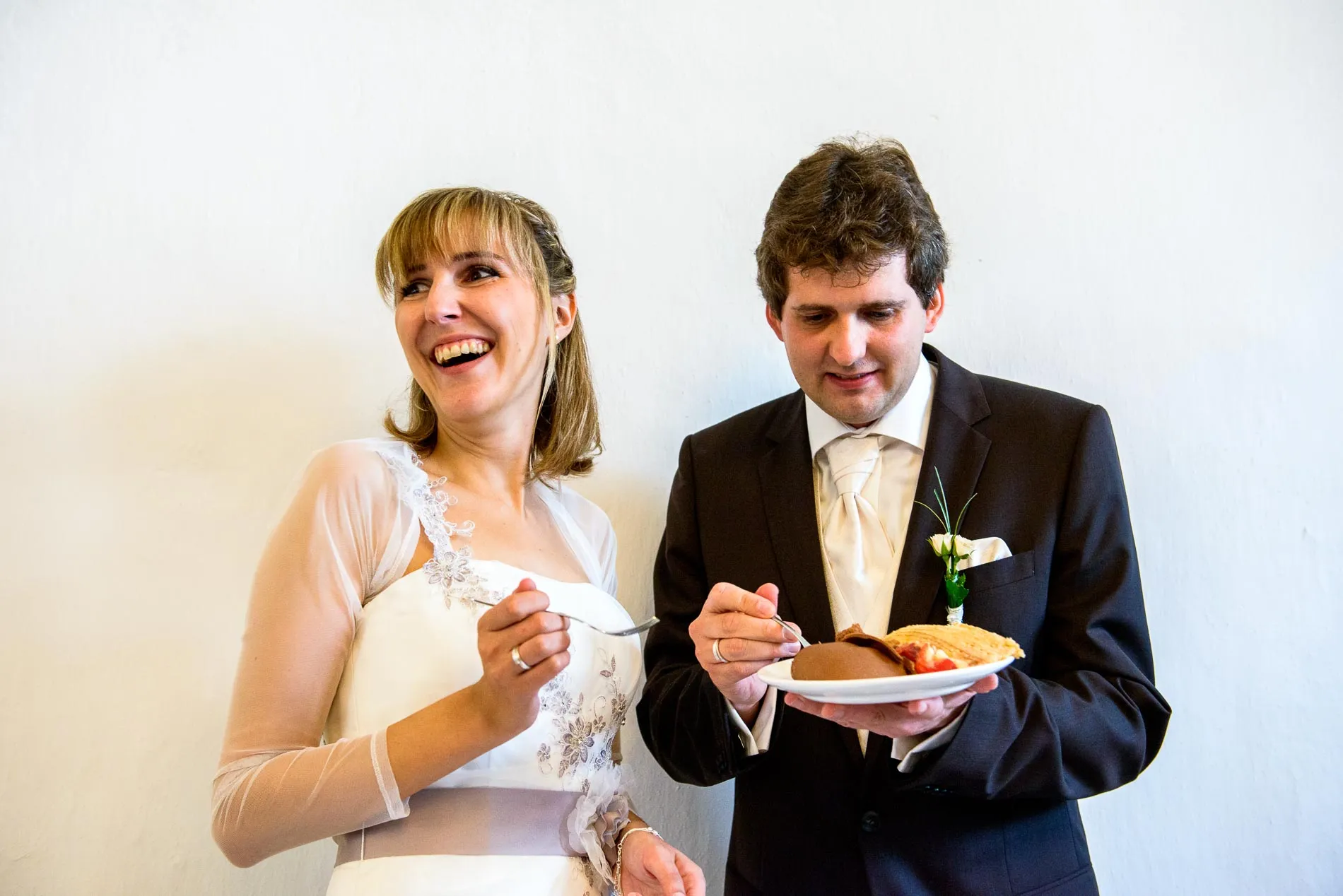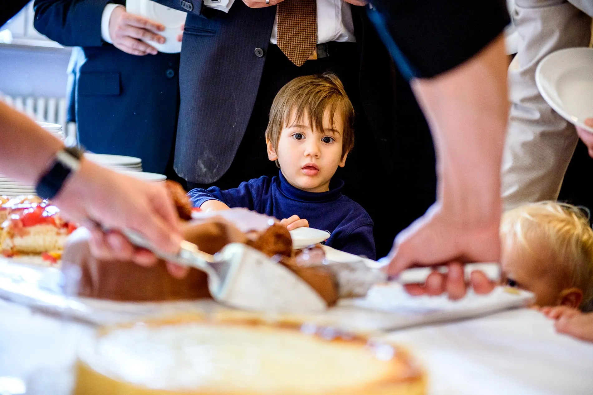 Im Festsaal folgten Reden und das Anschneiden der Hochzeitstorte. Hier kam wieder einmal das praktische Messer mit zwei Griffen zum Einsatz – eine Erfindung, die jede Diskussion über „wer hat die Hand oben“ elegant beendet. Die Kinder konnten es kaum erwarten, bis das Kuchenbuffet eröffnet wurde. Nach dem gegenseitigen Füttern des Brautpaars war es endlich soweit: die süße Schlacht begann.