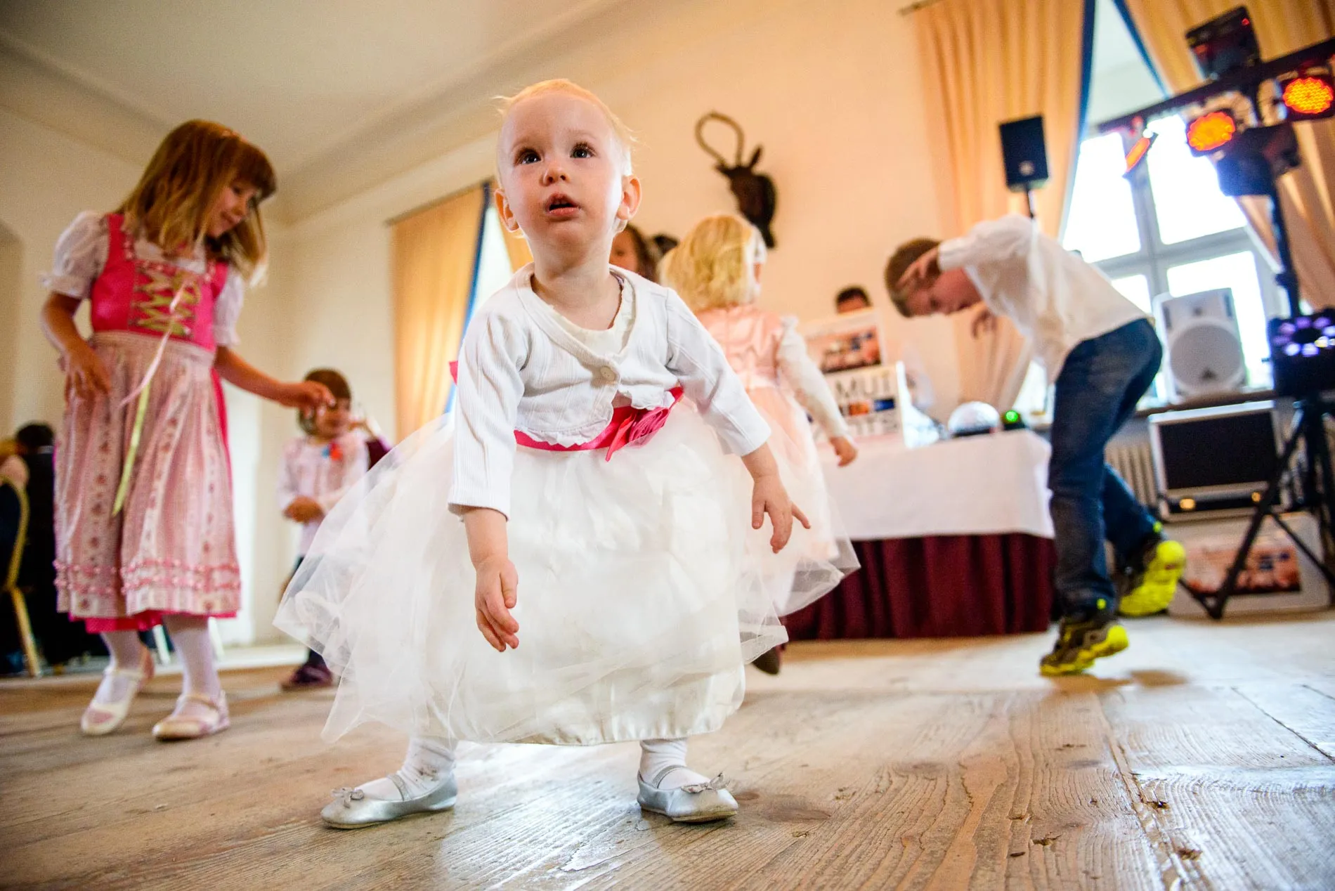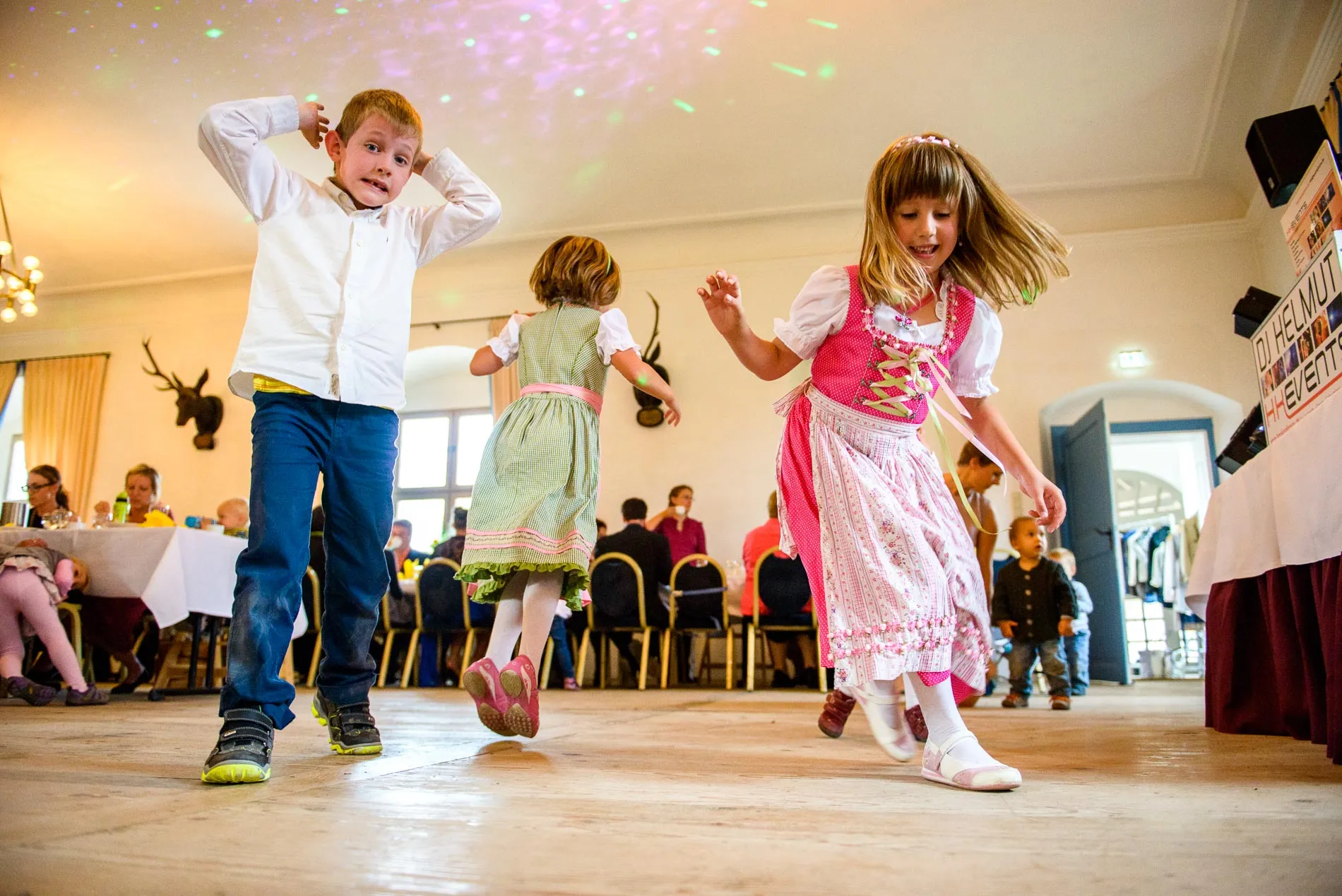 Noch vor dem Brautwalzer eröffneten die Kinder die Tanzfläche – wobei „Tanzfläche“ in diesem Fall eher „Hüpffläche“ bedeutete. Ein Hochzeitsfotograf freut sich über solche Momente, denn sie bringen Bewegung, Freude und Bilder, die später für Schmunzeln sorgen.