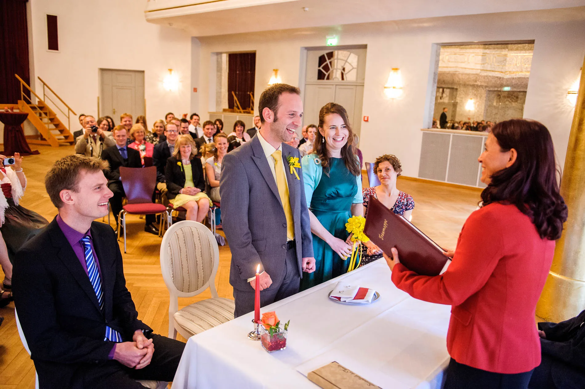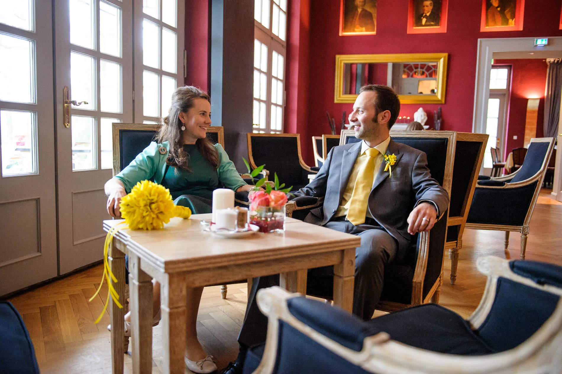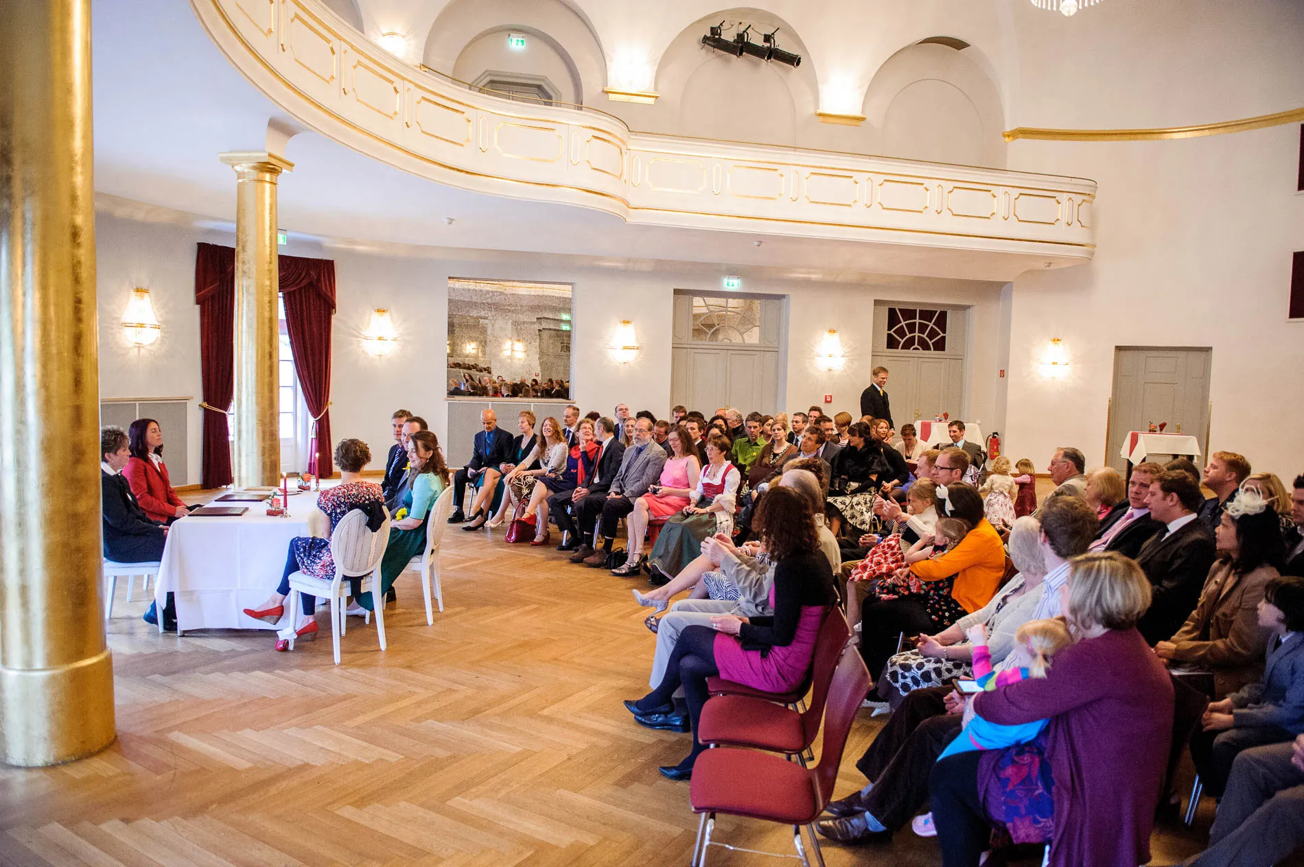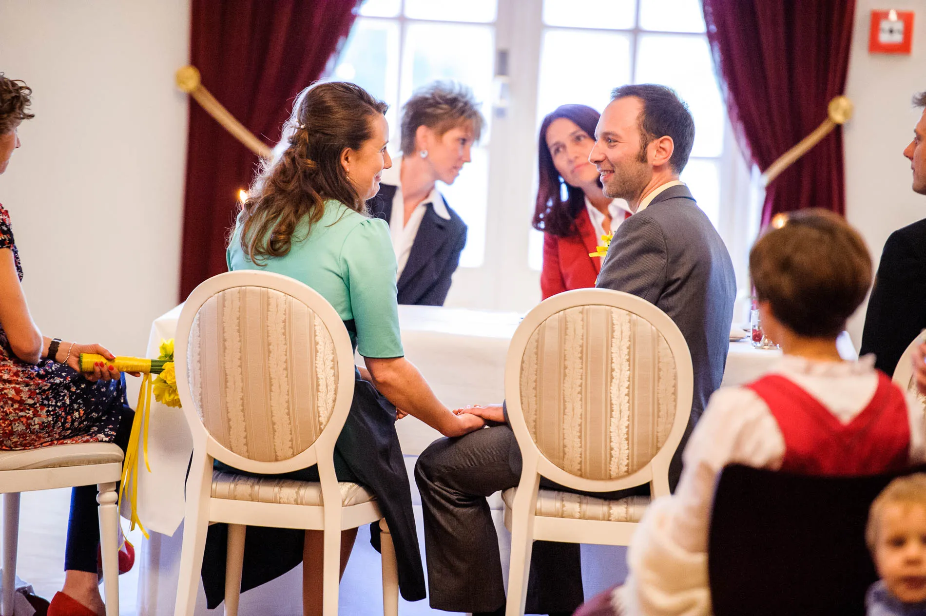 Normalerweise finden freie oder standesamtliche Trauungen im charmanten Salettl des Hauses statt. Da bei dieser Hochzeit jedoch die gesamte Gesellschaft anwesend war, wurde kurzerhand der große Festsaal genutzt. Eine Entscheidung, die sich als goldrichtig erwies: hohe Decken, viel Platz und eine Atmosphäre, die dem Anlass mehr als gerecht wurde.