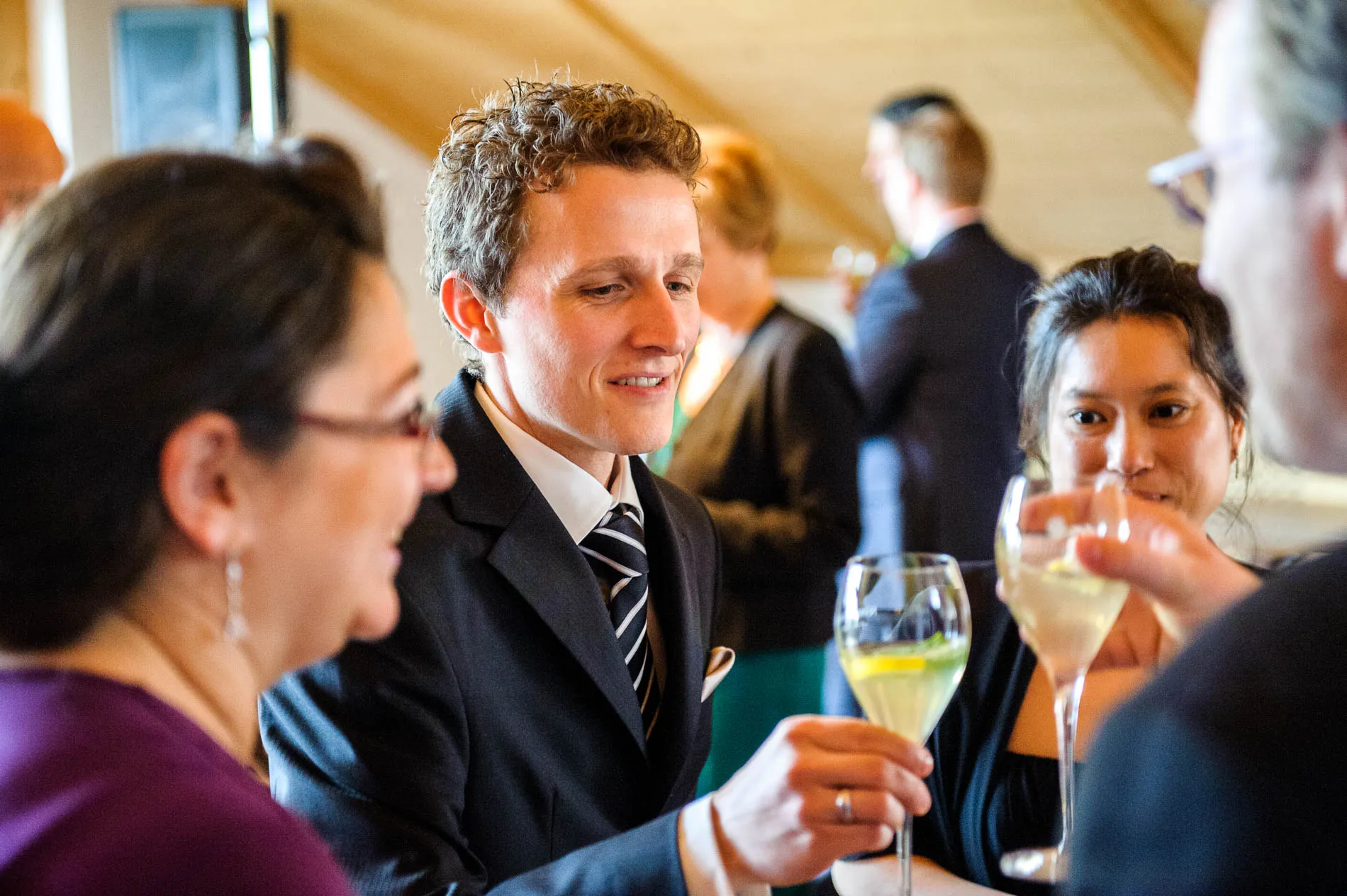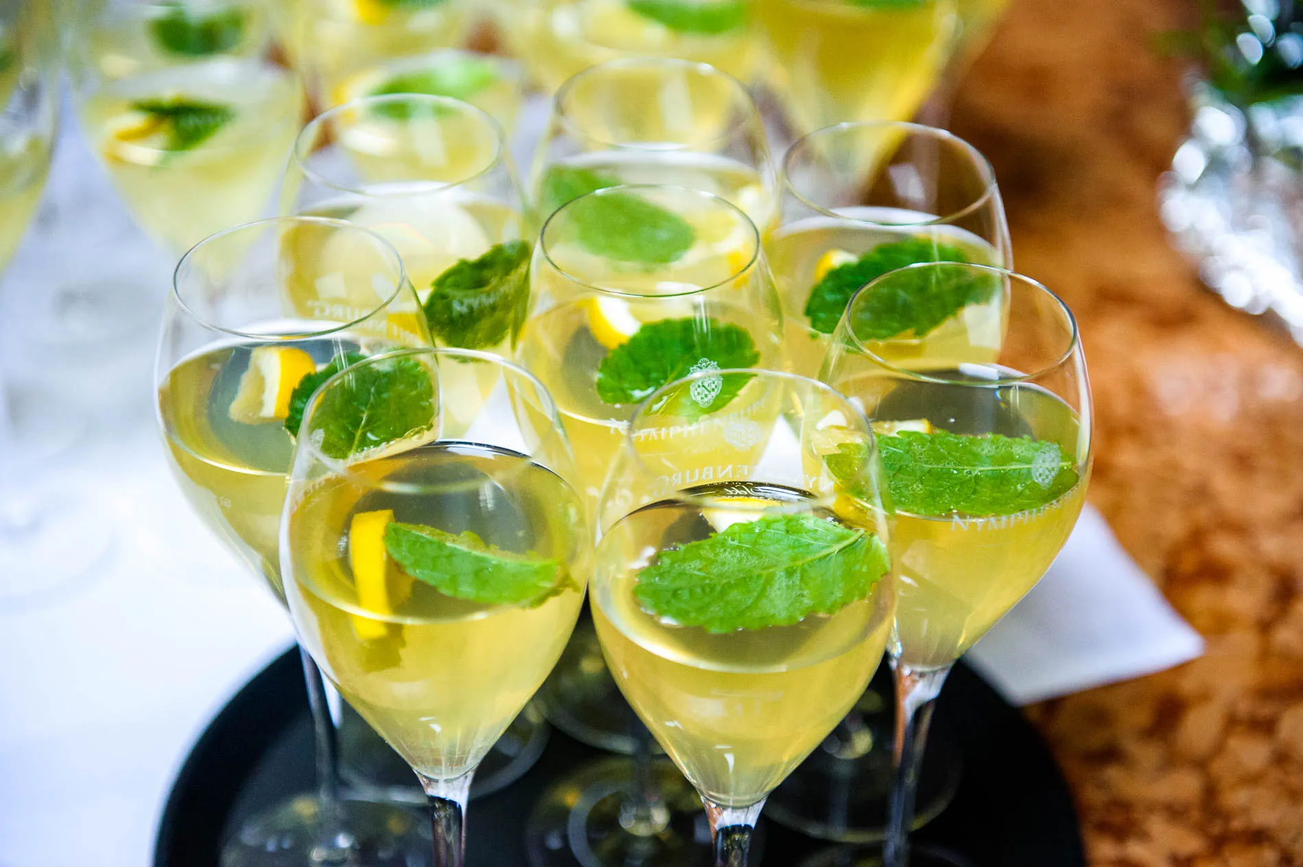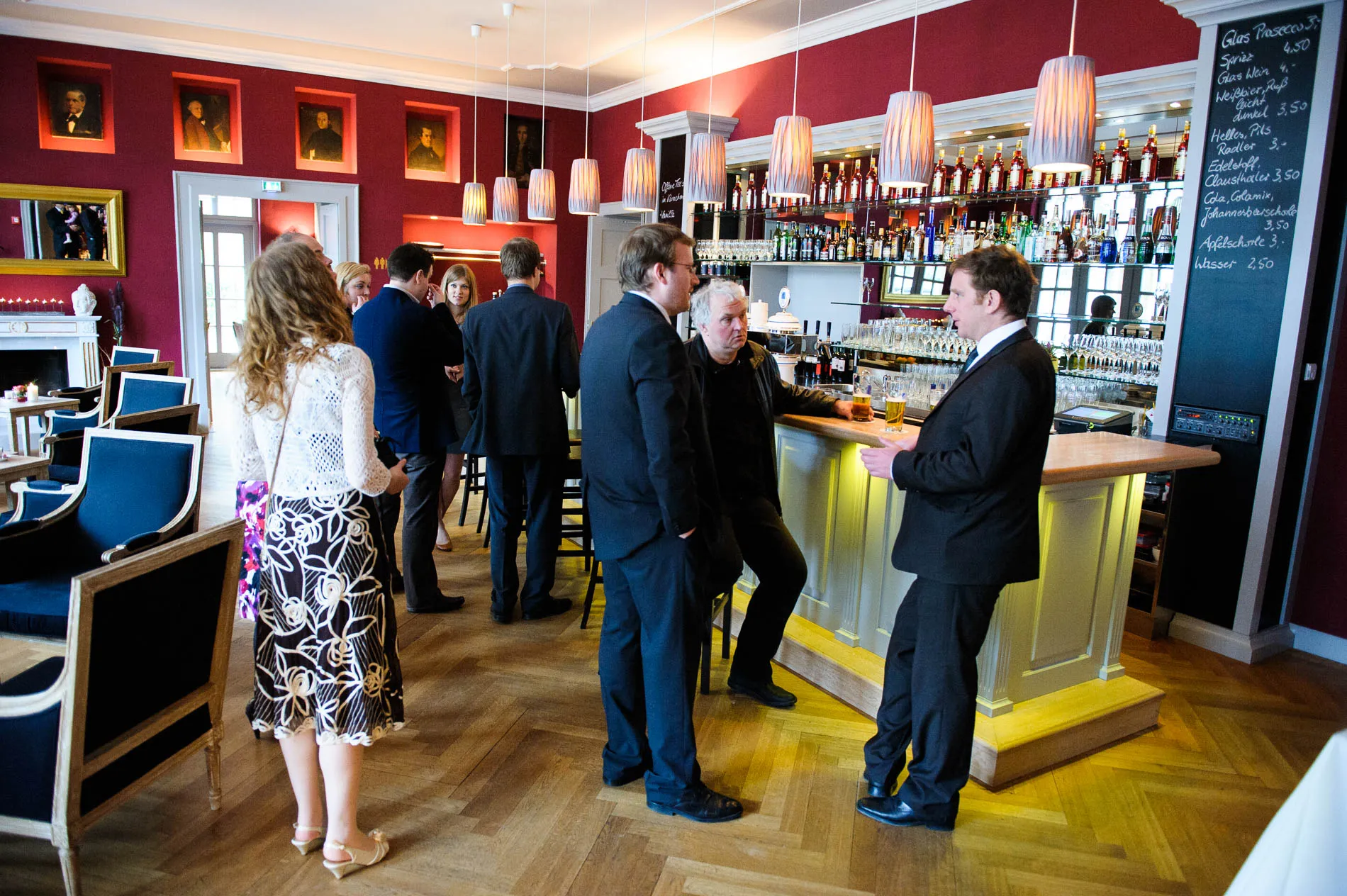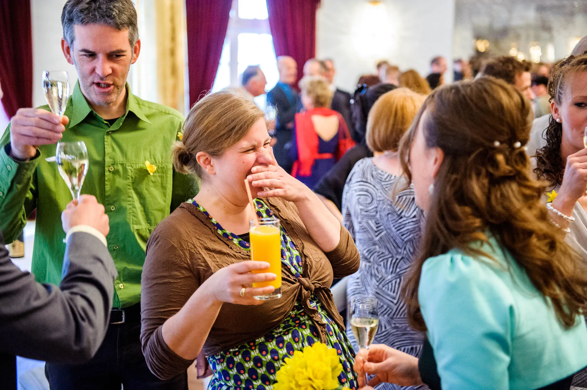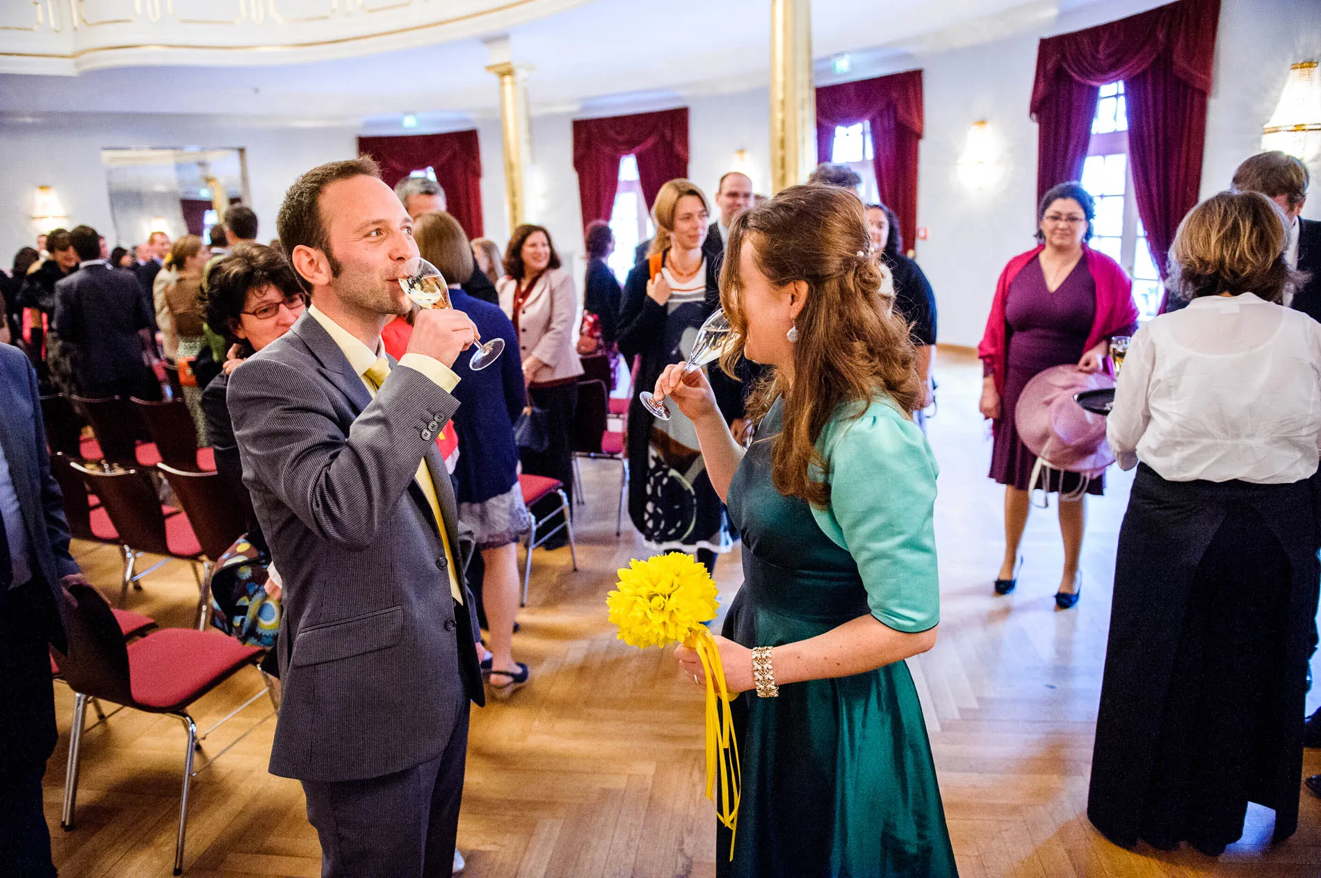 Die Ankunft des Brautpaars verzögerte sich ein wenig. Die Gäste überbrückten die Zeit mit Getränken. Die Kinder hielten sich an Apfelschorle, die Erwachsenen an Hugo. Man könnte sagen: gleiche Farbe, andere Wirkung.