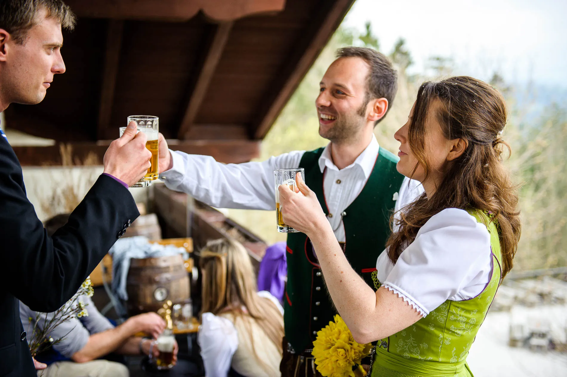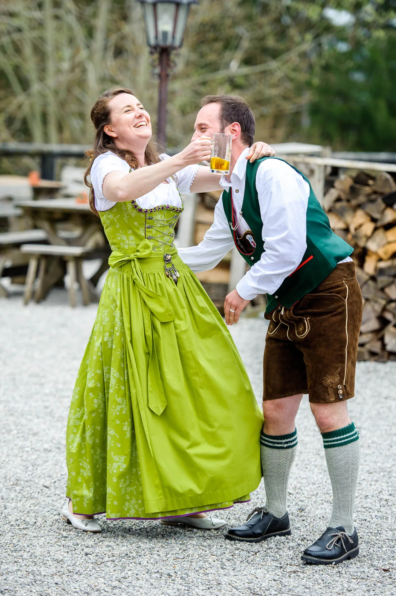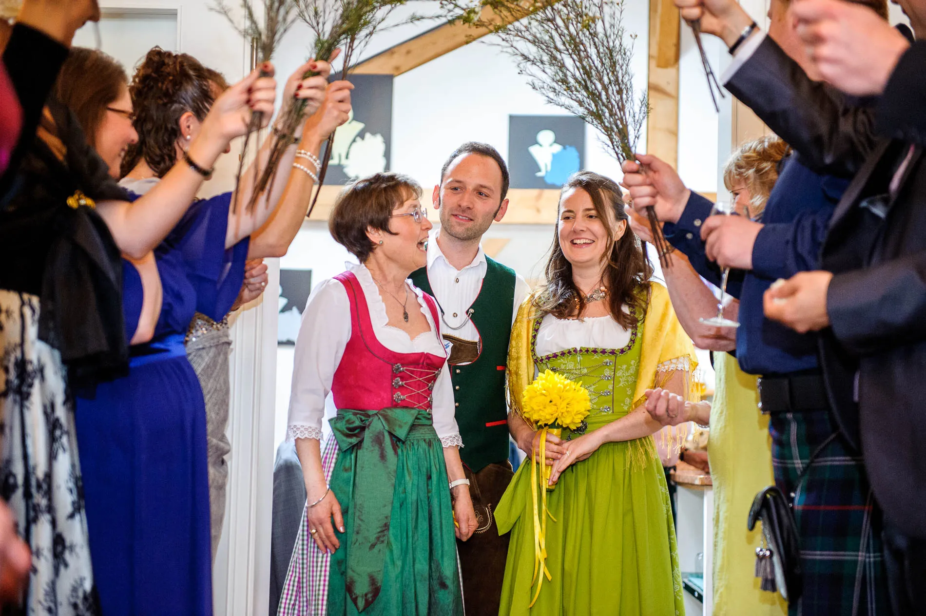 Das Brautpaar hatte sich inzwischen in Tracht geworfen: Dirndl und Lederhose. Ein Outfitwechsel, der zeigt, dass man Tradition und Feierlaune durchaus kombinieren kann. Der Einzug in den Saal wurde mit einem Spalier gefeiert – und, um es dramatisch zu formulieren, mit einem „Bombardement“. In Wahrheit waren es Seifenblasen und Blüten. Also alles halb so wild, aber doppelt so fotogen.