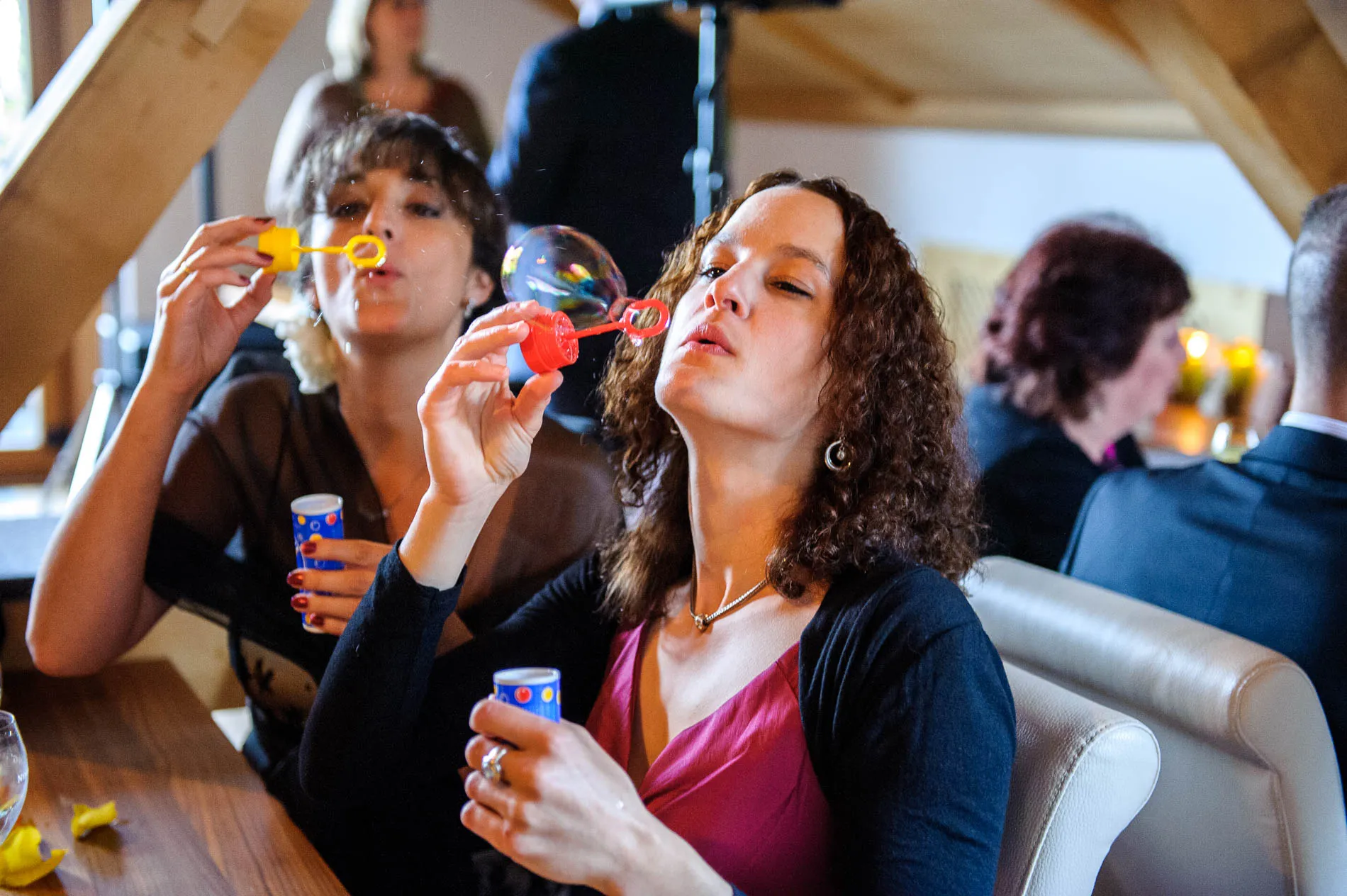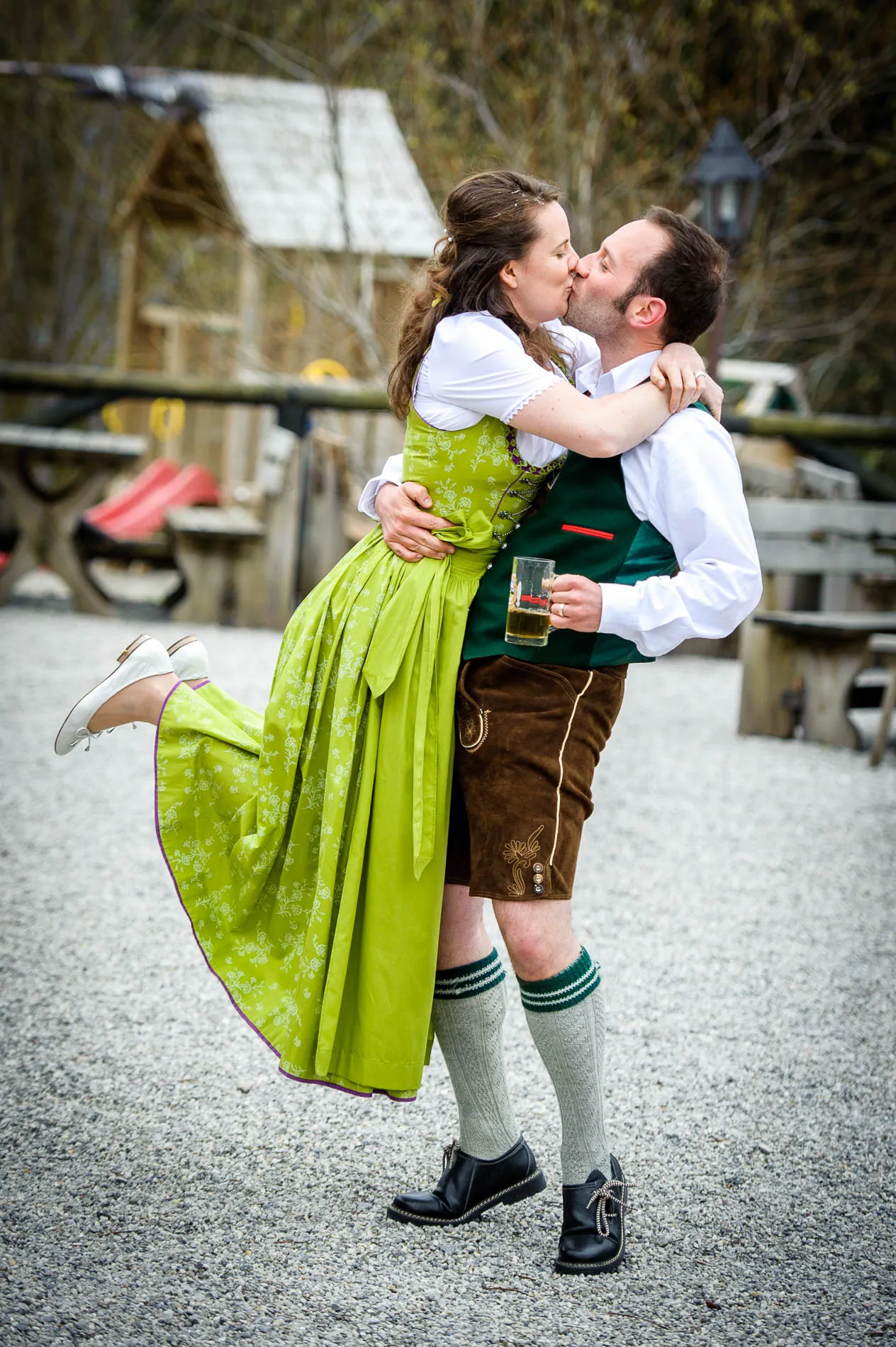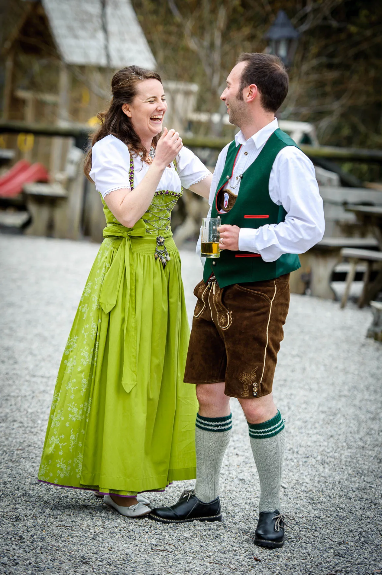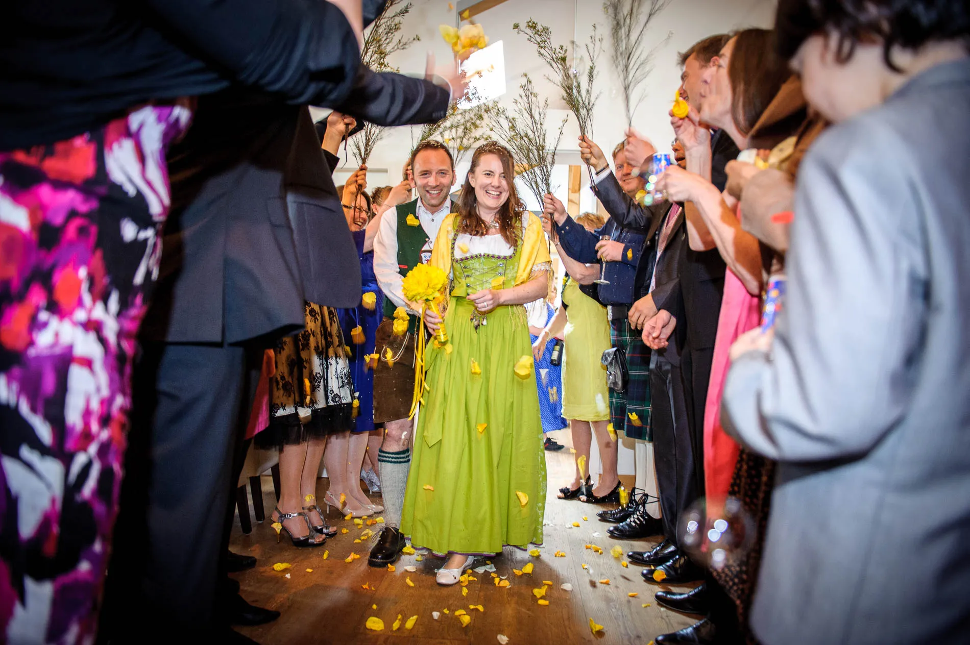 Das Brautpaar hatte sich inzwischen in Tracht geworfen: Dirndl und Lederhose. Ein Outfitwechsel, der zeigt, dass man Tradition und Feierlaune durchaus kombinieren kann. Der Einzug in den Saal wurde mit einem Spalier gefeiert – und, um es dramatisch zu formulieren, mit einem „Bombardement“. In Wahrheit waren es Seifenblasen und Blüten. Also alles halb so wild, aber doppelt so fotogen.