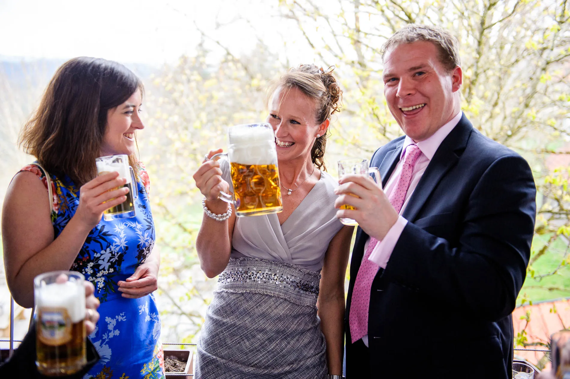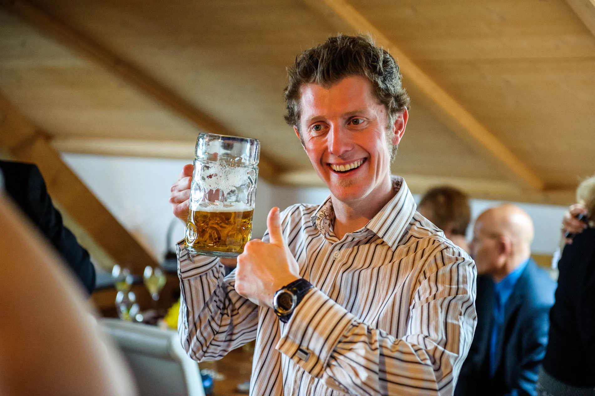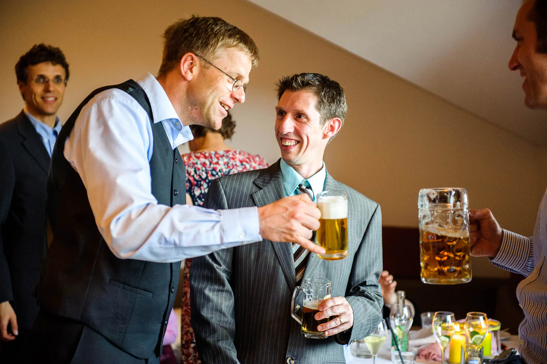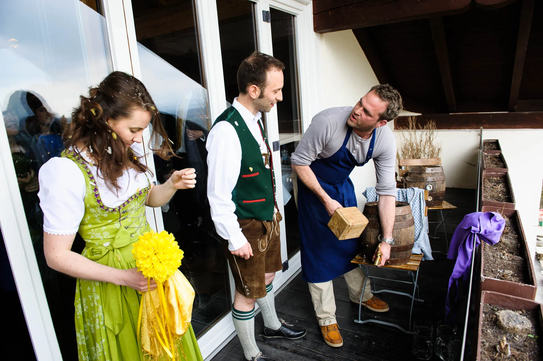 Der Bräutigam bekam anschließend eine Einweisung ins Bierfass-Anzapfen. Er meisterte die Aufgabe mit Stolz und – was nicht selbstverständlich ist – ohne Überschwemmung. Ein kleiner Sieg, der mit Applaus belohnt wurde.