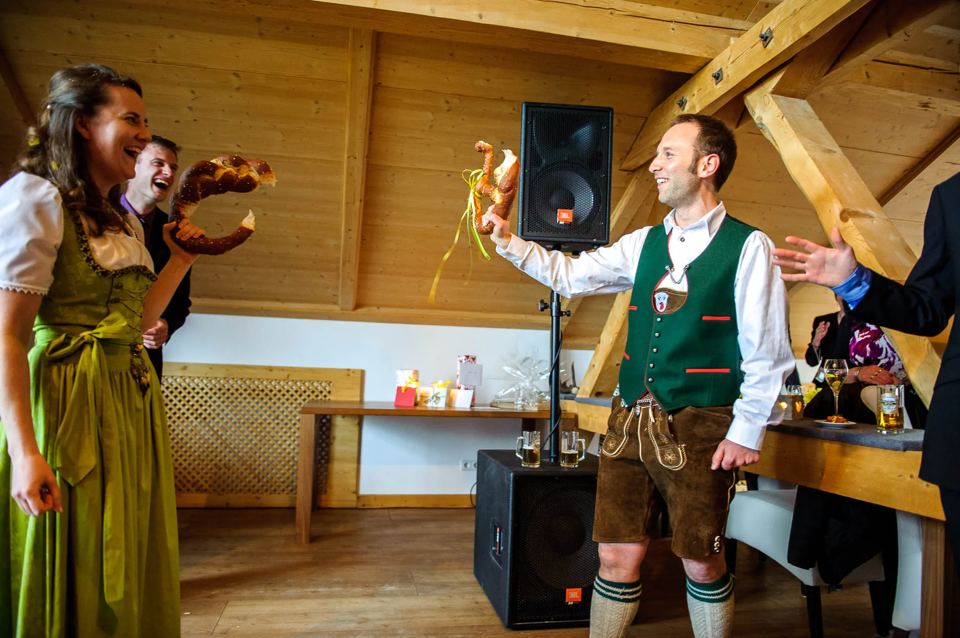 Ein weiteres Highlight war das Breznziang – ein bayerischer Hochzeitsbrauch, bei dem das Brautpaar an einer großen Breze zieht. Wer das größere Stück ergattert, hat angeblich die Oberhand in der Ehe. Ob das stimmt, sei dahingestellt. Aber es sorgt zuverlässig für Gelächter und für Fotos, die man später gerne zeigt – auch wenn man das Ergebnis vielleicht nicht unbedingt diskutieren möchte.