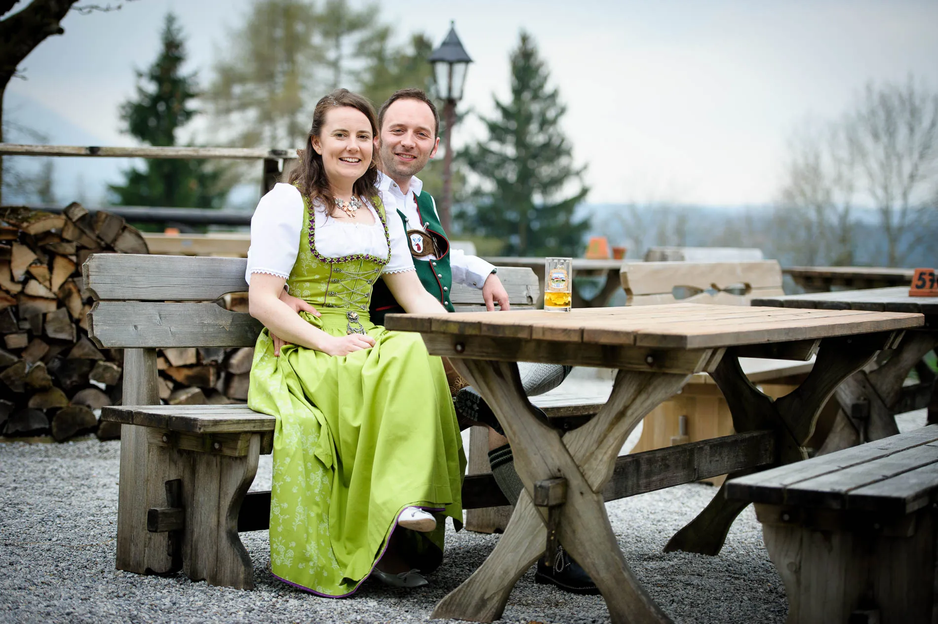 Auf der Sonnenterrasse des Moarwirts wartete das Tölzer Voralpenland mit einem Ausblick, der fast schon kitschig schön war. Perfekt für das Brautpaarshooting. Besonders die Aufnahmen in Tracht wirkten, als hätte man eine Szene aus einem Heimatfilm in die Gegenwart verlegt.