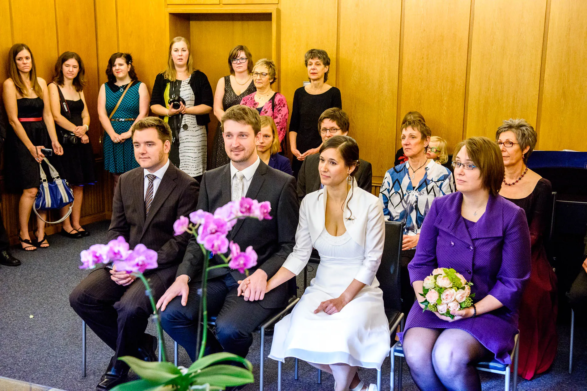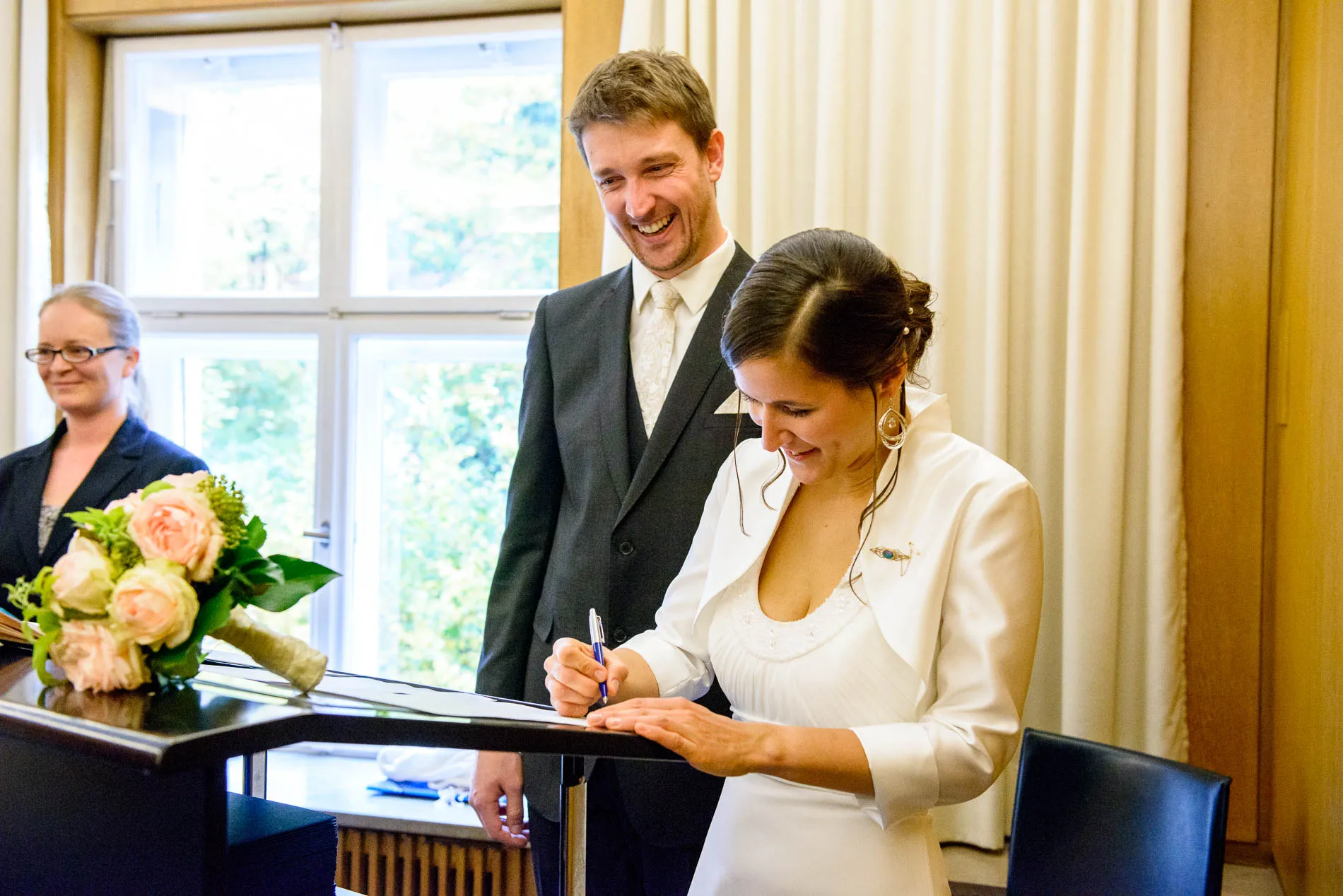 Wer im Standesamt München-Mandlstraße heiratet, sollte seine Redezeit besser nicht mit einem Roman verwechseln. Die Trauungen sind hier bekannt für ihre Effizienz – charmant, aber ohne allzu viel Ausschmückung. Während in ländlichen Standesämtern der Bürgermeister gerne noch ein paar Anekdoten über das Brautpaar erzählt, geht es in Schwabing eher nach dem Motto: „Bitte einmal Ja sagen, und schon sind Sie offiziell verheiratet.“ Freitags ist das Haus besonders beliebt, was bedeutet: reger Betrieb, volle Wartezimmer und ein ständiges Kommen und Gehen. Praktisch dafür: Der Trausaal hat eine eigene Ein- und Ausgangstür, damit sich die Gesellschaften nicht gegenseitig ins Bild laufen. Für mich als Hochzeitsfotograf München heißt das manchmal: ein kleines Suchspiel im Warteraum, bis ich die richtige Gesellschaft entdecke.