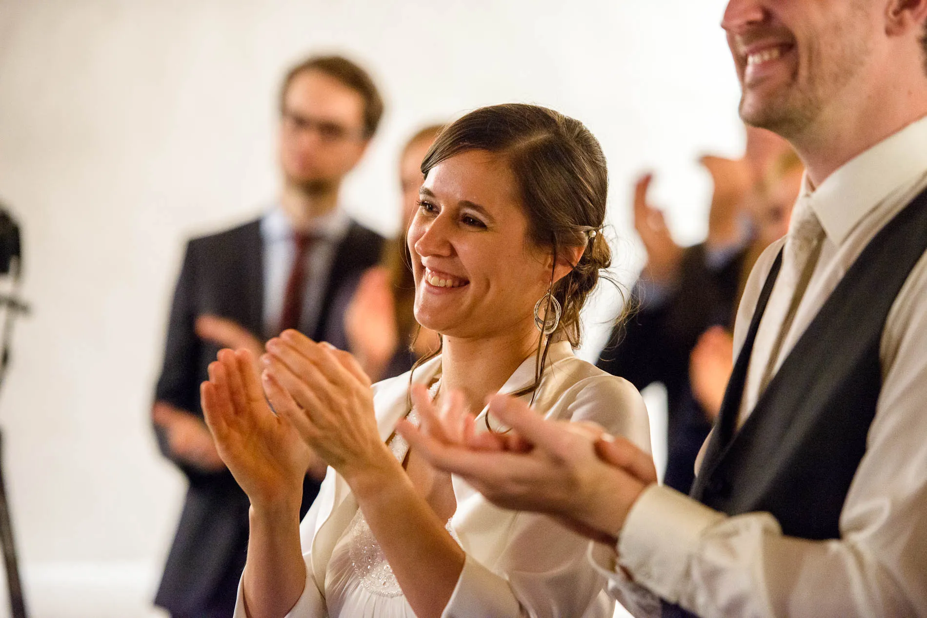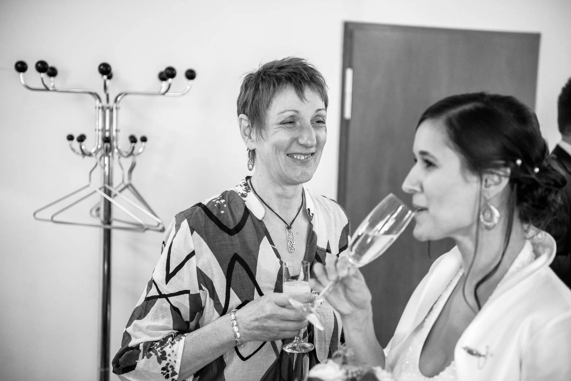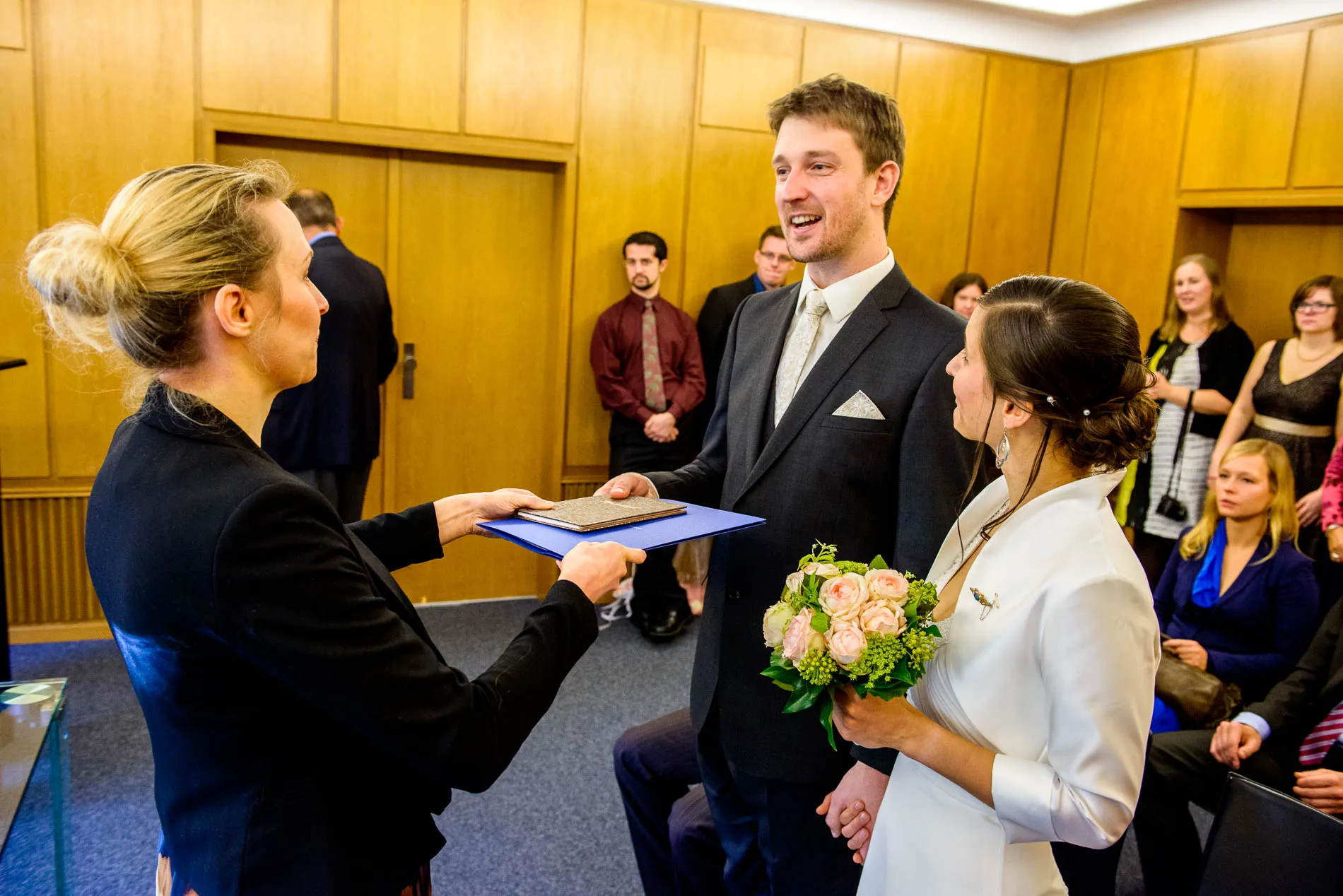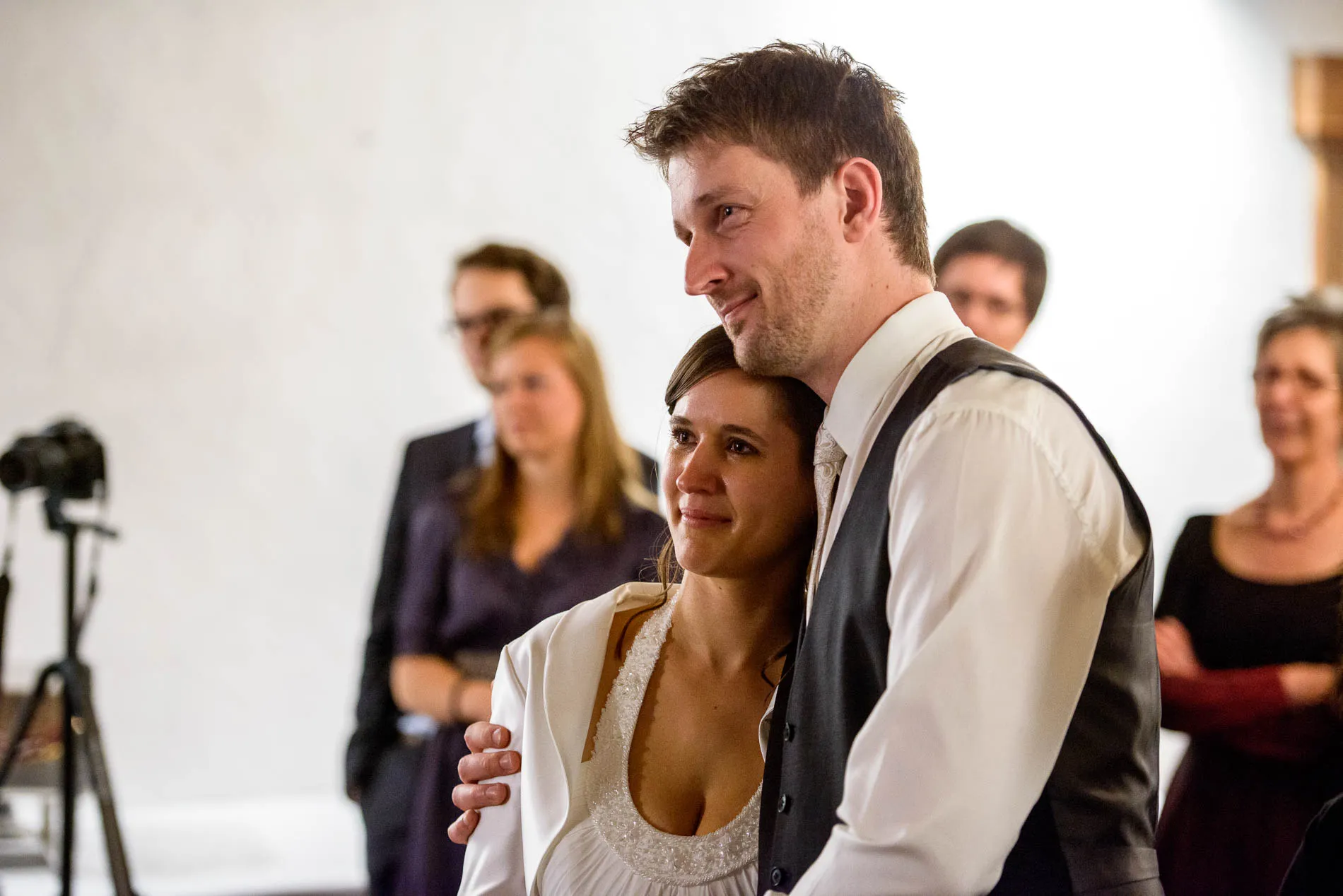 Nach dem Ja-Wort gab es einen kurzen Umtrunk im Standesamt. Ein weiblicher Gast packte das Akkordeon aus und sorgte für eine musikalische Überraschung. Solche Momente sind für mich als Fotograf Gold wert: spontan, lebendig und voller Emotionen. Das Brautpaar strahlte ohnehin den ganzen Tag – es war schlicht unmöglich, ein schlechtes Foto zu machen.