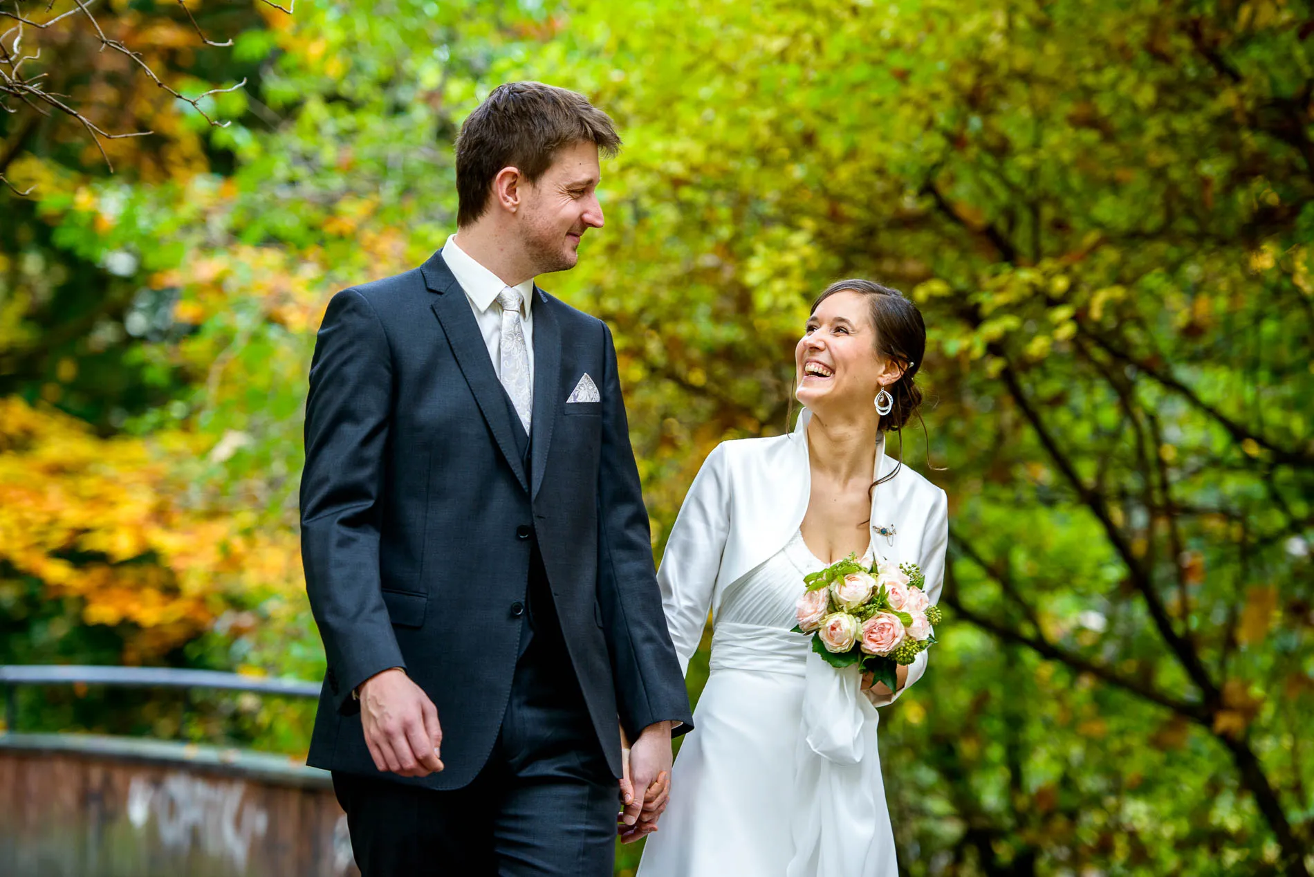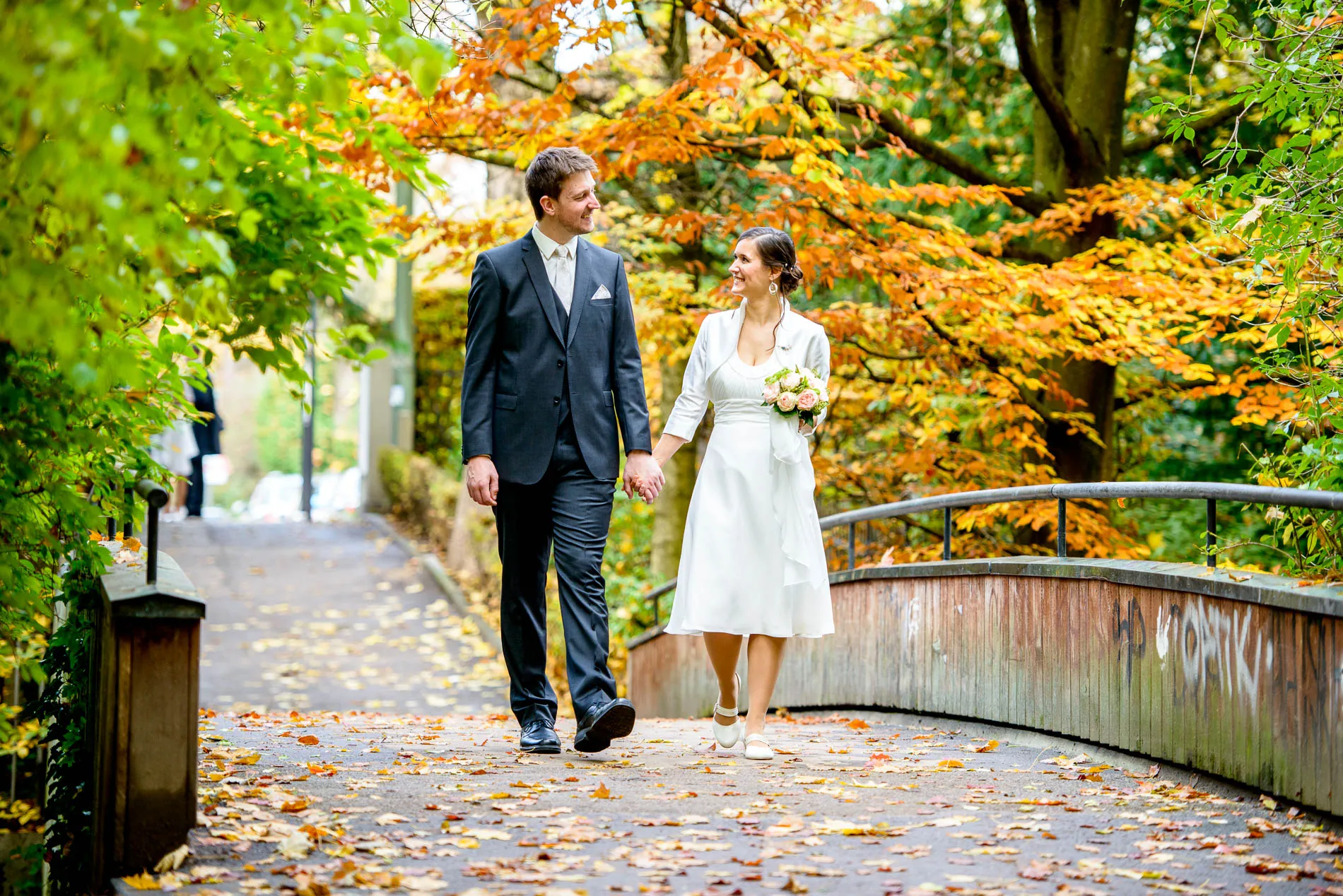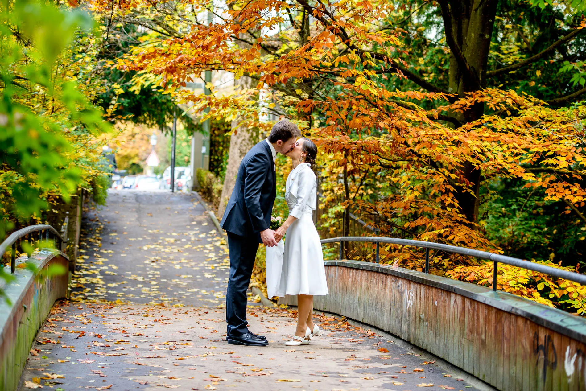 Das Standesamt selbst ist eine elegante Villa im Jugendstil, gelegen in der Mandlstraße mitten in Schwabing. Hohe Fenster, viel Licht und eine gewisse Grandezza verleihen der Zeremonie einen würdevollen Rahmen. Und das Beste: Nach der Trauung muss man nur wenige Schritte gehen, über die kleine Brücke am Schwabinger Bach, und schon öffnet sich der Englische Garten – eine Traumkulisse für Hochzeitsfotos. Besonders im Herbst, wenn das Laub golden leuchtet, entstehen dort Bilder, die fast schon von der Natur selbst inszeniert wirken.