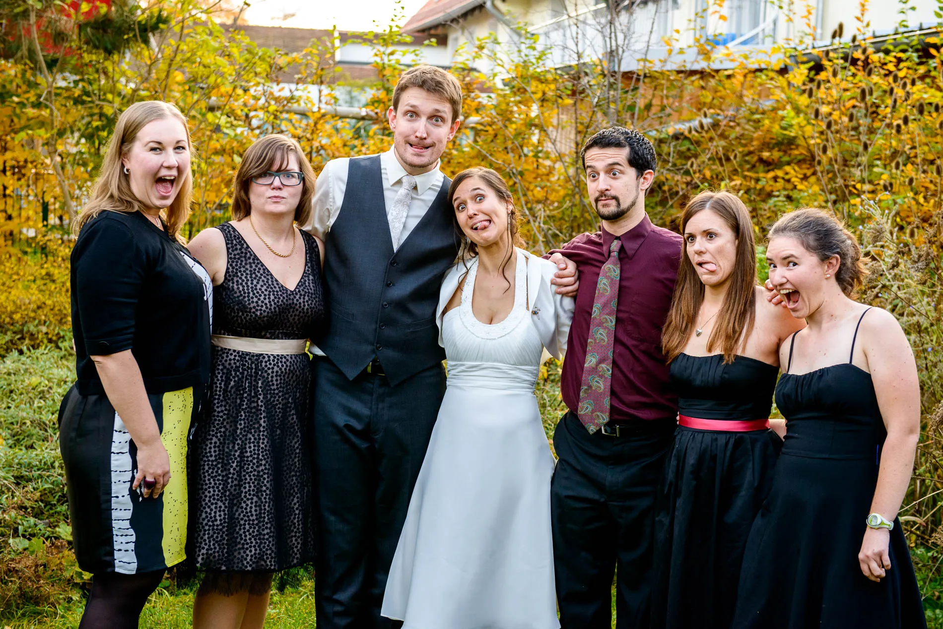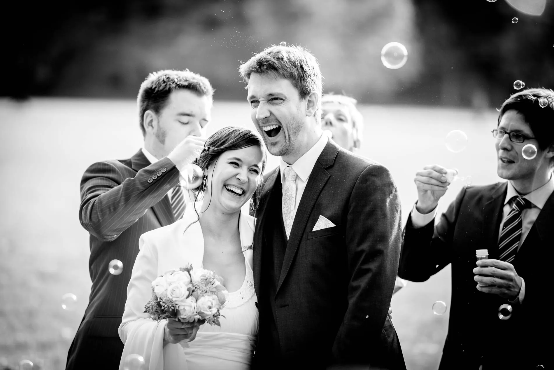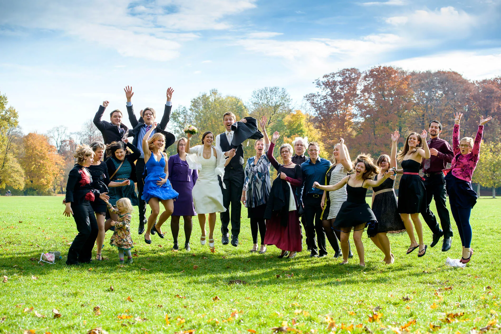Im Englischen Garten entstanden anschließend die klassischen Brautpaarportraits. Dabei durfte auch ein wenig Bewegung ins Spiel kommen – Fotos im Gehen, im Lachen, und schließlich im Seifenblasenmeer, das die Gäste für das Paar zauberten. Ein Gruppenfoto mit allen Gästen rundete die Szene ab, bevor es weiter nach Grünwald ging.