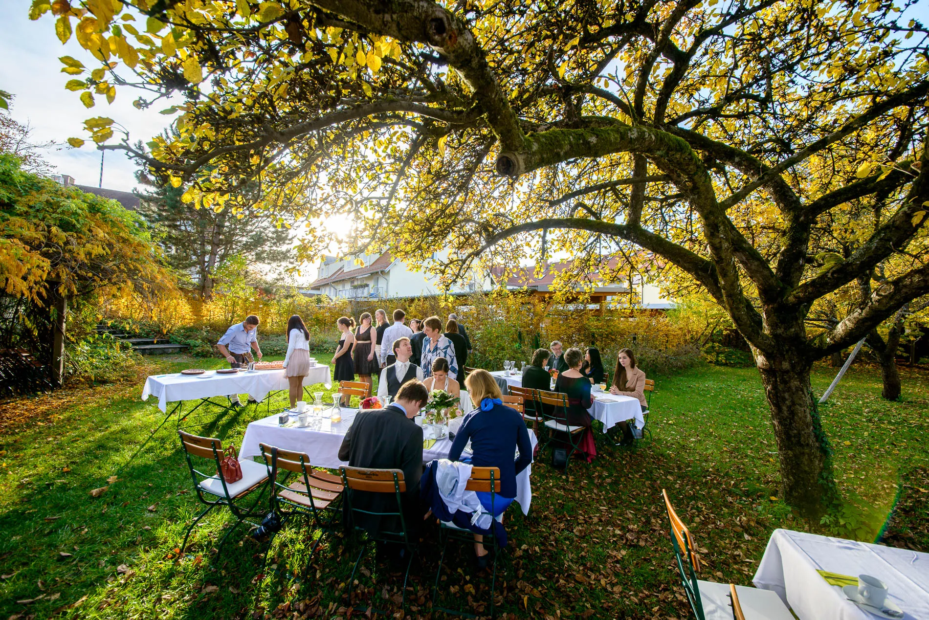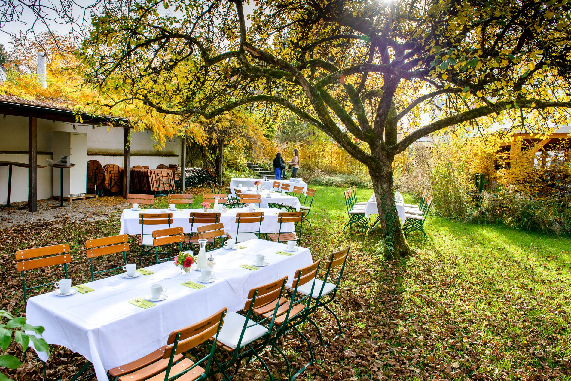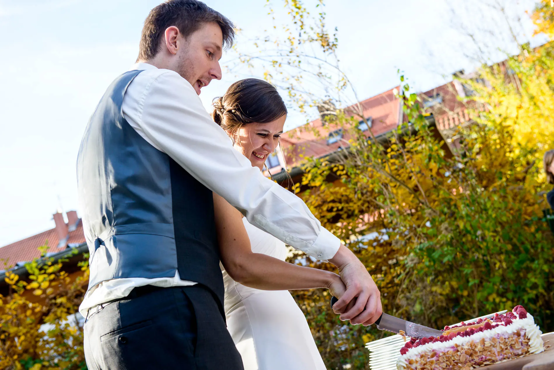 Die Hochzeitsfeier fand im Bio-Hotel und Bio-Restaurant Alter Wirt statt, einem traditionsreichen Haus im Villenort Grünwald, südlich von München. Der Alte Wirt ist bekannt für seine nachhaltige Philosophie: regionale Bio-Zutaten, ökologisches Konzept und ein Ambiente, das rustikale Gemütlichkeit mit moderner Eleganz verbindet. Der Garten ist ein echtes Highlight – alte Bäume, viel Platz und eine Atmosphäre, die sofort zum Feiern einlädt. Für einen milden Oktobertag war es perfekt: Empfang und Kuchenessen fanden draußen statt, begleitet von herzlichem Lachen und dem unvermeidlichen „Wer hat eigentlich die größte Tortenportion erwischt?“.
