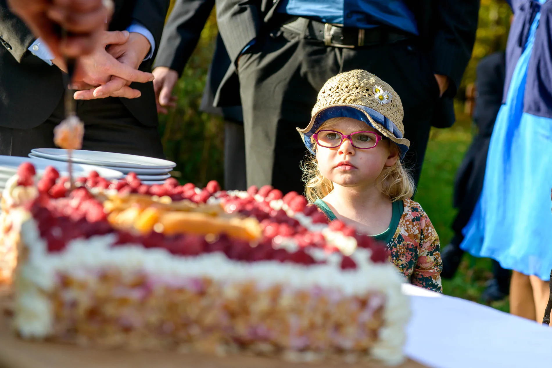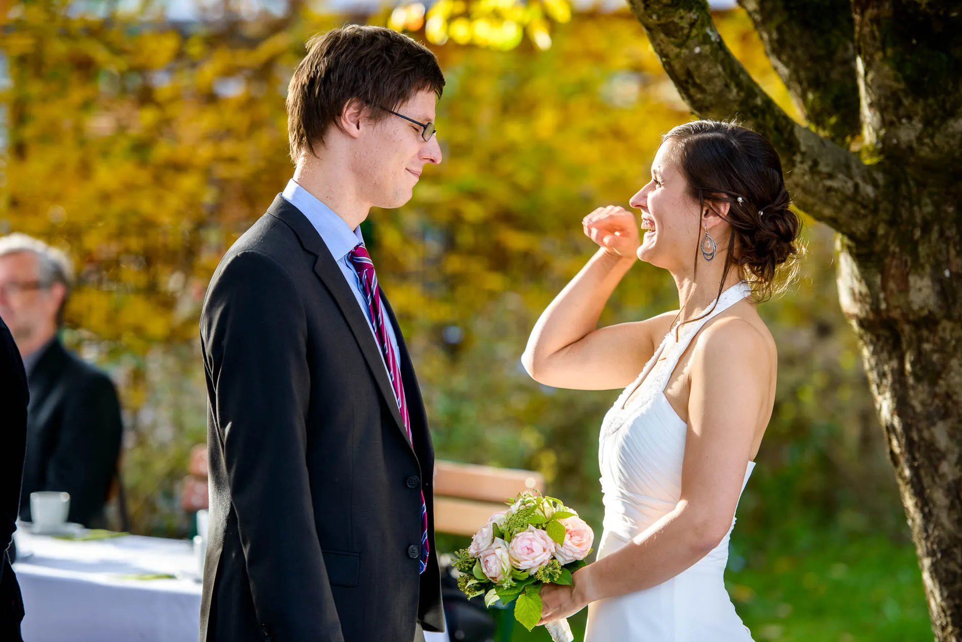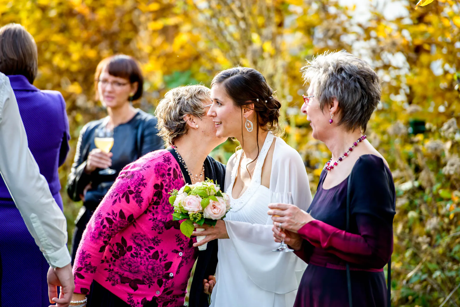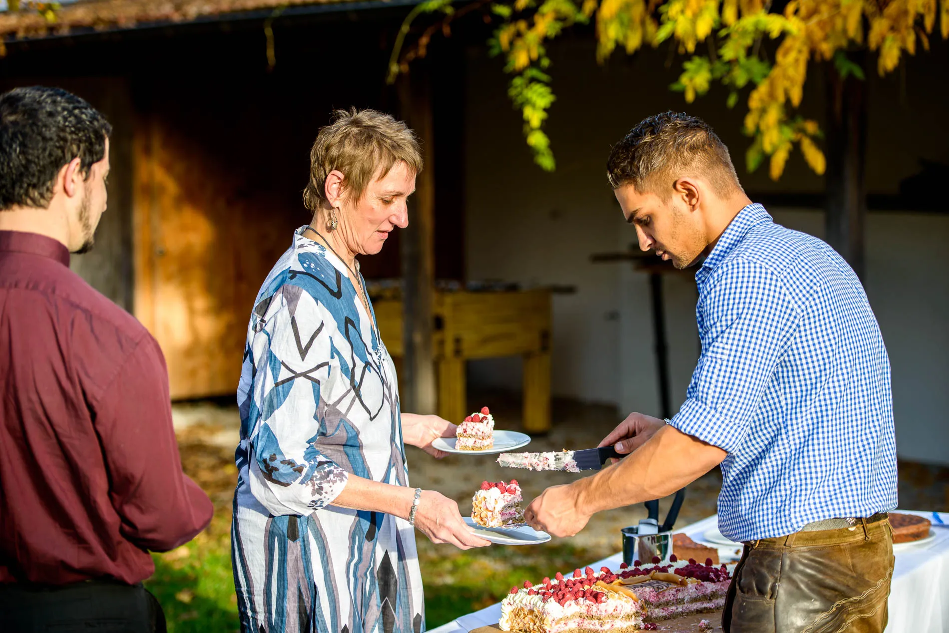 Die Hochzeitsfeier fand im Bio-Hotel und Bio-Restaurant Alter Wirt statt, einem traditionsreichen Haus im Villenort Grünwald, südlich von München. Der Alte Wirt ist bekannt für seine nachhaltige Philosophie: regionale Bio-Zutaten, ökologisches Konzept und ein Ambiente, das rustikale Gemütlichkeit mit moderner Eleganz verbindet. Der Garten ist ein echtes Highlight – alte Bäume, viel Platz und eine Atmosphäre, die sofort zum Feiern einlädt. Für einen milden Oktobertag war es perfekt: Empfang und Kuchenessen fanden draußen statt, begleitet von herzlichem Lachen und dem unvermeidlichen „Wer hat eigentlich die größte Tortenportion erwischt?“.