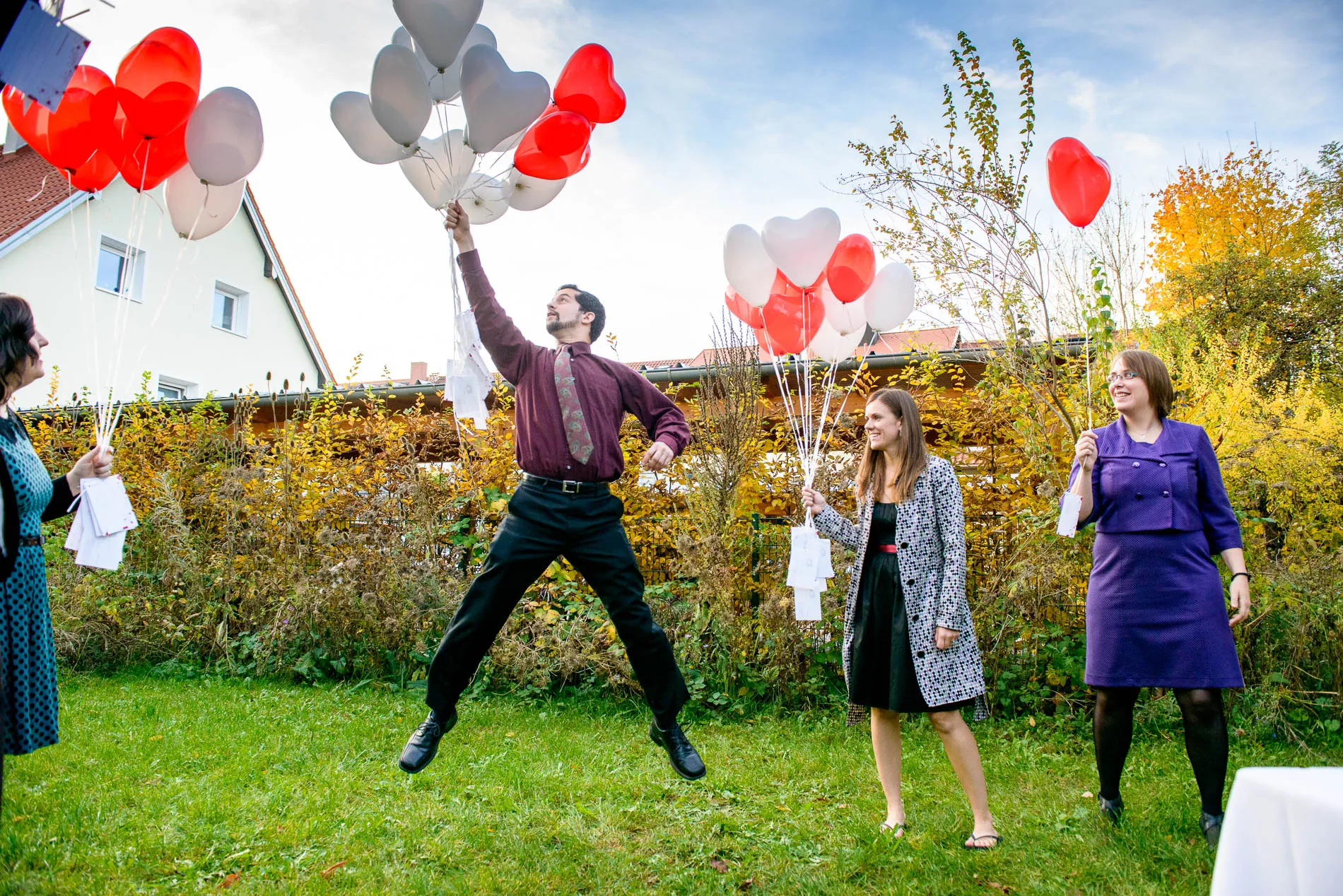 Ein Gast hatte sich fest vorgenommen, ein Bild zu bekommen, wie er von Herzchenluftballons in die Höhe gezogen wird. Zehn Ballons, ein beherzter Sprung – und schon schien er fast zu schweben. Natürlich war es nicht die Ballonpower, sondern sein eigener Sprung. Die Schwerkraft hat ihn dann charmant daran erinnert, wo er hingehört. Das Foto wurde trotzdem zum Lieblingsbild des Abends, weil es genau diese Mischung aus Inszenierung und augenzwinkernder Realität einfing.