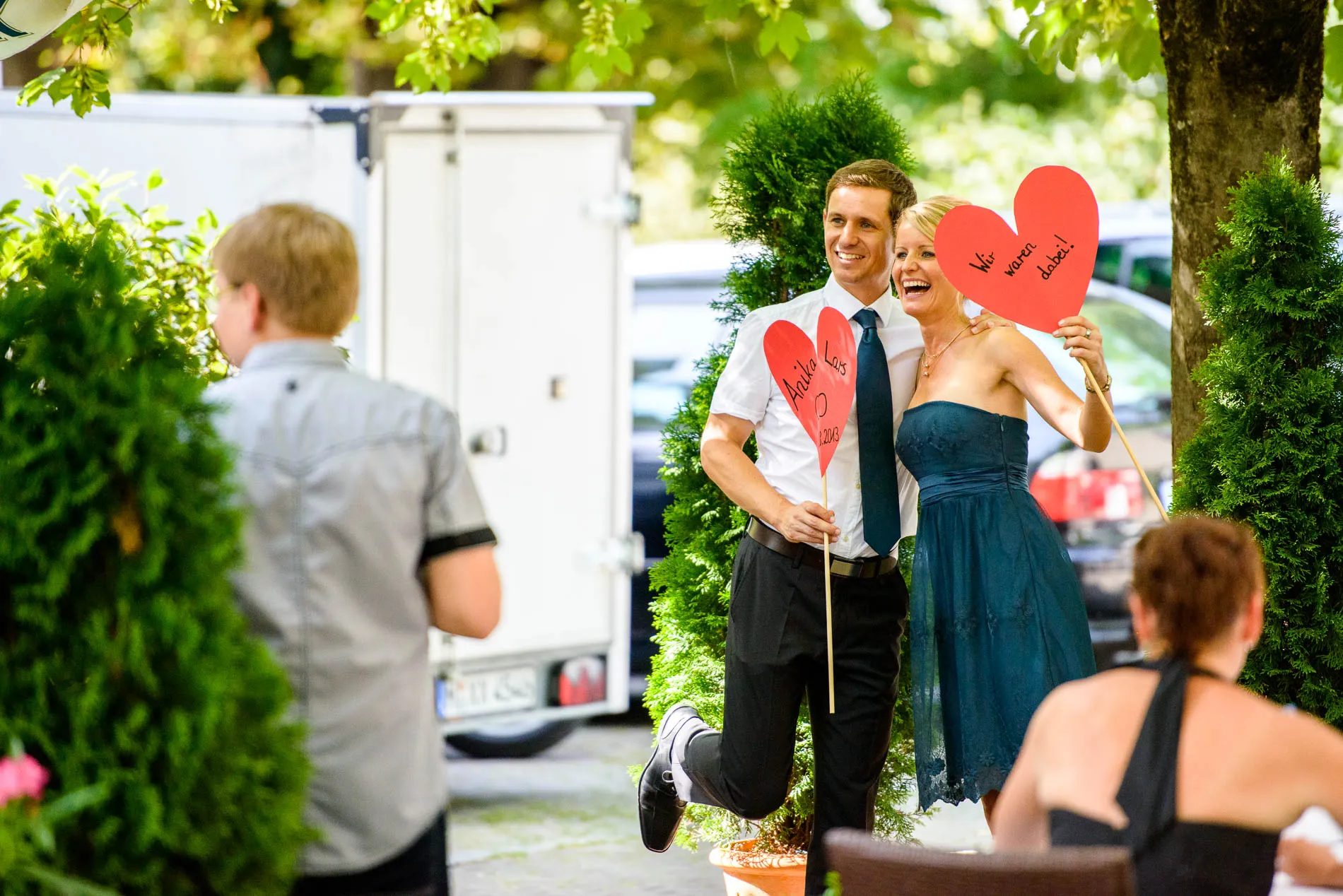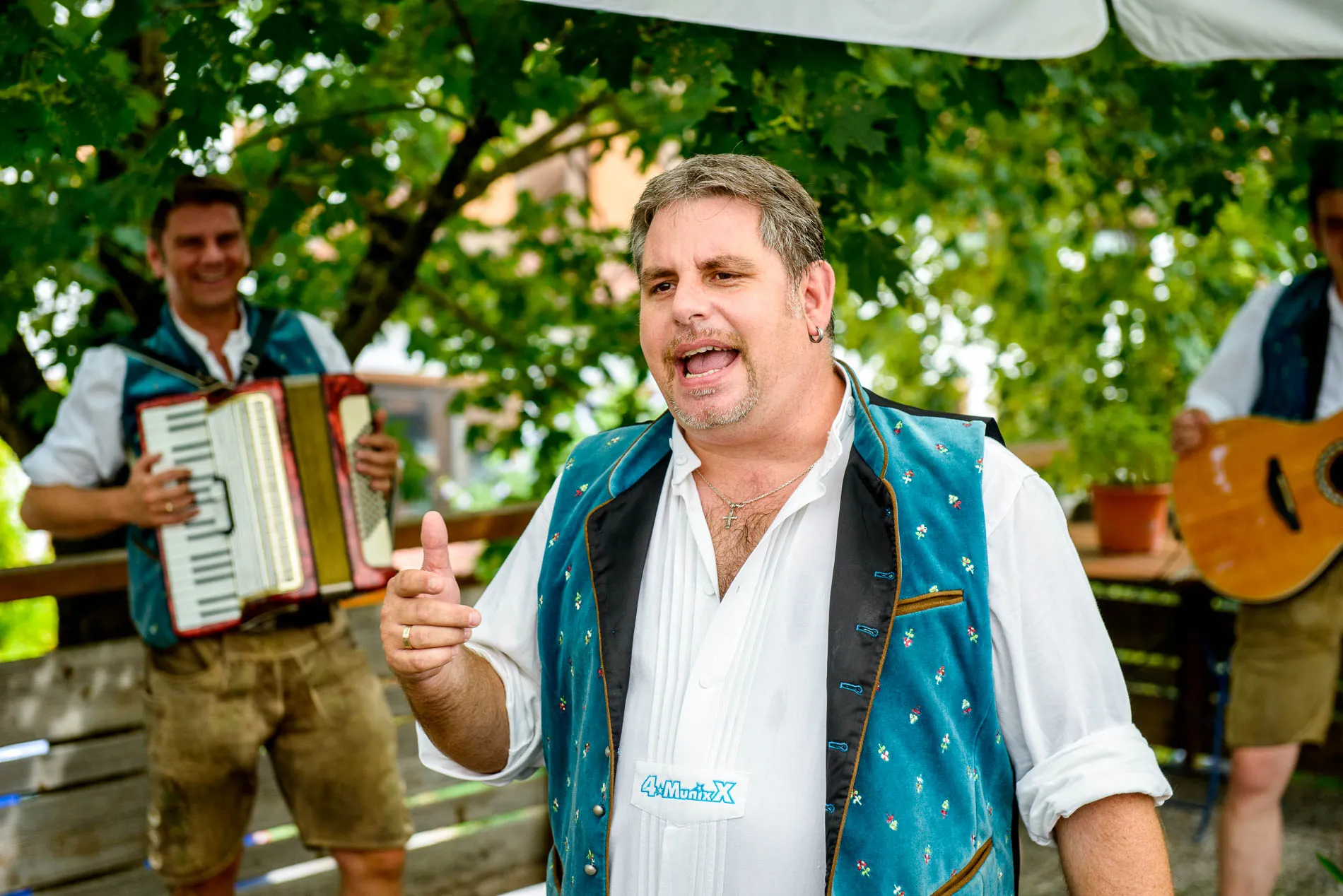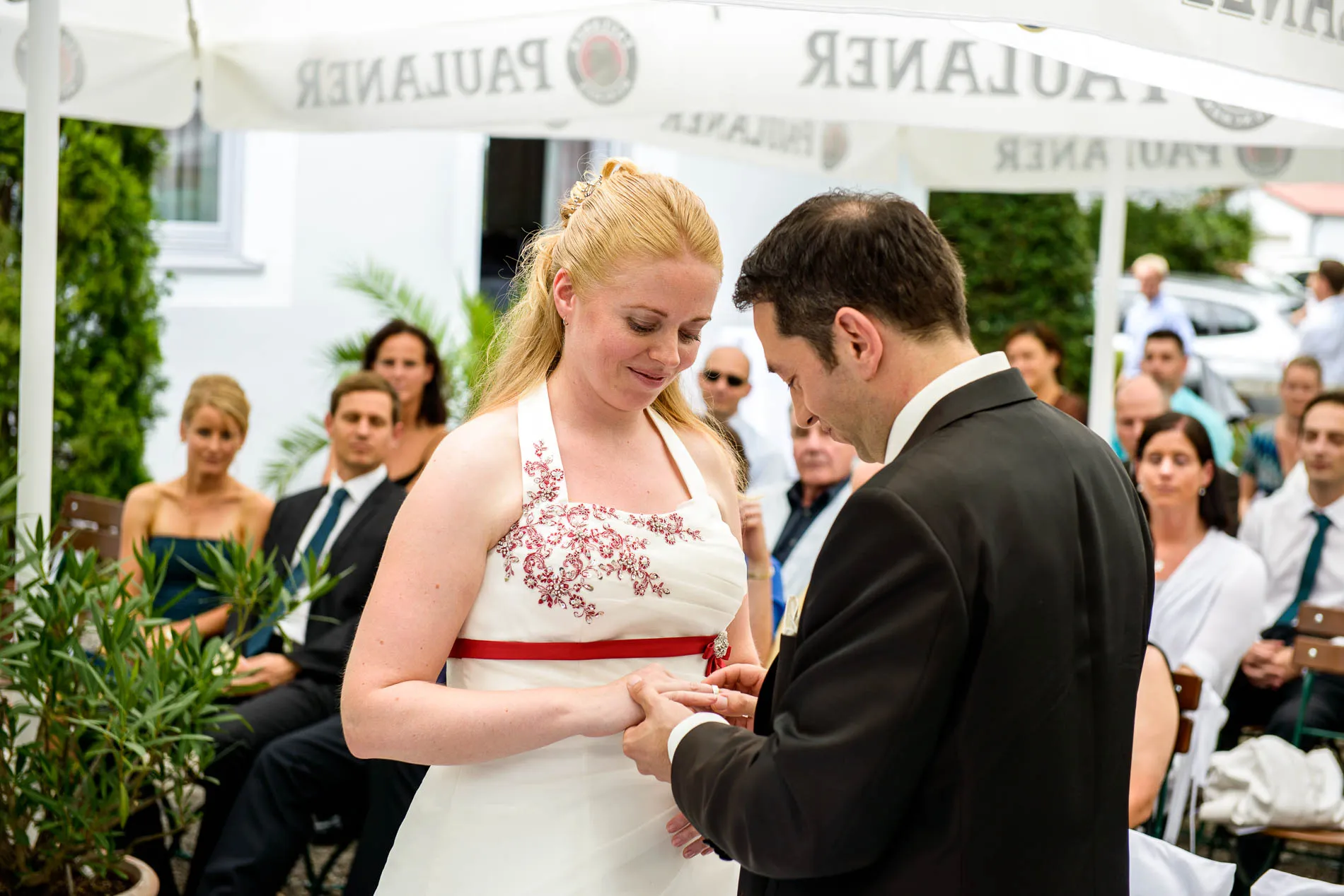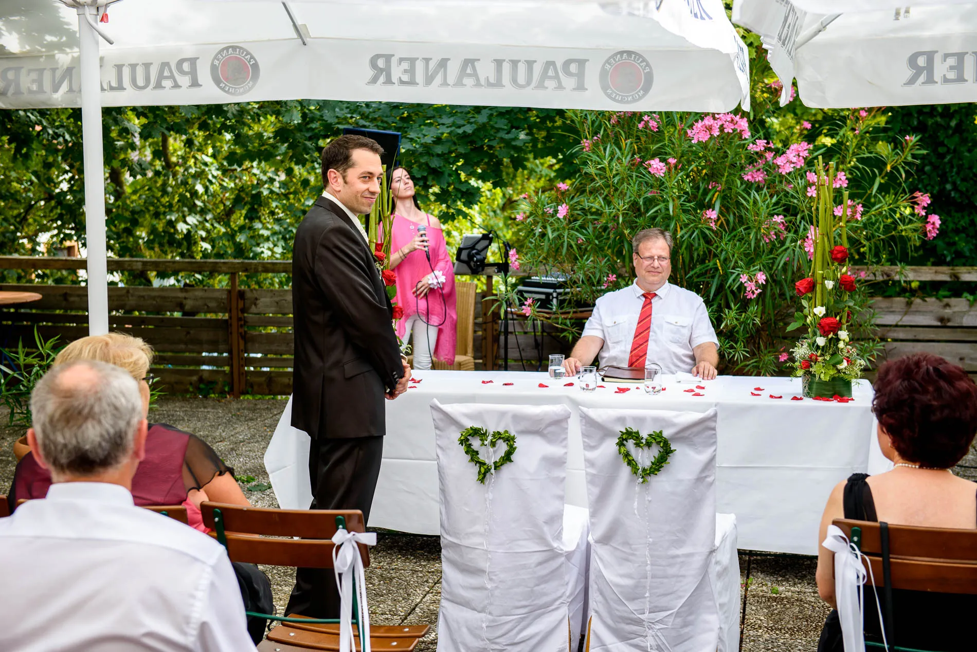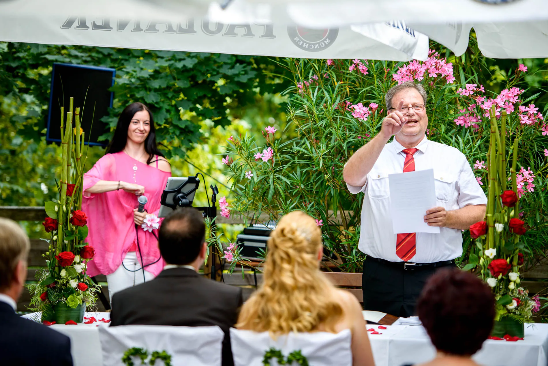 An einem Augusttag, der meteorologisch eher Richtung „Grillfest“ tendierte, durfte ich als Hochzeitsfotograf in Röhrmoos bei Dachau eine freie Trauung begleiten. Glücklicherweise bot die Terrasse des Gasthofs ausreichend Schatten, sodass weder Braut noch Gäste Gefahr liefen, schon vor dem Ja‑Wort zu schmelzen. Musikalisch untermalt wurde die Zeremonie von Sängerin Conny, die mit ihrer Stimme selbst die Sonne kurz innehalten ließ.