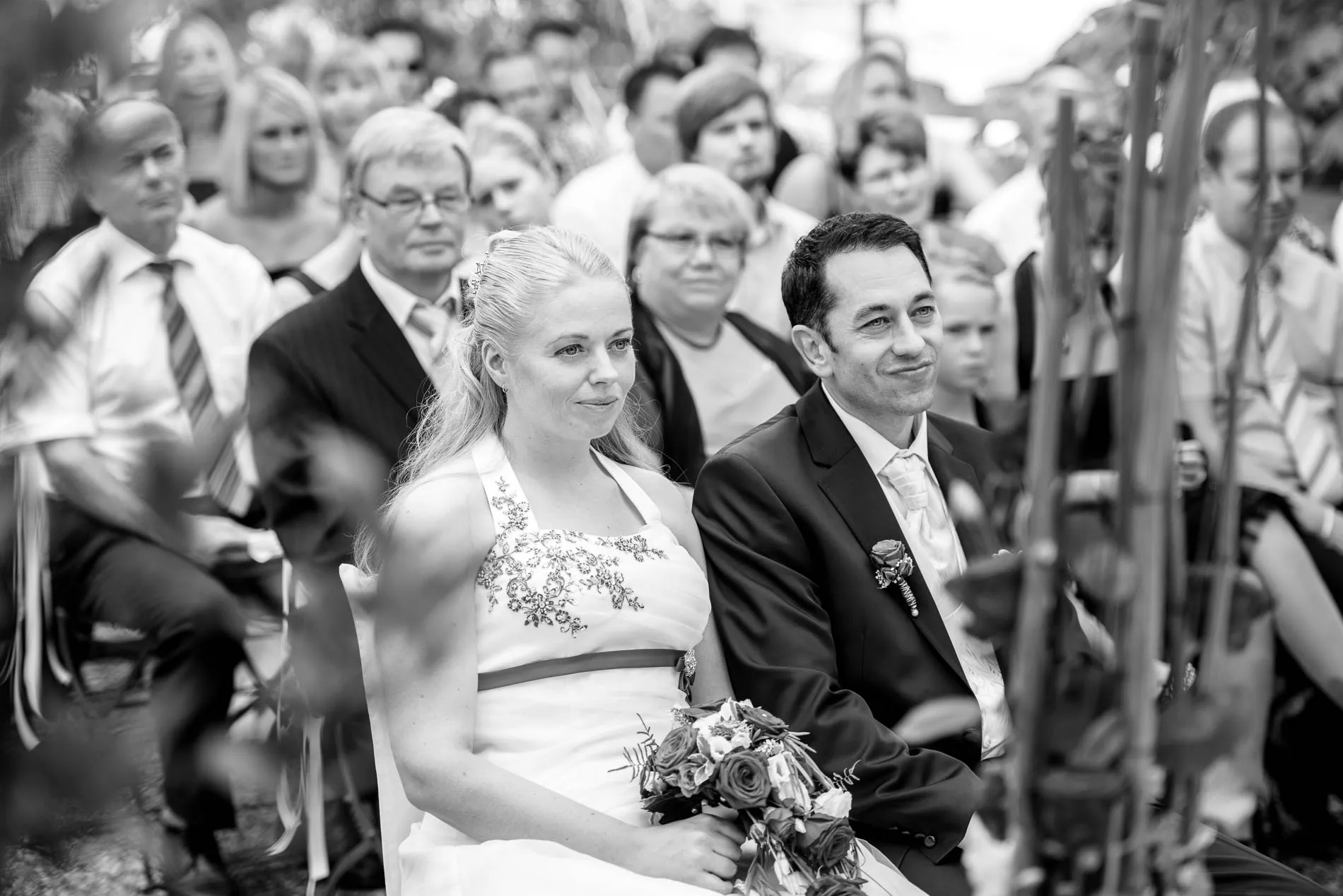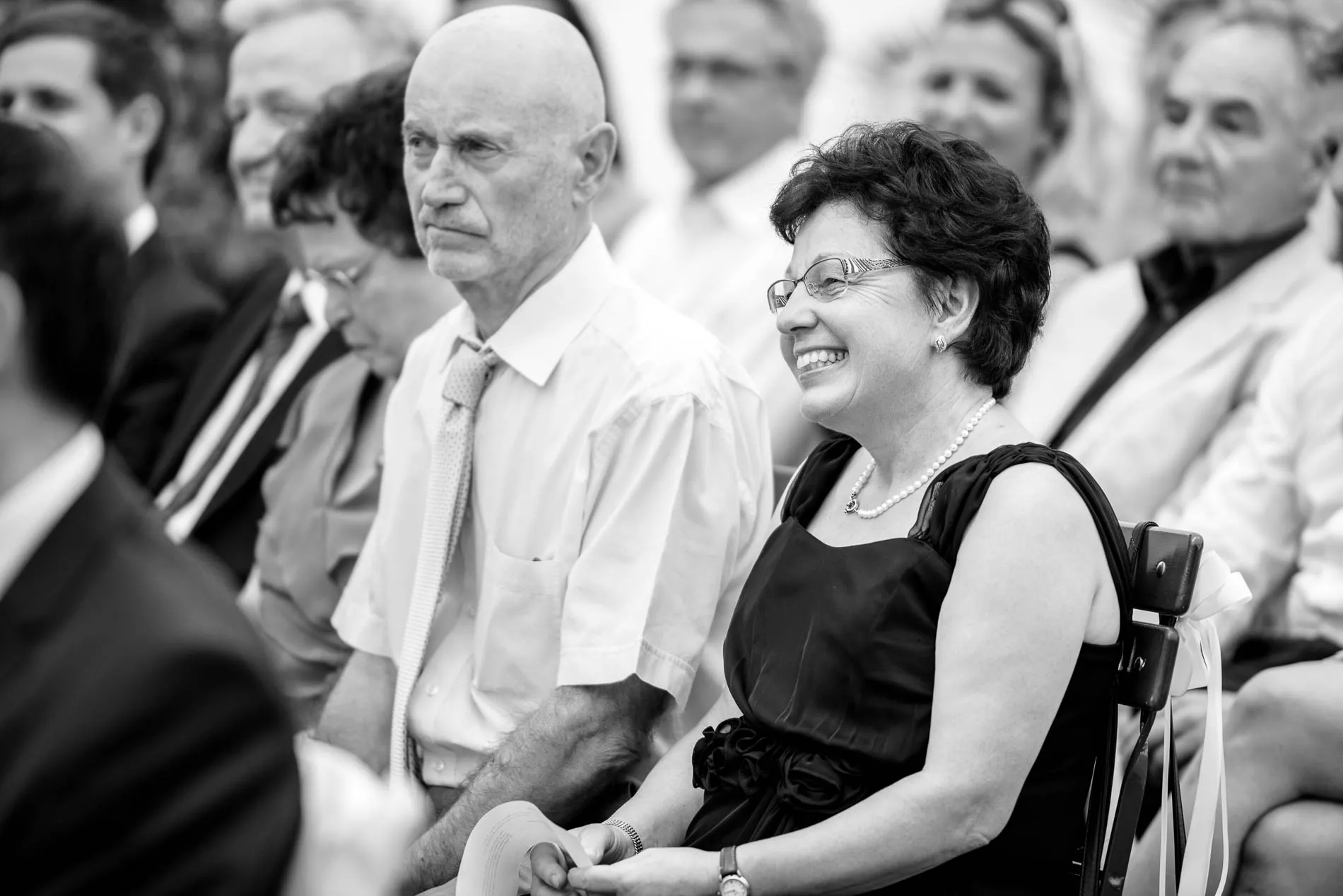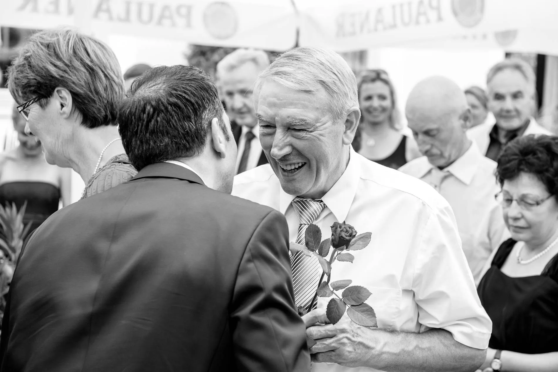 Ein Detail, das man bei freien Trauungen nicht alle Tage sieht: Die Braut wurde von ihrem Vater zum Platz geführt. Bei kirchlichen Trauungen ist das ja fast schon Standardprogramm – dort gehört es zum guten Ton wie das Amen in der Kirche. Hier jedoch wirkte es wie eine charmante Überraschung, die den Gästen kurz das Gefühl gab, sie hätten eine besonders exklusive Variante der Zeremonie gebucht. Für mich als Fotograf war es jedenfalls ein Geschenk: ein klassischer Moment, der gleichzeitig ein wenig aus dem Rahmen fiel – und genau solche Szenen machen eine Reportage lebendig.