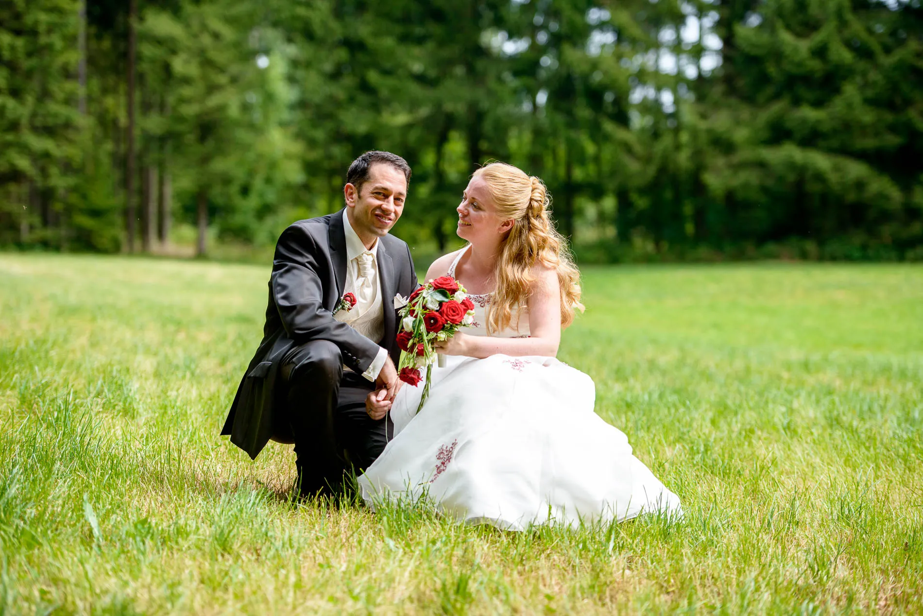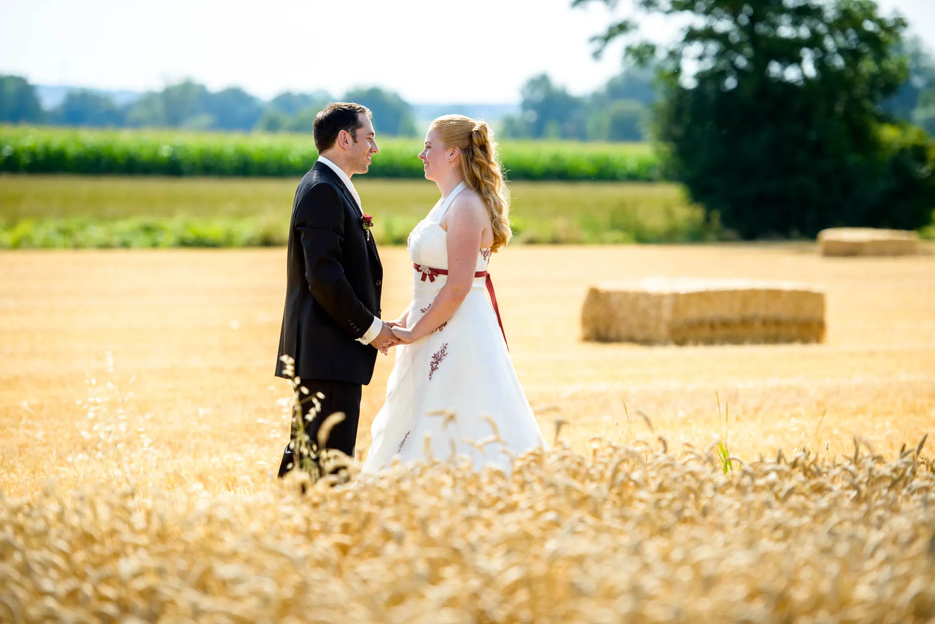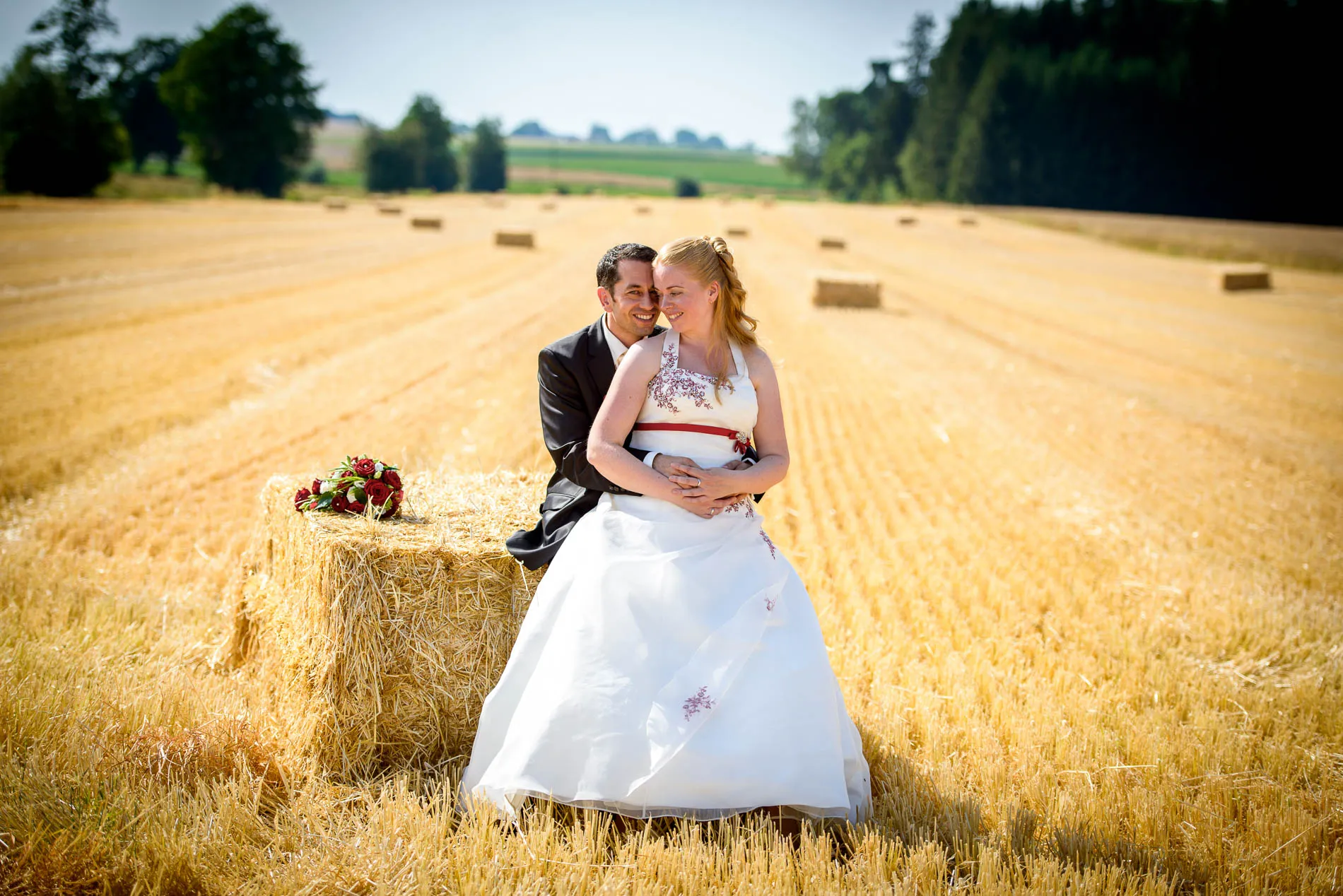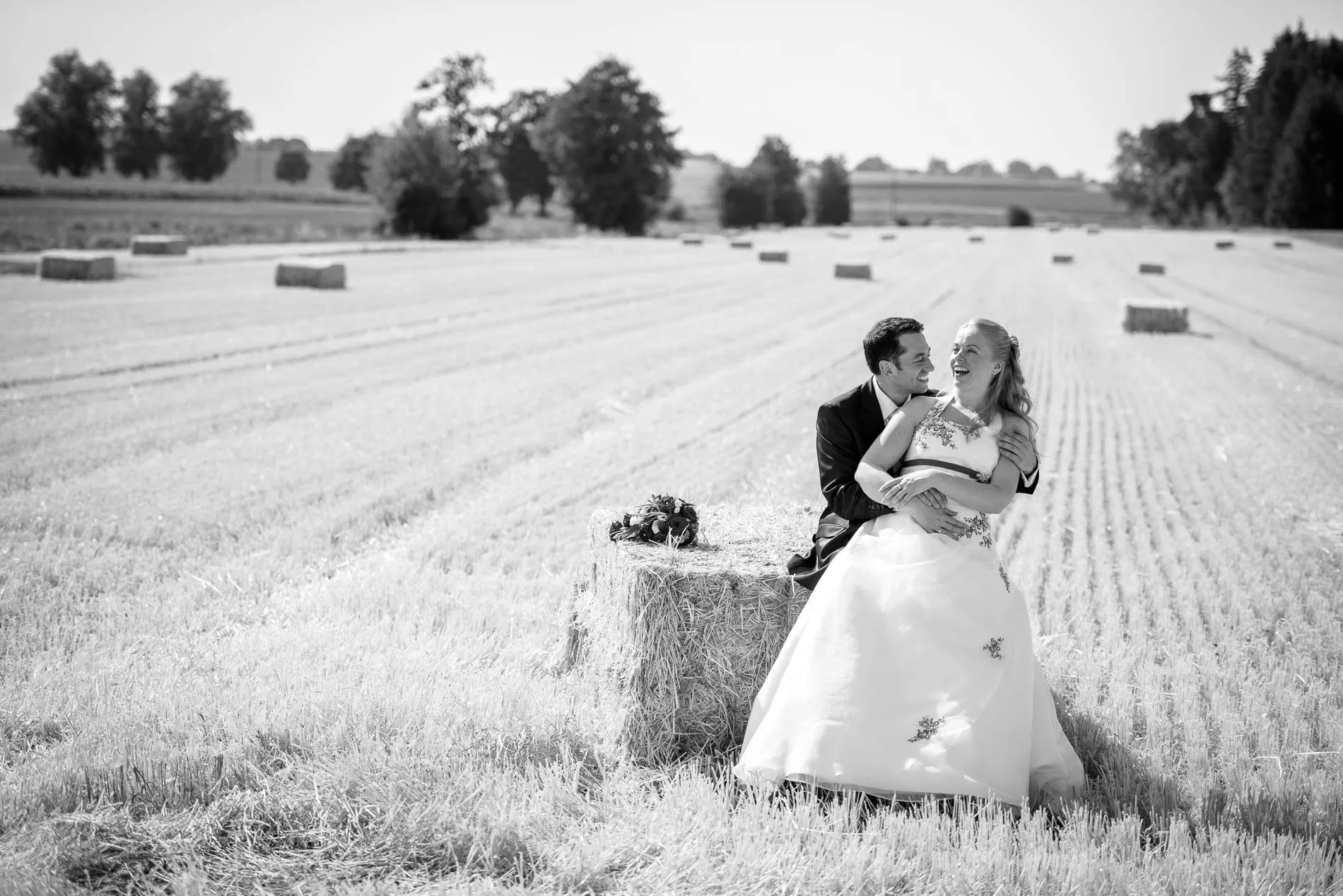 Gruppenfotos und Familienbilder entstanden direkt im Garten – praktisch, weil die Gäste nicht lange suchen mussten und die Stimmung locker blieb. Für das Brautpaarshooting wagten wir uns ins Umland: grüne Wiesen, ein paar Heuballen und viel Bewegung. Ich gebe bei solchen Shootings gerne kleine Hinweise, damit die Posen natürlich wirken – und wenn dabei ein Heuballen zur improvisierten Bühne wird, beschwert sich niemand.
