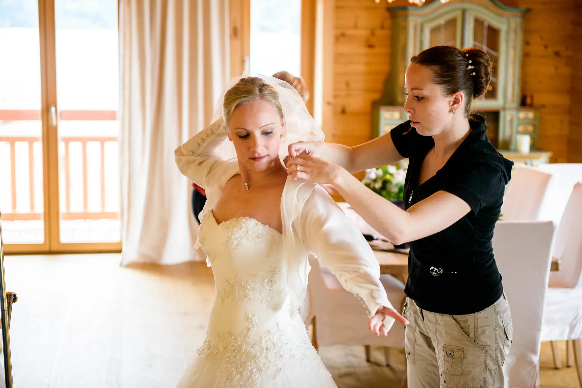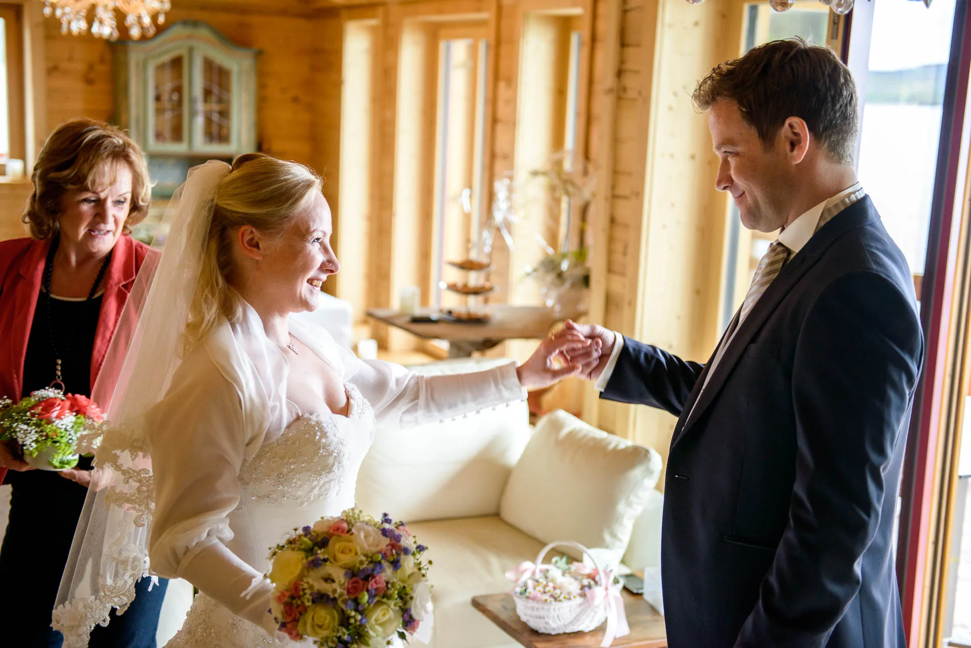 Gestartet haben wir in einer Ferienwohnung oberhalb des Café Kreutzkamm. Von dort aus eröffnet sich ein Blick über den Tegernsee, der fast schon kitschig schön ist – wenn er nicht so echt wäre. Während die Brautmutter und eine Freundin letzte Hand an Kleid und Frisur legten, konnte ich die konzentrierte Ruhe vor dem großen Moment festhalten. Der Bräutigam schaute ebenfalls vorbei und war sichtlich hingerissen. Man könnte sagen: Er sah seine Braut – und vergaß für einen Augenblick, dass er eigentlich noch einen ganzen Tag Programm vor sich hatte.