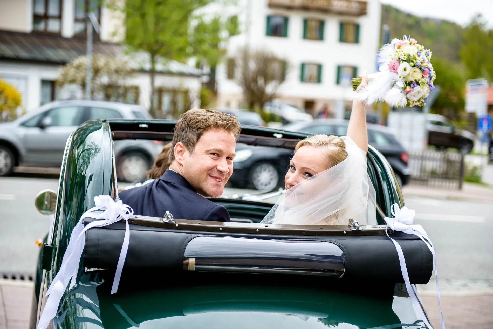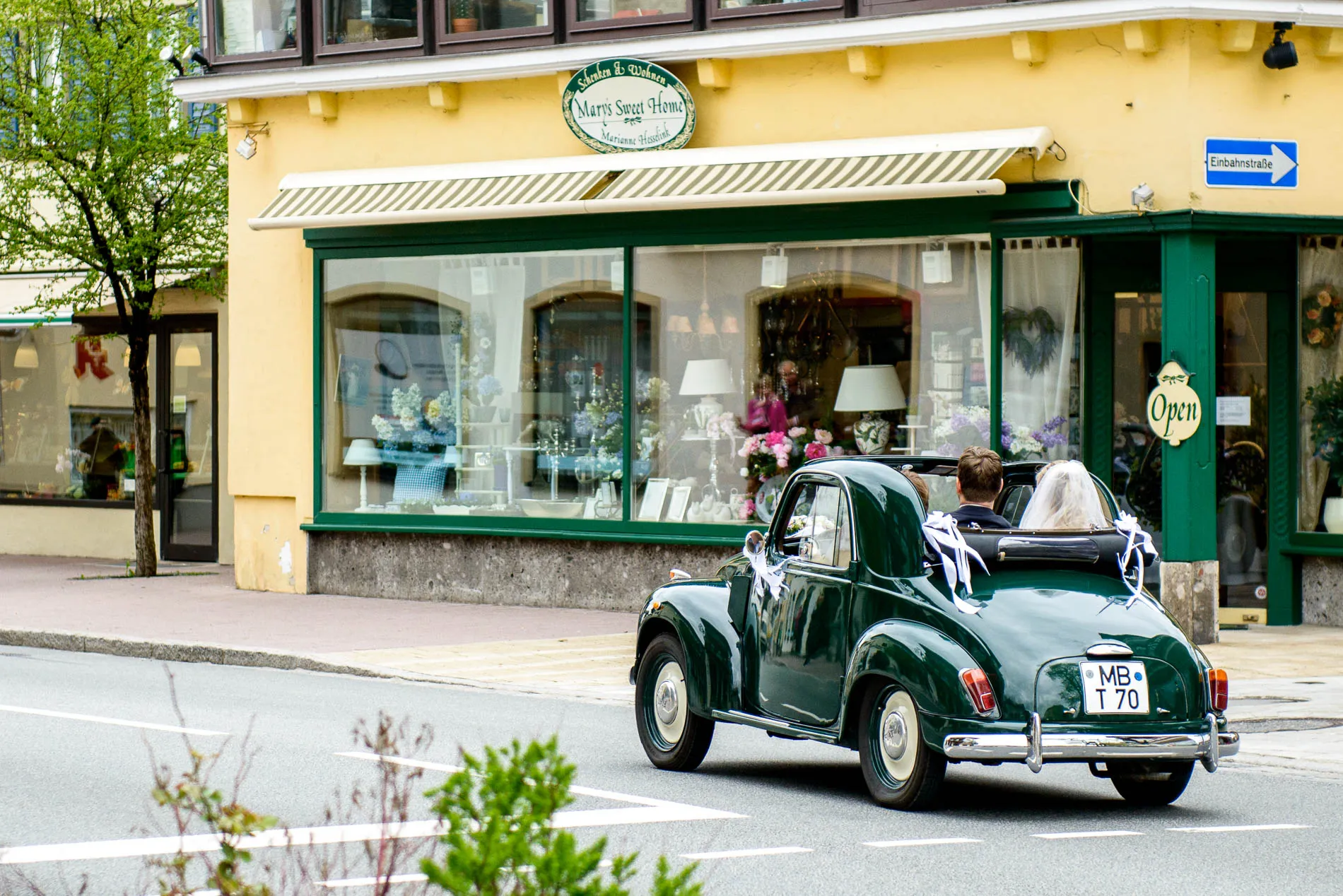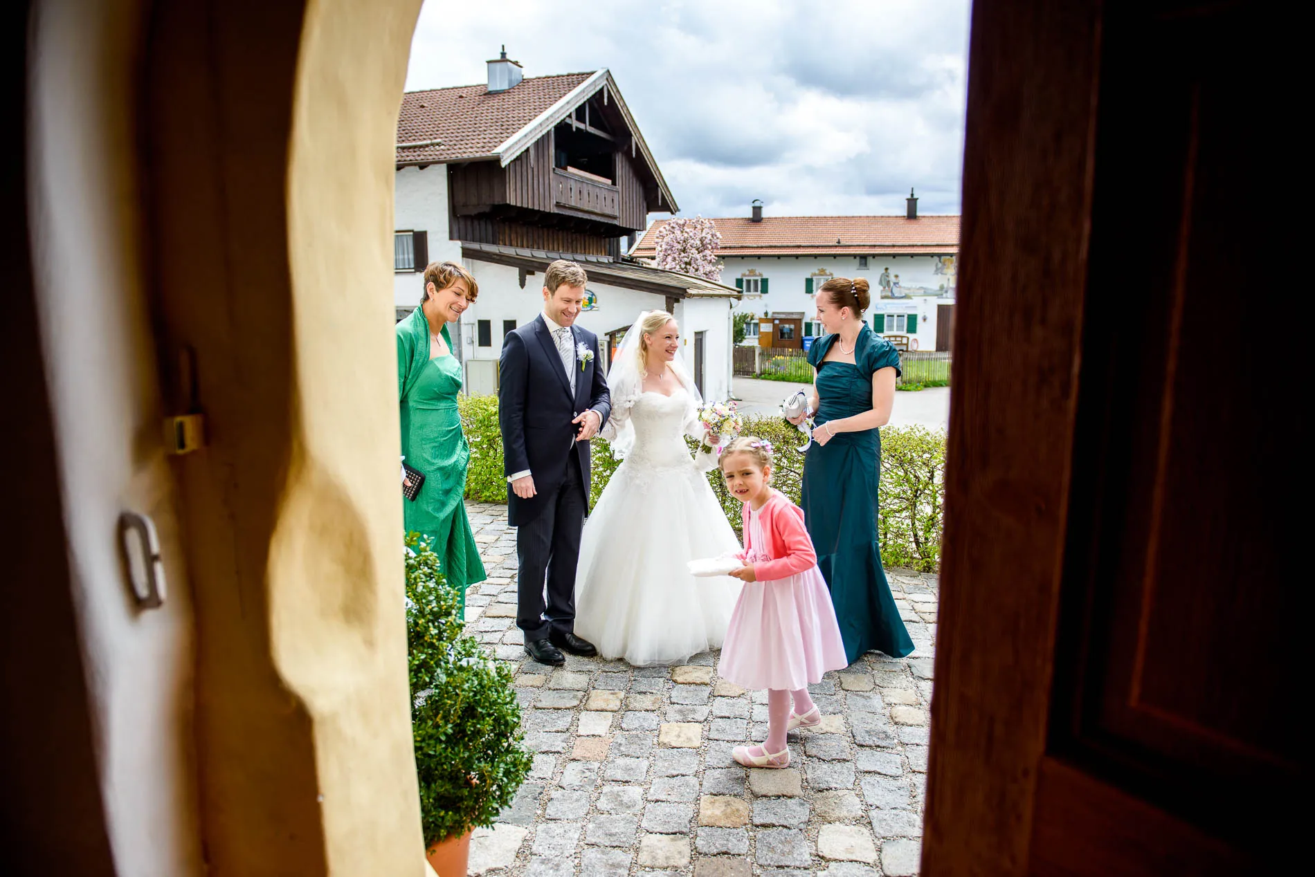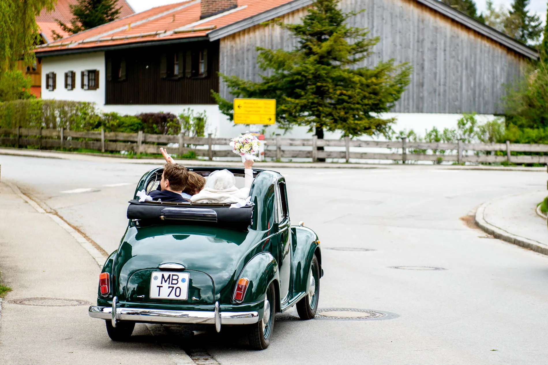 Ankunft in Schaftlach – die kleinste Hochzeitskutsche auf vier Rädern