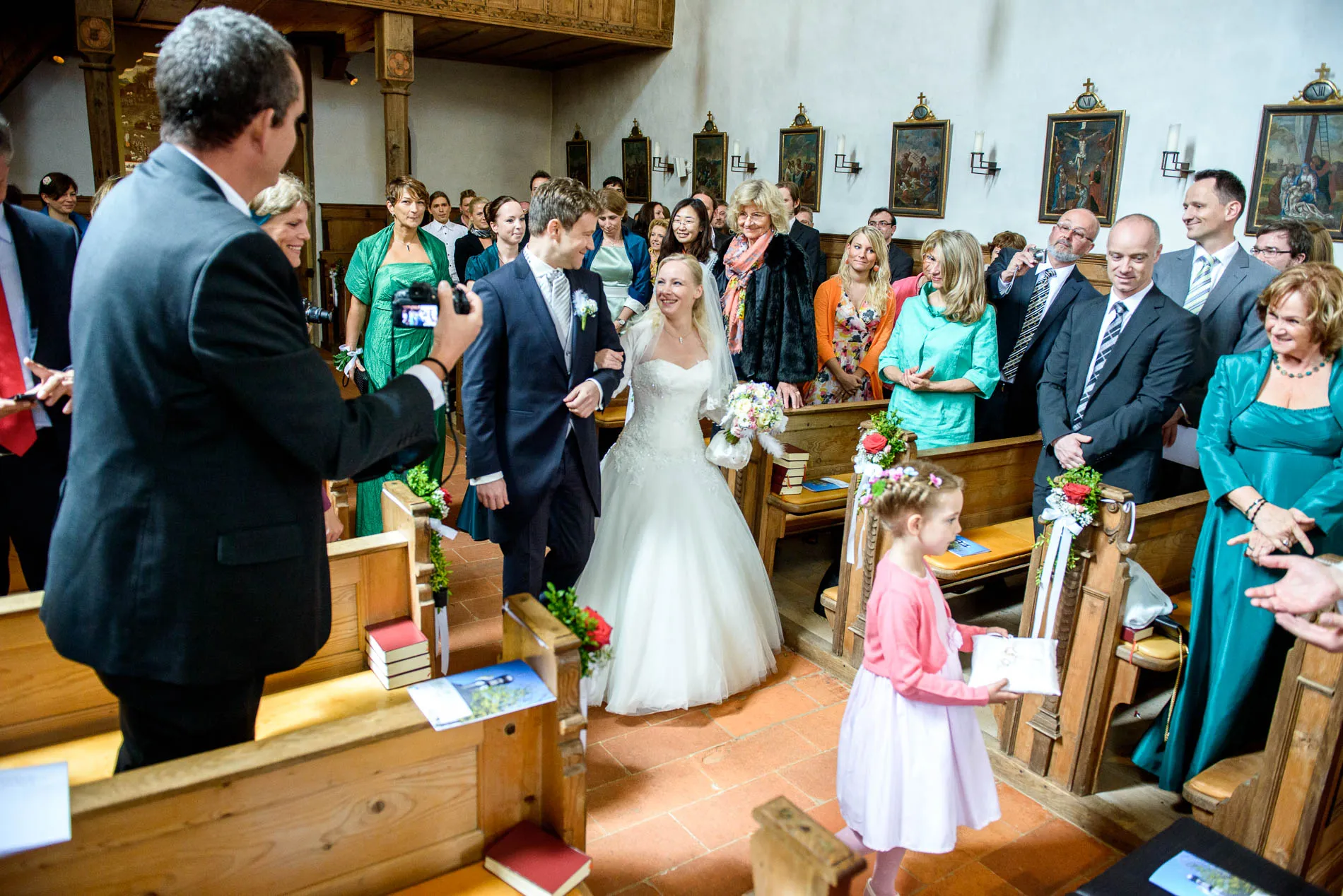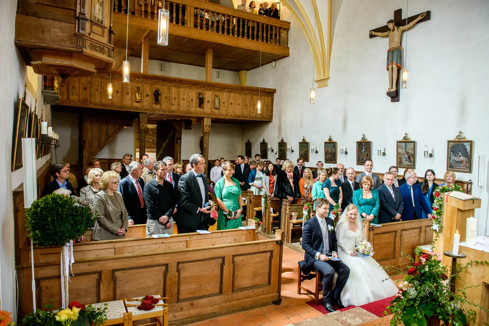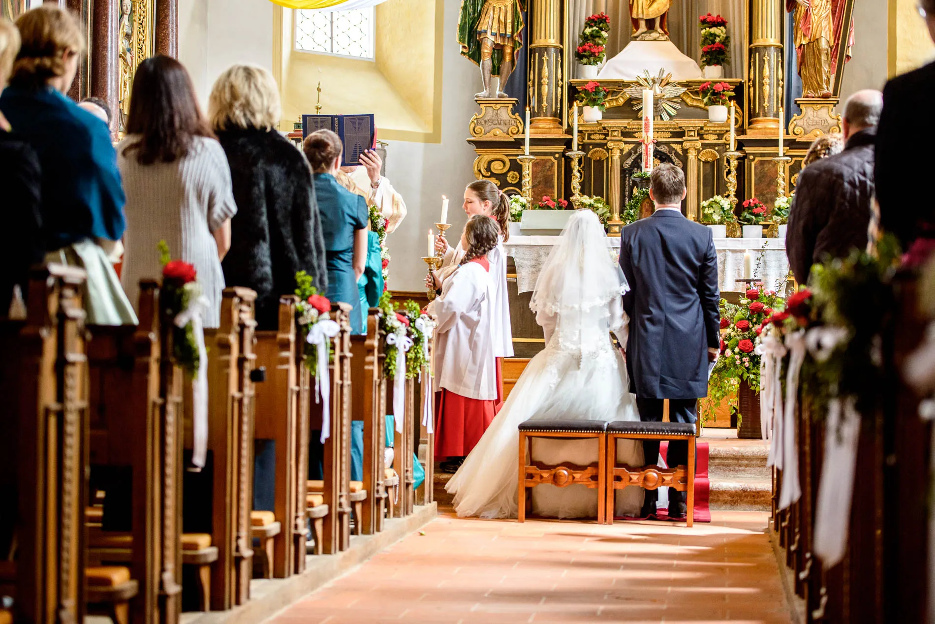 Weiter ging es mit dem wohl kleinsten Brautauto, das mir als Hochzeitsfotograf je begegnet ist. In Schaftlach wartete die Heilig Kreuz Kirche – hell, klassisch und mit einer Architektur, die das Licht wunderbar einfing. Das Brautpaar entschied sich, gemeinsam einzuziehen. Nach dem Shooting vorher wäre ein getrennter Einzug ohnehin eher Theaterprobe als Realität gewesen – und die Gäste nahmen es mit einem Schmunzeln hin.