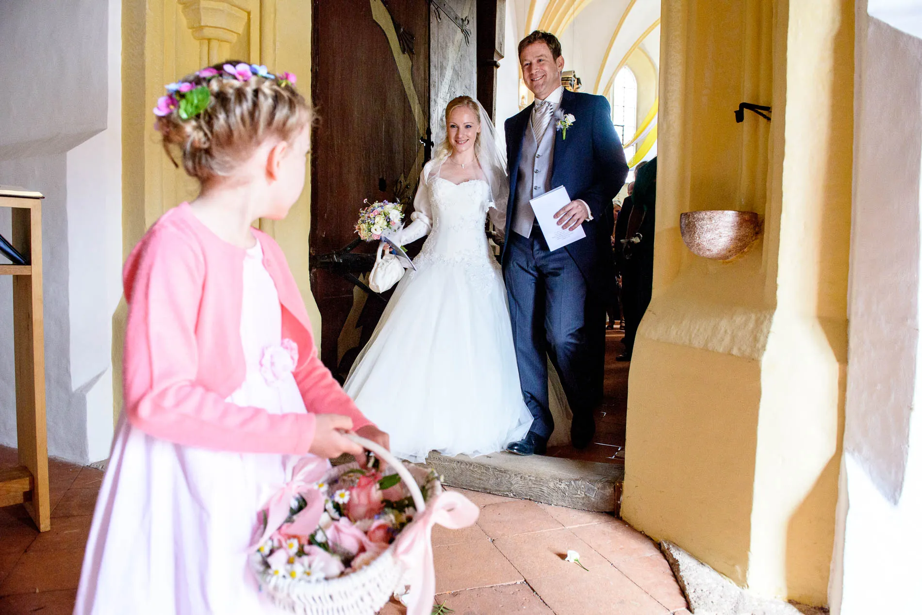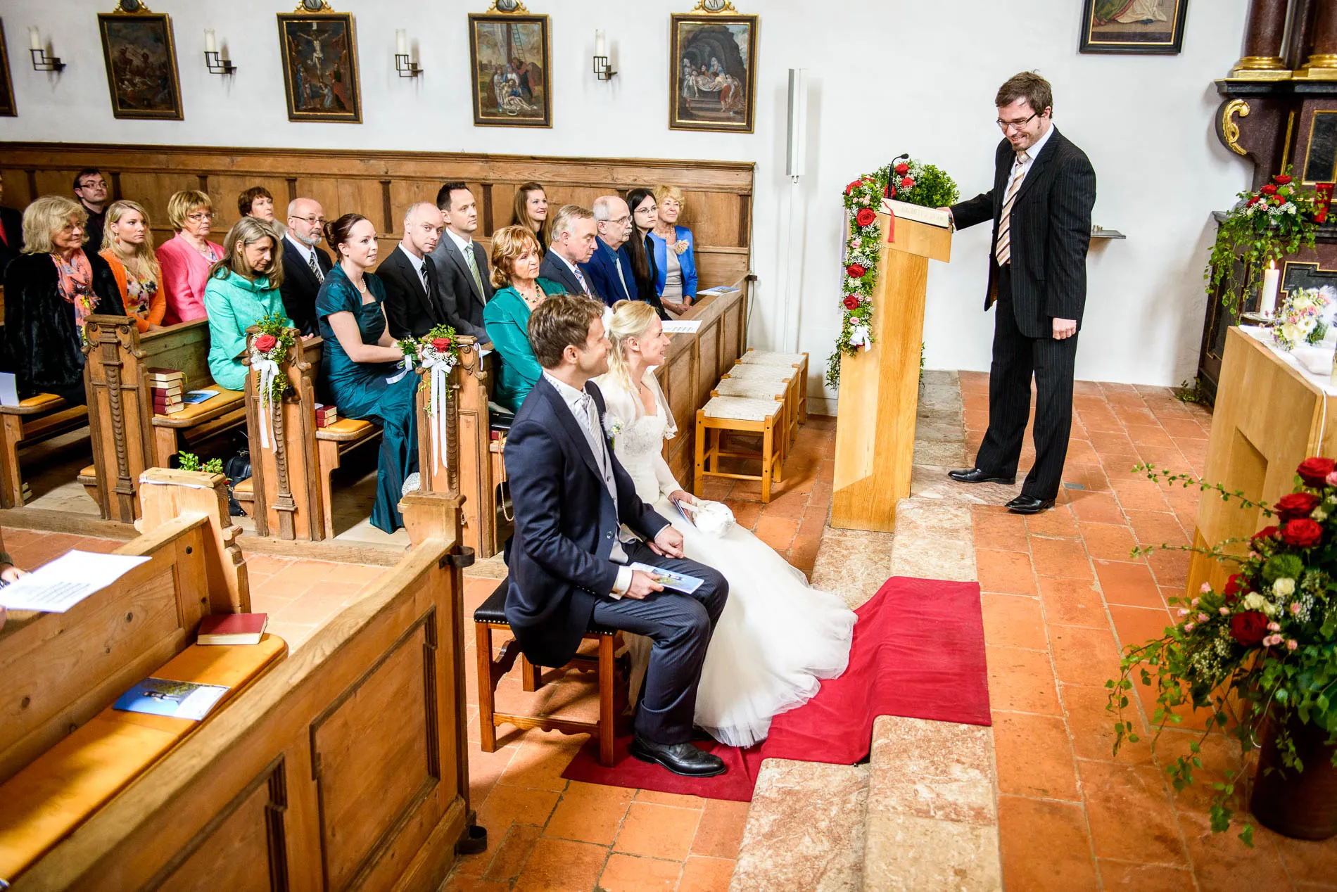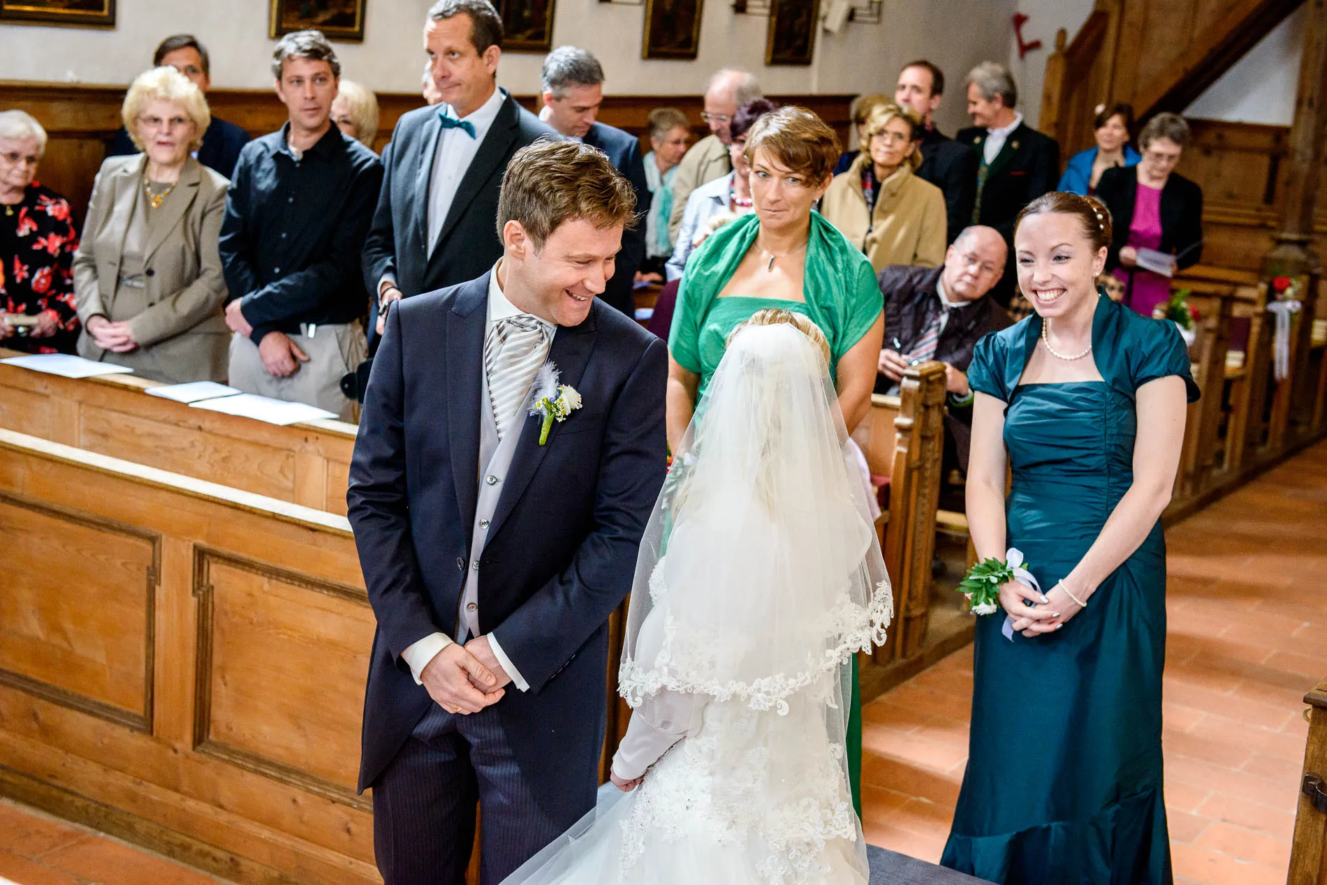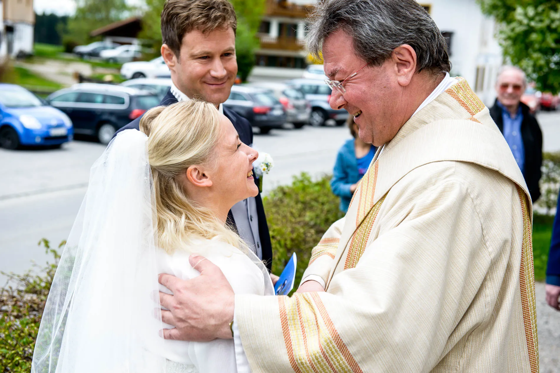 Weiter ging es mit dem wohl kleinsten Brautauto, das mir als Hochzeitsfotograf je begegnet ist. In Schaftlach wartete die Heilig Kreuz Kirche – hell, klassisch und mit einer Architektur, die das Licht wunderbar einfing. Das Brautpaar entschied sich, gemeinsam einzuziehen. Nach dem Shooting vorher wäre ein getrennter Einzug ohnehin eher Theaterprobe als Realität gewesen – und die Gäste nahmen es mit einem Schmunzeln hin.