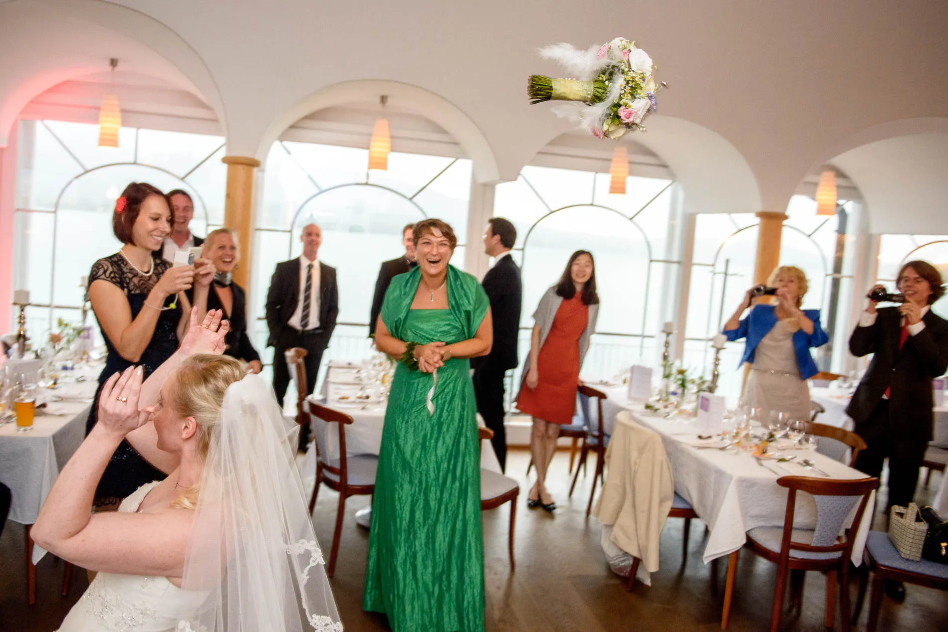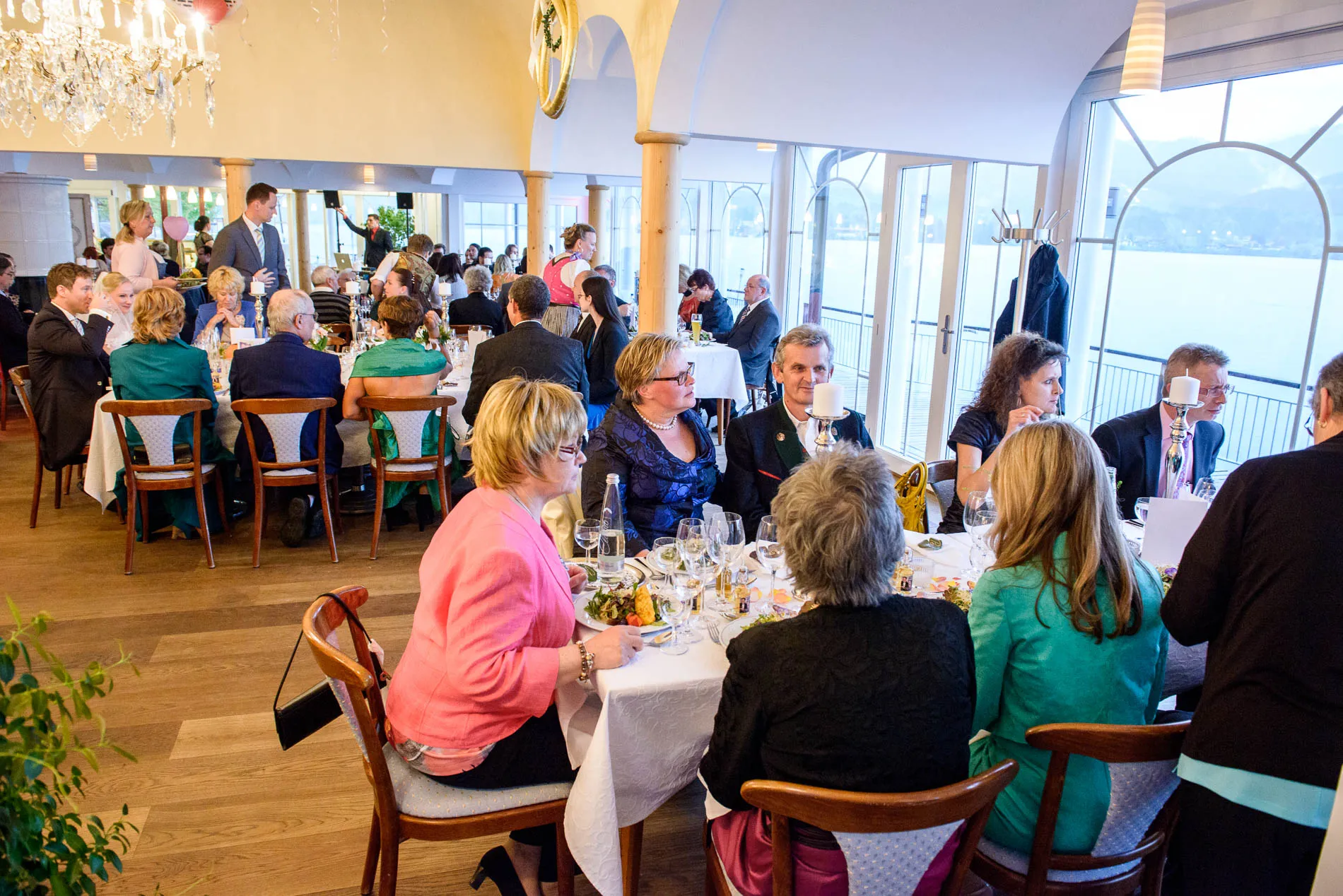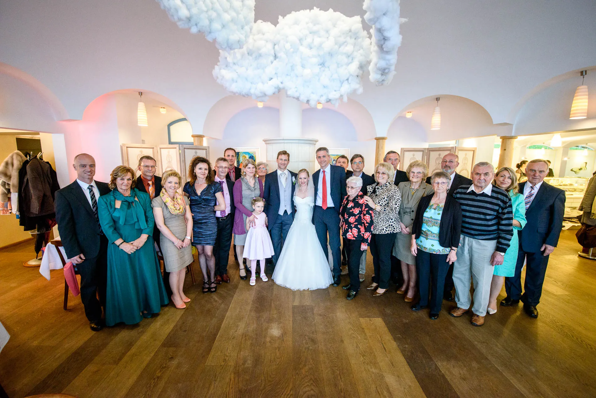 Als später ein kurzer Schauer einsetzte, verlegten wir das Gruppenfoto kurzerhand in den Saal. Dank Weitwinkelobjektiv passte die gesamte Gesellschaft ins Bild – und niemand musste im Regen stehen. Manchmal sind es gerade diese spontanen Anpassungen, die den Tag besonders machen. Und ehrlich gesagt: Ein Gruppenfoto im Trockenen hat auch seine Vorteile – niemand schaut verkniffen, weil ihm Regentropfen ins Auge laufen.