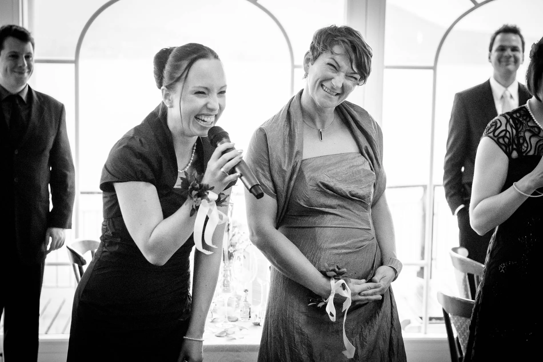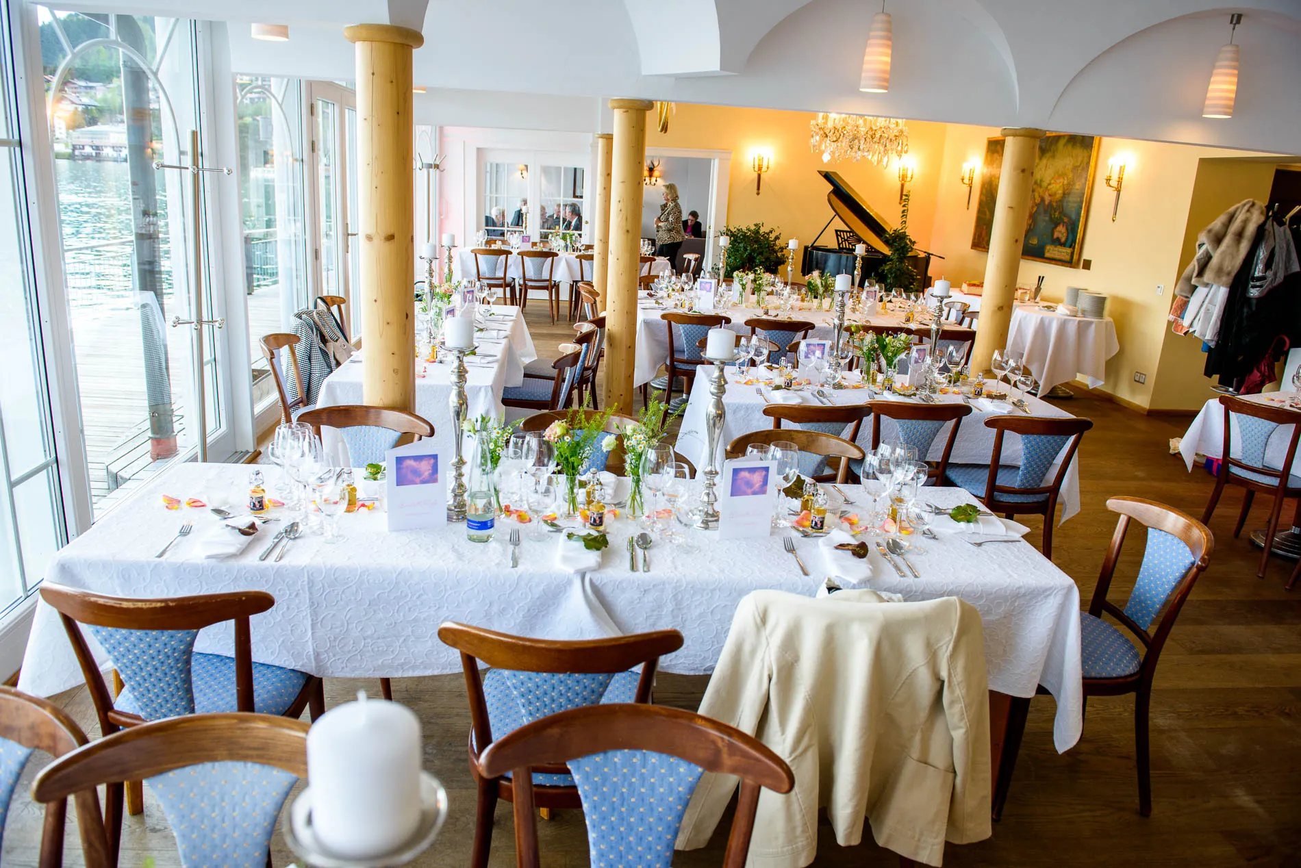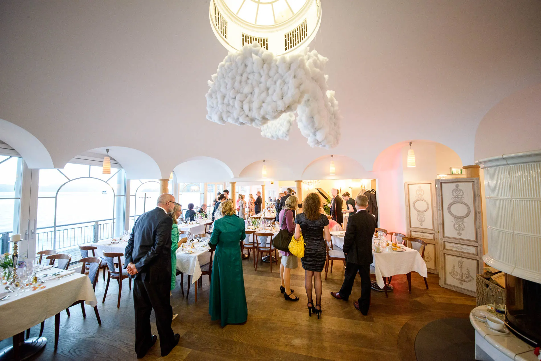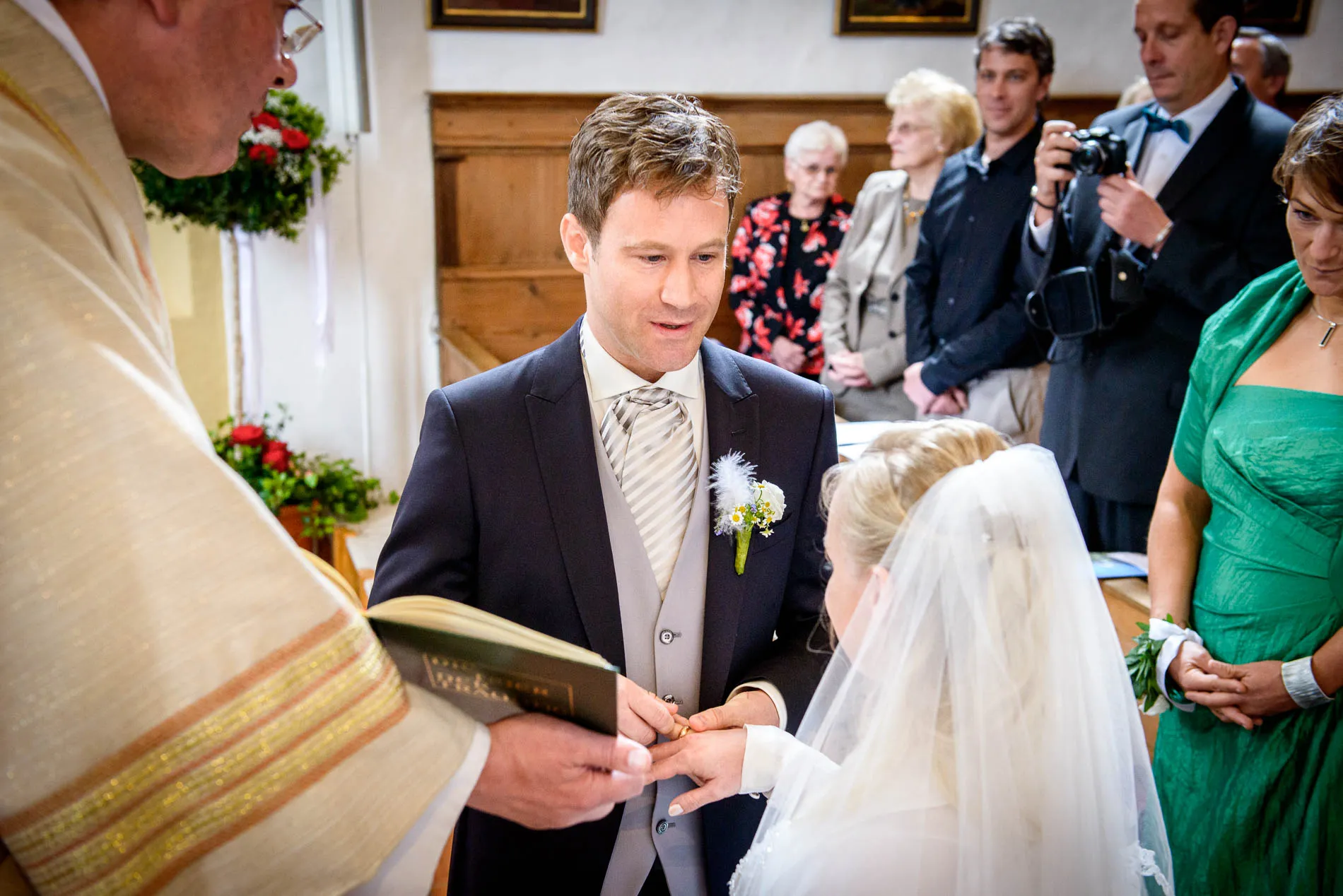 Als später ein kurzer Schauer einsetzte, verlegten wir das Gruppenfoto kurzerhand in den Saal. Dank Weitwinkelobjektiv passte die gesamte Gesellschaft ins Bild – und niemand musste im Regen stehen. Manchmal sind es gerade diese spontanen Anpassungen, die den Tag besonders machen. Und ehrlich gesagt: Ein Gruppenfoto im Trockenen hat auch seine Vorteile – niemand schaut verkniffen, weil ihm Regentropfen ins Auge laufen.